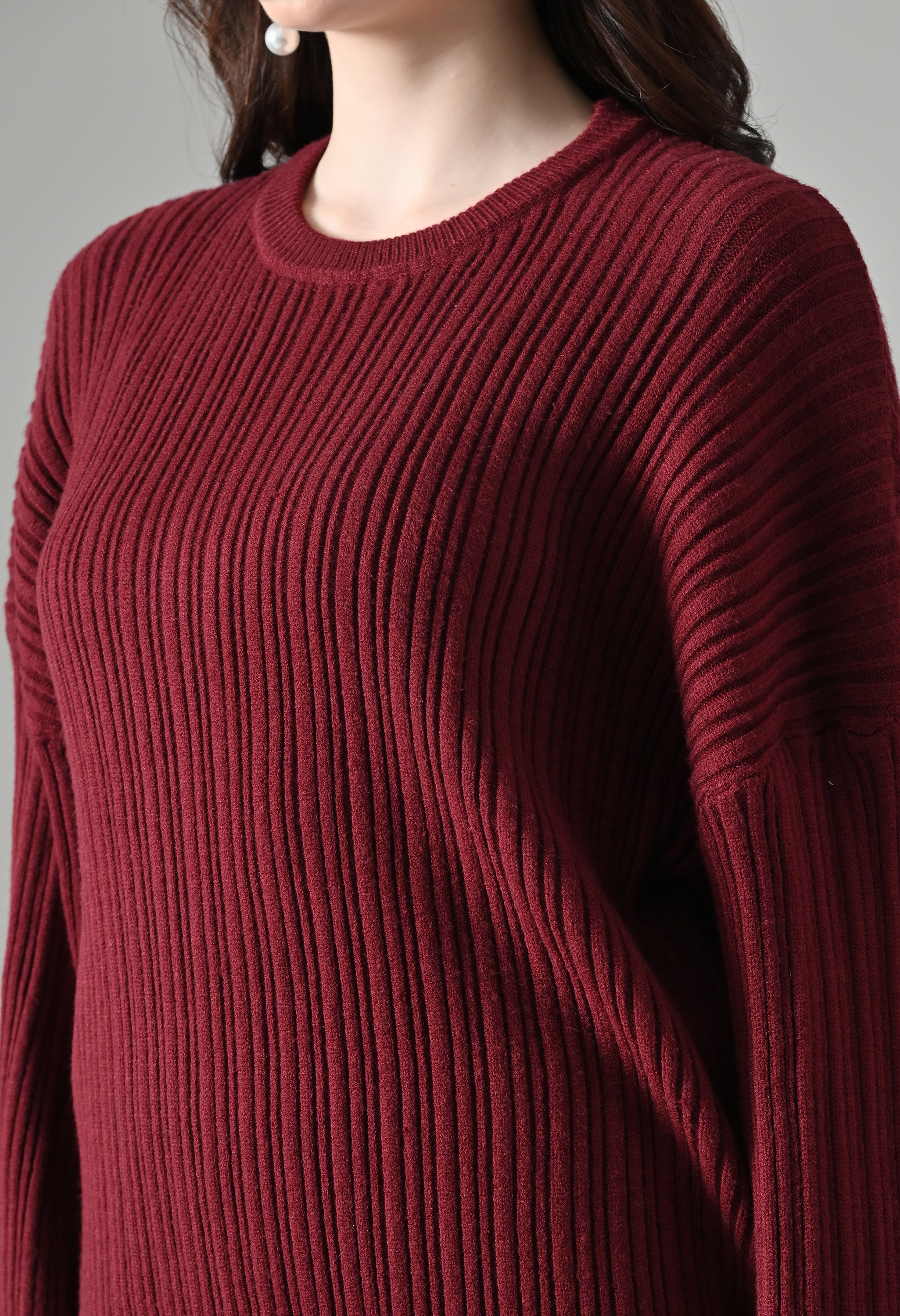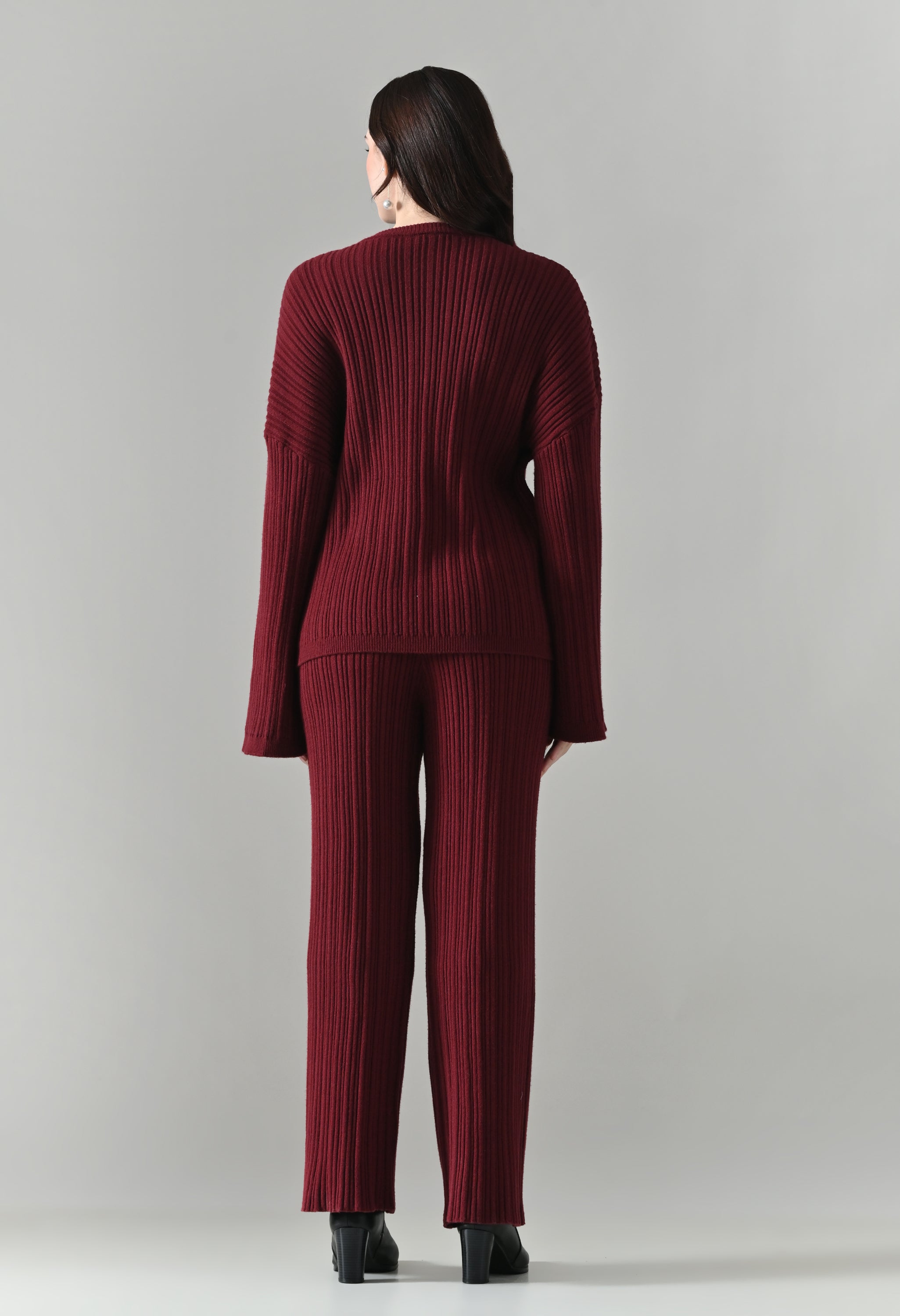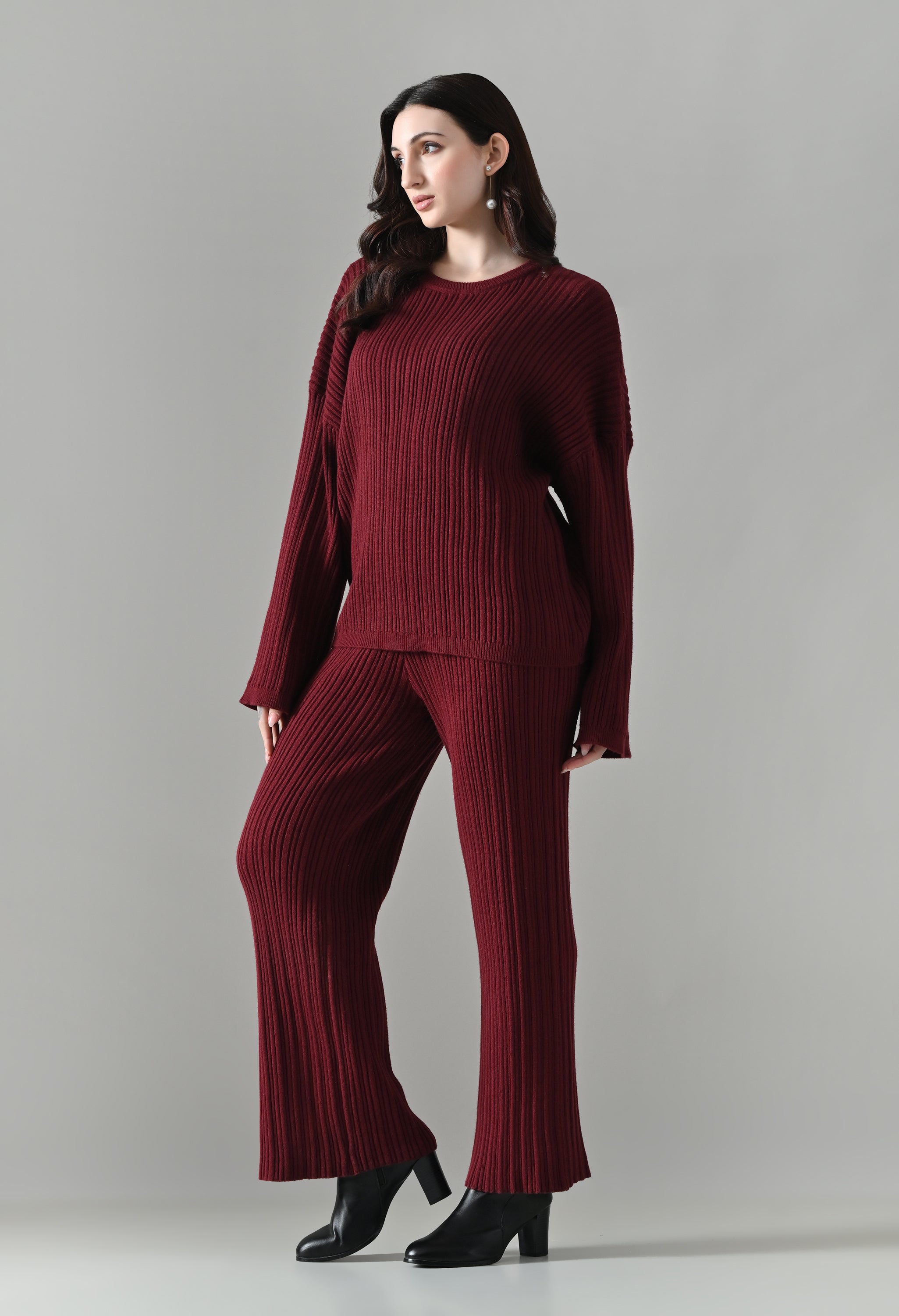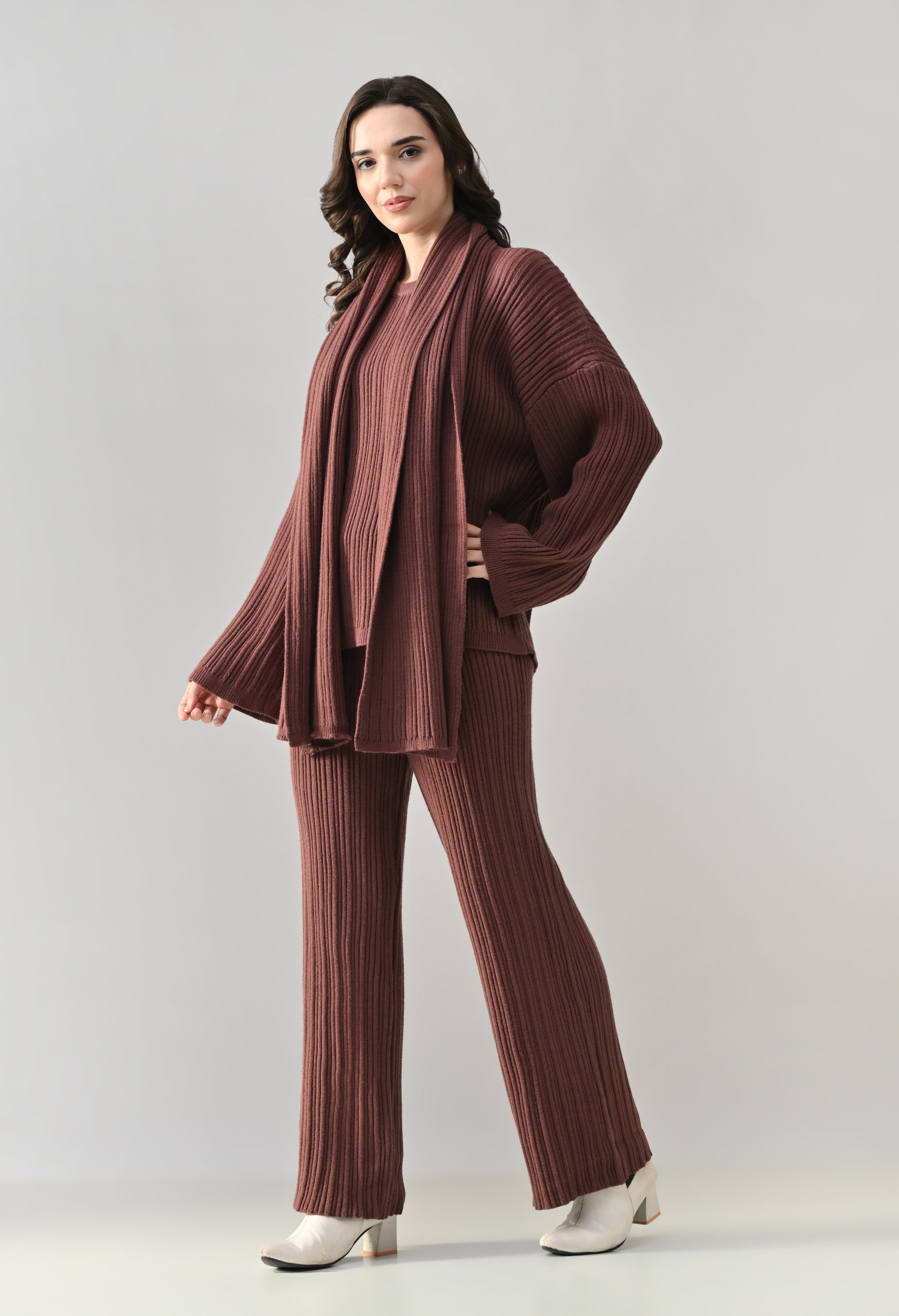 This cozy three-piece knit set includes a matching top, bottom, and muffler, designed for effortless winter comfort with a coordinated look. Crafted from a soft ribbed knit fabric, the set features a relaxed-fit top with a classic round neckline and three-quarter–length sleeves for easy, everyday wear. The matching bottoms are designed in a straight, comfortable silhouette with a clean finish, offering warmth without compromising on style. Completing the set is a coordinating ribbed muffler that adds extra coziness and a layered winter appeal. The rich solid tone enhances its versatile, lounge-to-outdoor styling potential, making it ideal for casual outings, travel, or relaxed winter days.