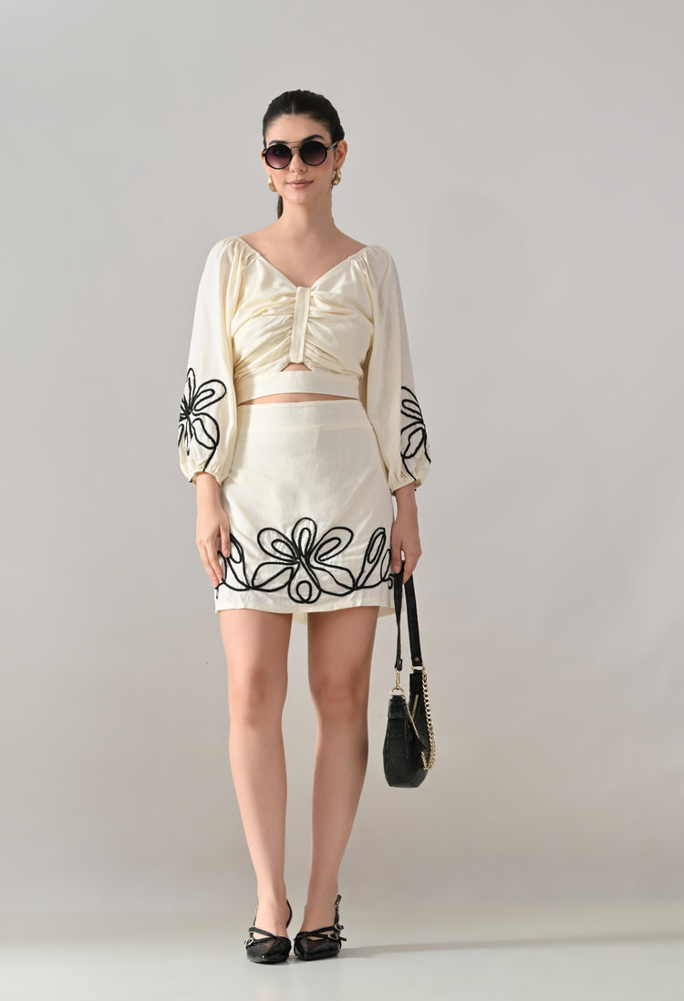 Effortlessly chic, this two-piece set features a ruched crop top with voluminous sleeves adorned with intricate black floral embroidery. The matching mini skirt mirrors the embroidery detail, creating a coordinated look perfect for brunch dates, vacations, or summer outings. Crafted from breathable fabric for all-day comfort and style.