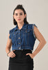 A stylish enzyme-wash denim vest jacket featuring a regular collar band and sleeveless design for a relaxed, chic look. The open front is detailed with brass shank buttons with eye kaaj, while two front pockets with flaps add a functional touch. Fray Sleeveless at the armholes lend a playful, boho vibe, complemented by a regular hem. Crafted from soft, comfortable, and breezy fabric, this vest jacket is non-stretchable, making it perfect for layering over casual outfits.