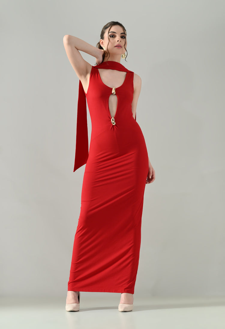 Elevate your evening look with the Golden Grace Maxi Dress, a full-length maxi crafted to turn heads. Featuring a flattering U-neckline at the front and back, this sleeveless piece with broad straps is defined by its bold keyhole design and elegant golden button accents. The detachable stole allows versatile styling, while the fitted straight silhouette ensures a sleek finish. Made from soft, stretchable fabric, it blends sophistication with all-day comfort—perfect for timeless, graceful statements.