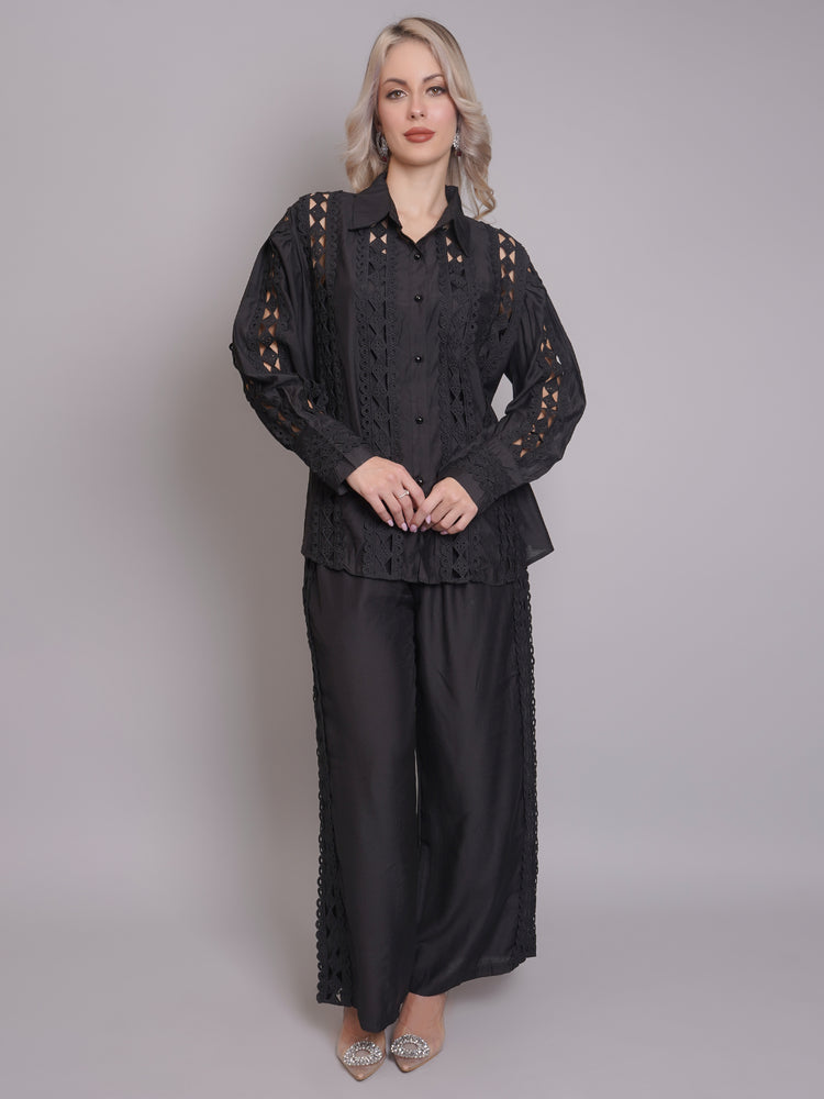 The Lace Dreams Two-Piece Set is a blend of elegance and casual chic, featuring a button-down lace top with wide-legged pants. Complete with a comfortable camisole and elastic waist, it’s the perfect co-ord for party or day wear, radiating style and sophistication with every detail.