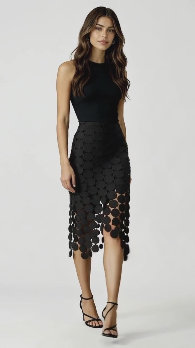 Elevate your look with this Laser Cut Double Layered Skirt, perfect for party, evening, or outings. Featuring a high-waisted fit, midi length, and intricate laser-cut circle pattern, it’s crafted with stretchable material for effortless style and comfort.