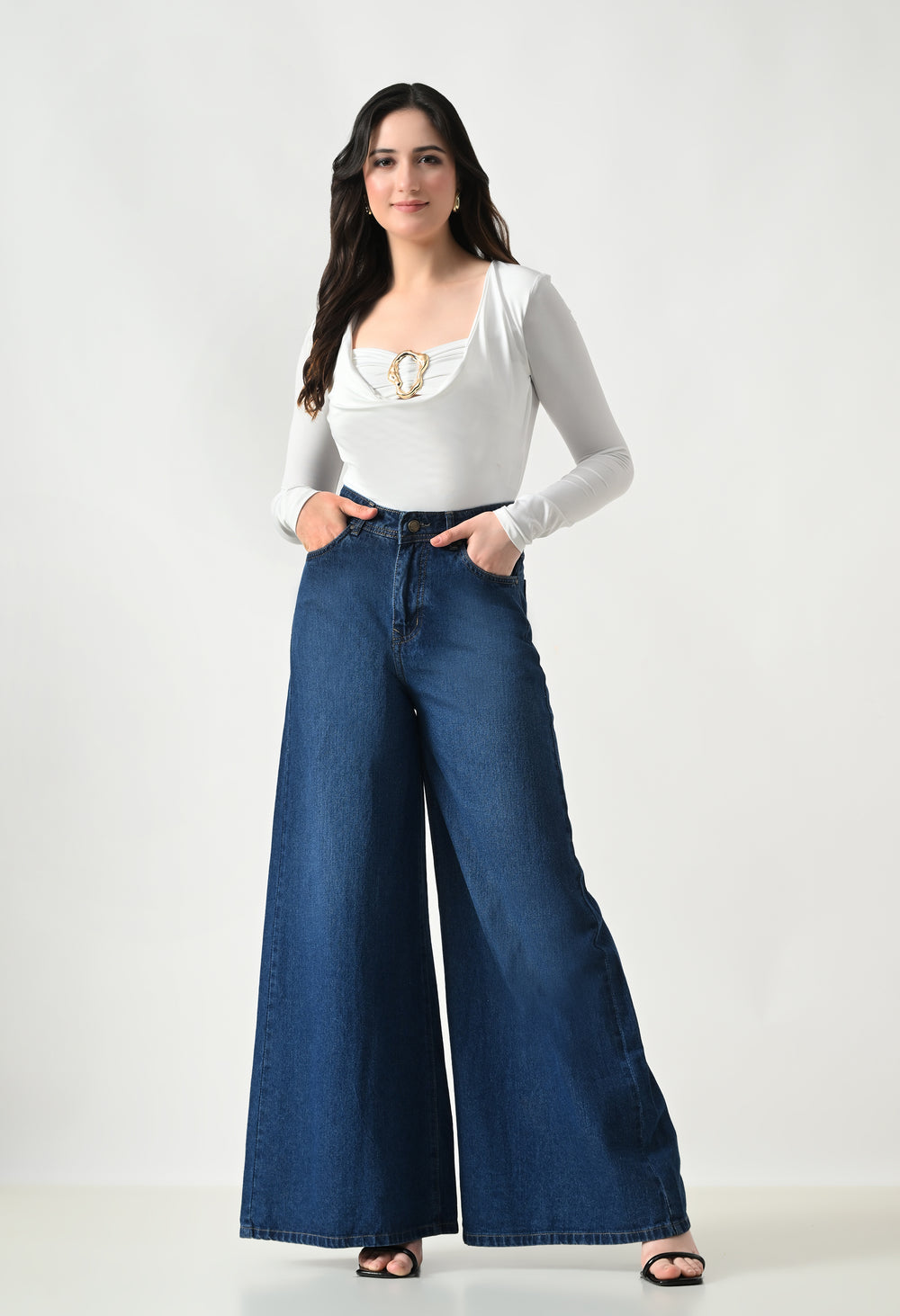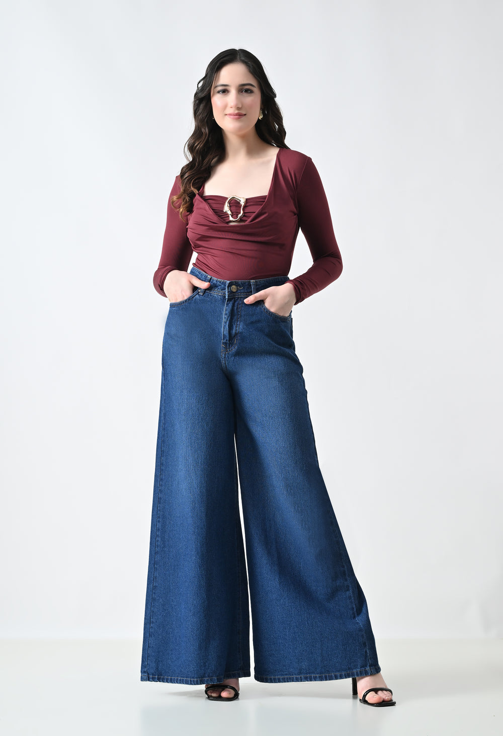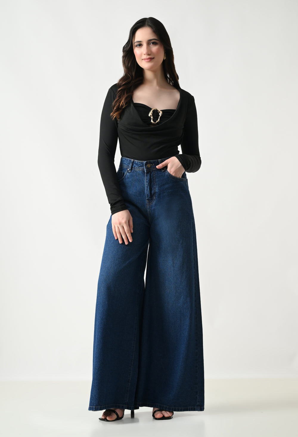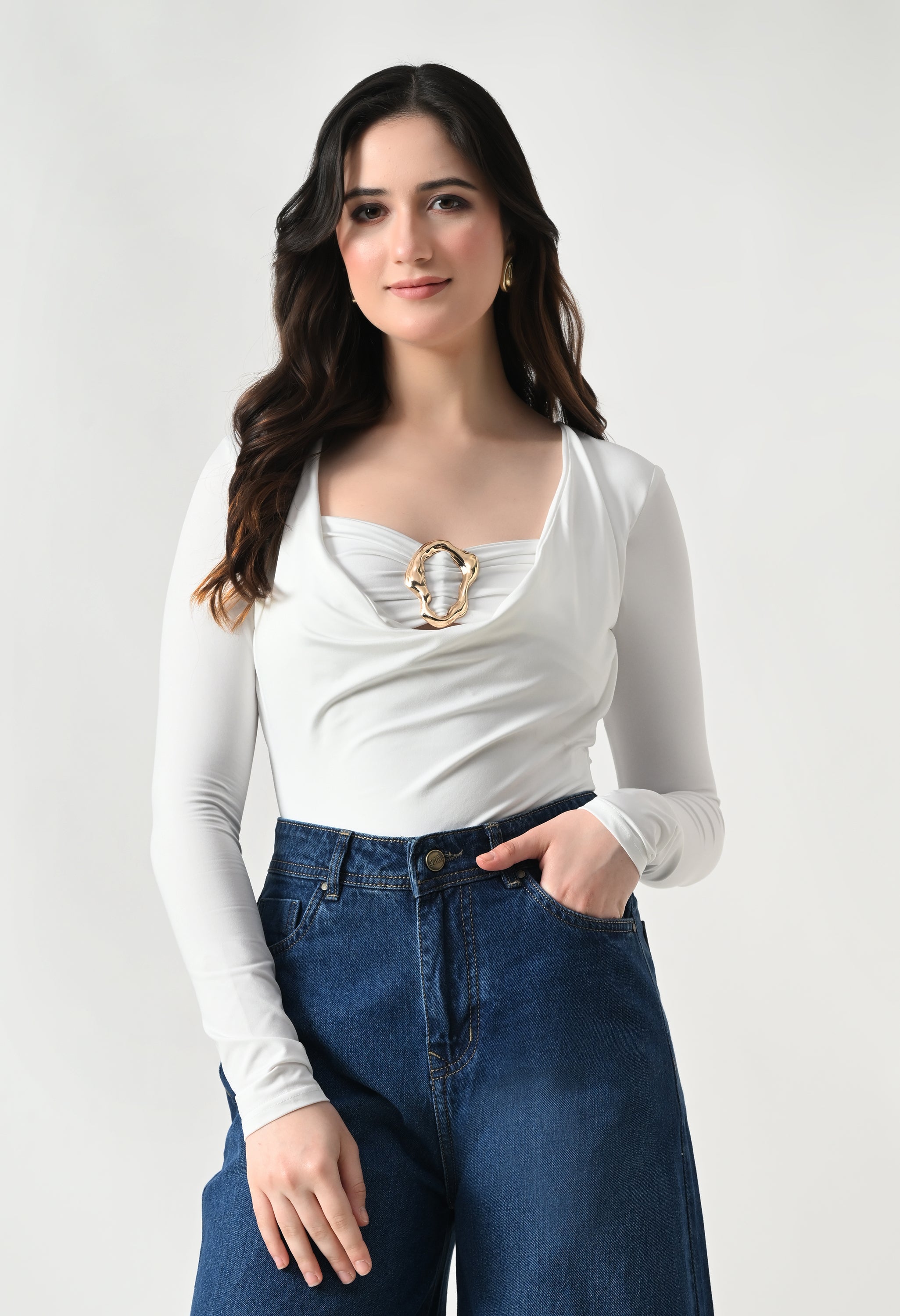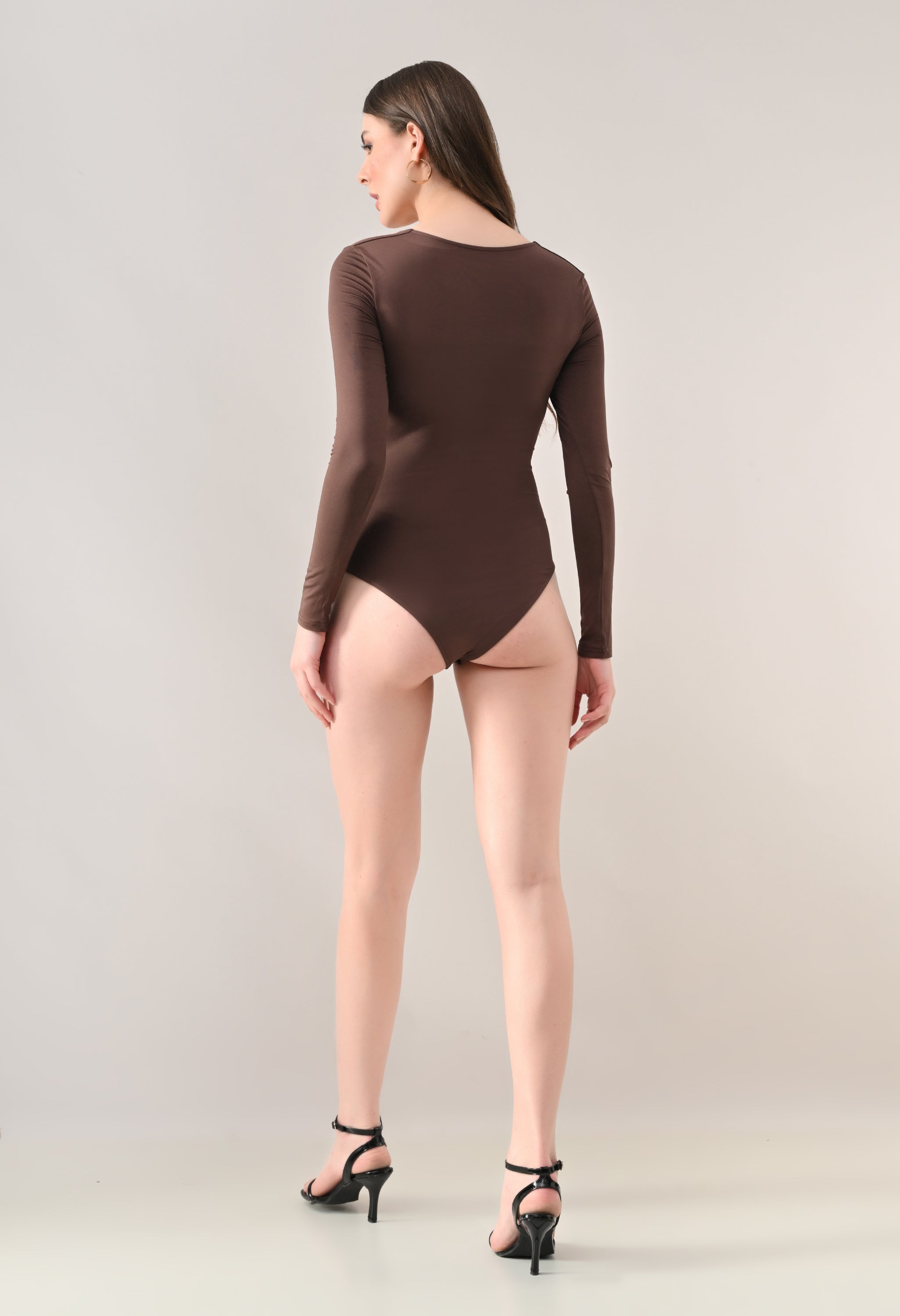 This sleek long-sleeve bodysuit is crafted from smooth, stretchable fabric for a flattering, body-hugging fit. It features a soft draped neckline accented with a metallic ring detail at the center, adding a subtle statement touch. The design includes full-length fitted sleeves and a high-cut leg opening that creates a streamlined silhouette. Perfect for layering or styling as a standalone piece, this bodysuit blends elegance with modern edge.