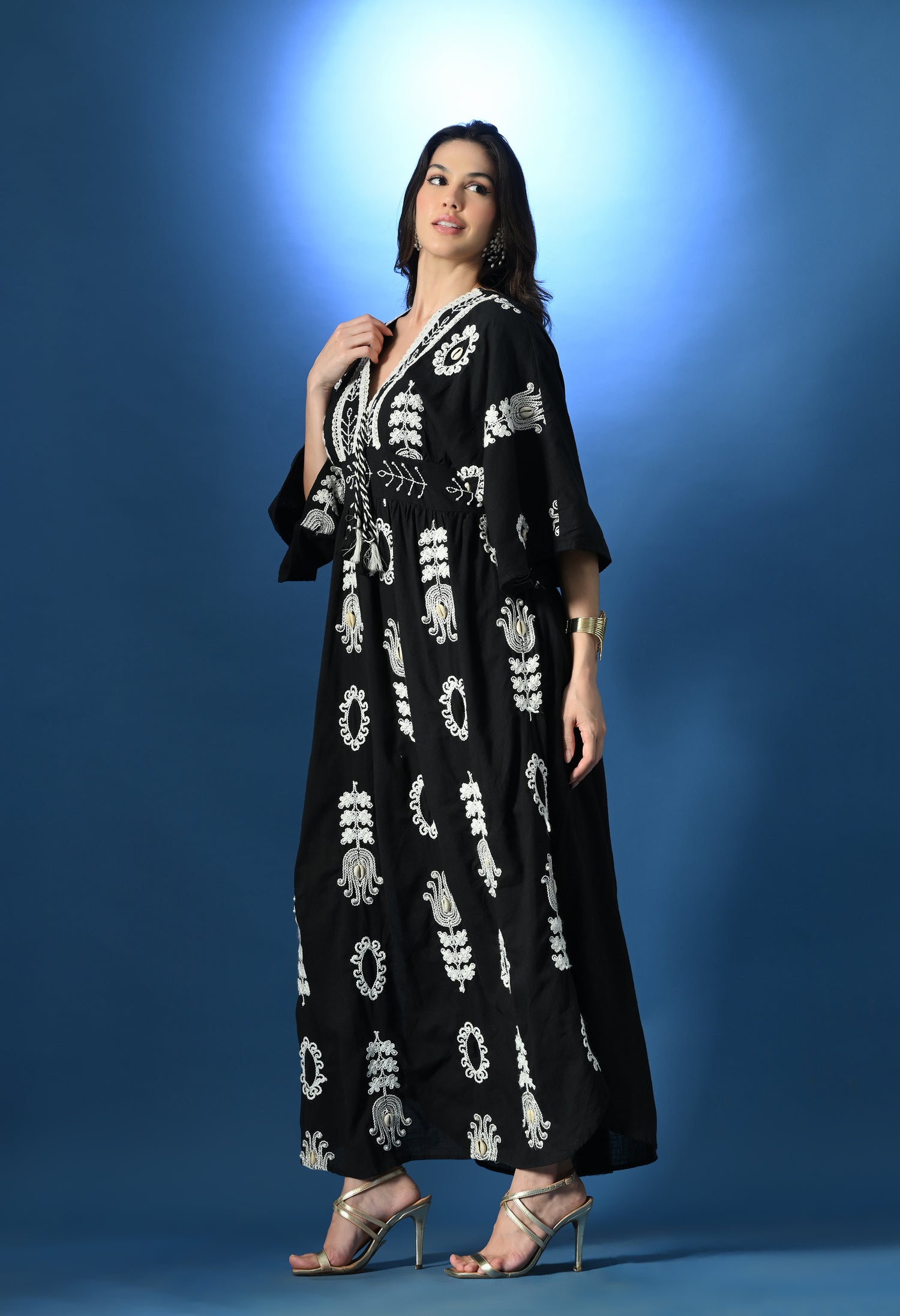 Step into effortless elegance with this maxi dress featuring a V-neckline with lace, dual-color tassel ties at front and back V neckline with tieable string, cinched band waistline in front with elasticated back waistline. Gathers ensure a flattering fit, while front embroidery with beadwork adds artisanal charm. Designed with tieable belt, ¾ kimono sleeves, and side slits with slight U-shaped hem, this partially lined, soft, and breezy non-stretchable dress offers both comfort and style.