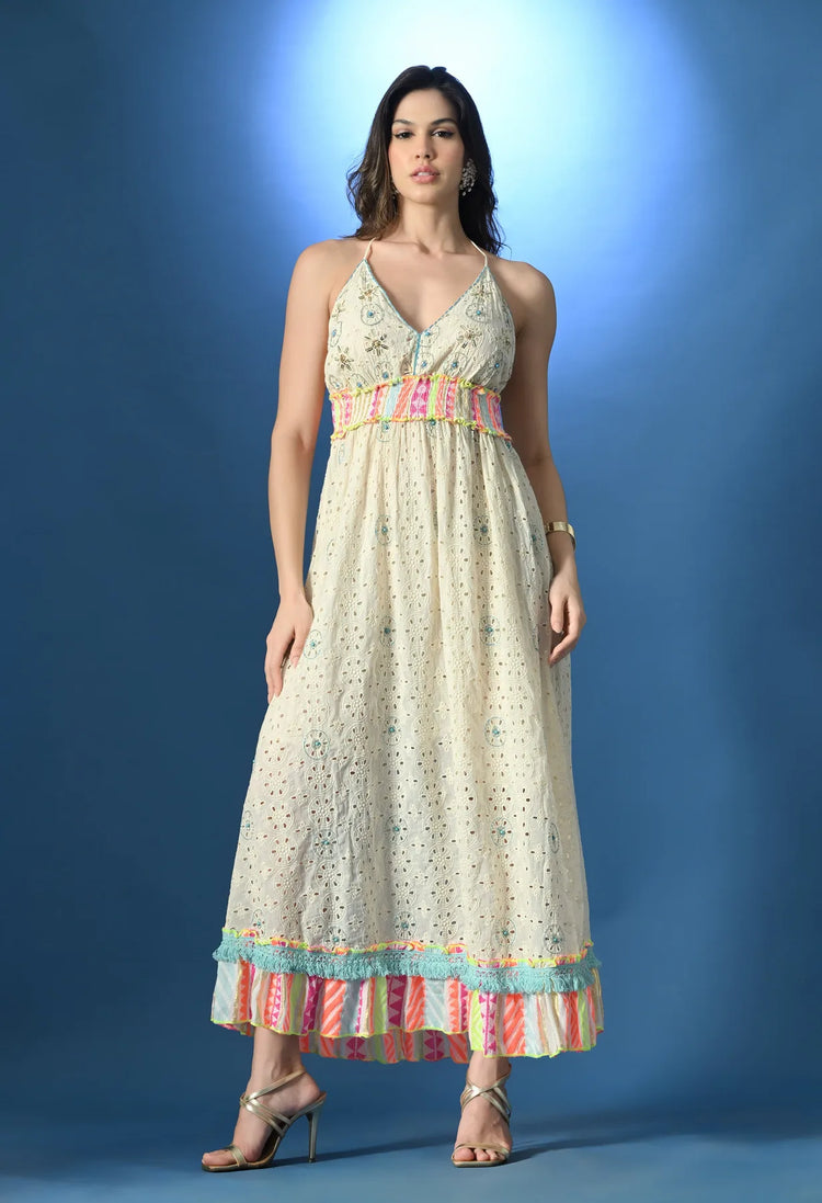Chic halter schiffli ankle dress featuring a V-neckline, backless and dual-coloured tassel ties at the back, sleeveless and delicate bead, thread, lace work. A smocking lurex elasticated waistline ensures a flattering fit. Lurex multi-colored cut-and-sew panels with fringe lace at the hem add an ethereal movement. Crafted from soft, breezy fabric, this alluring dress combines elegance with comfort, perfect for festive occasions or special events.