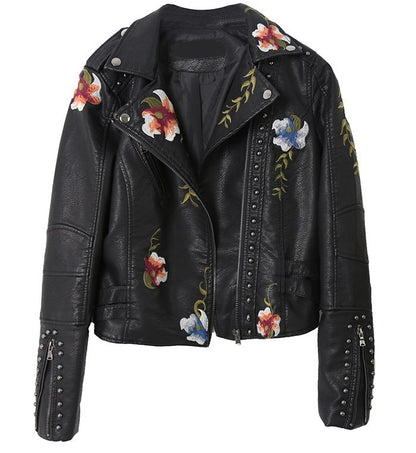 Trendy short jacket with a lapel notched collar, silver slant zipper front, and all-over multi-floral embroidery. Detailed with silver studs, snap buttons, zipper pocket, and shoulder tabs. Features zipper on sleeves, cinch strap at side bottom, and a lined, soft non-stretchable fabric for comfort and style. A perfect fusion of style, structure, and sophistication.