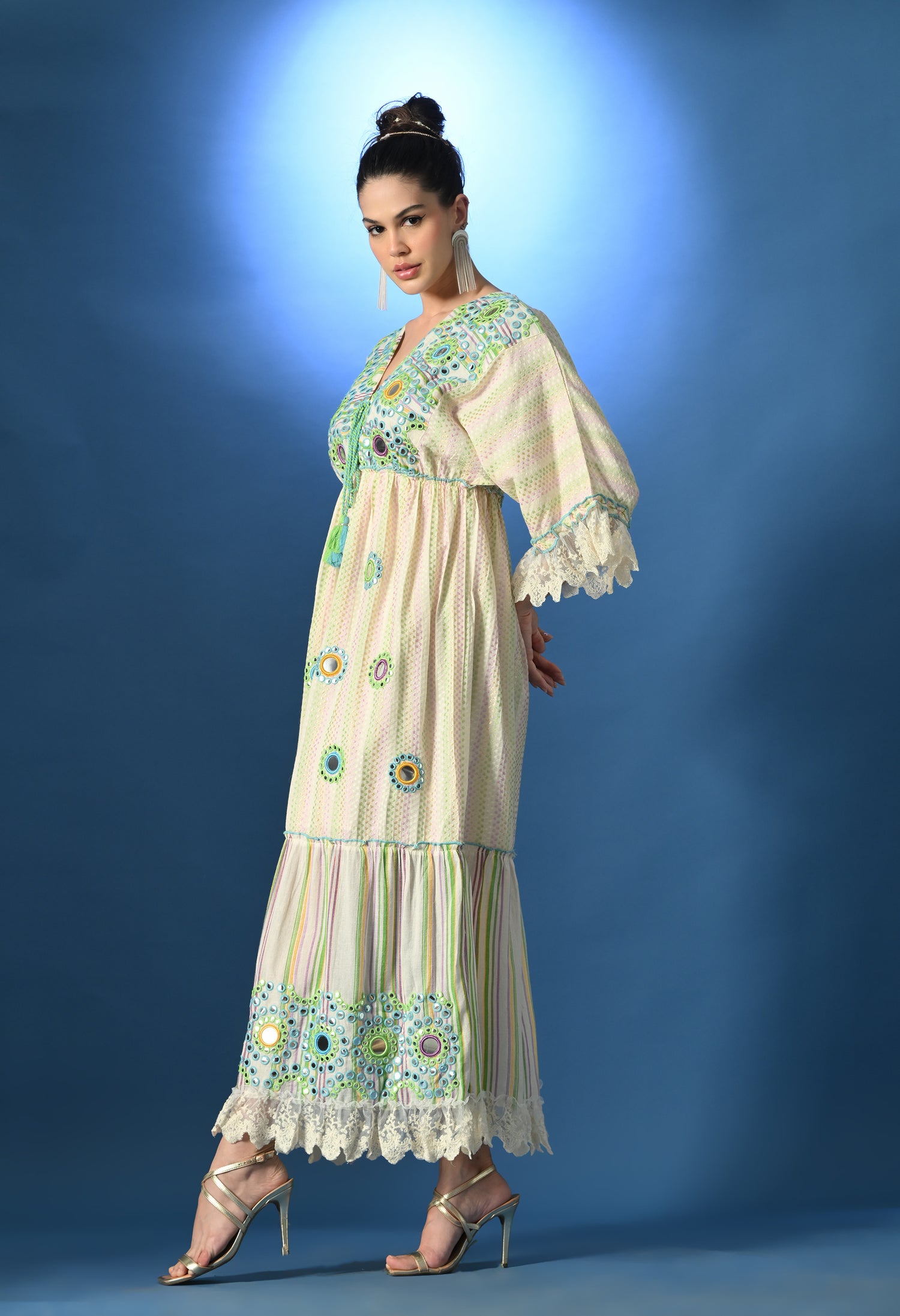 Step into effortless elegance with this Jacquard Maxi Dress, featuring a flattering V-neckline with two-tone tassel ties and delicate mirror embroidery across the front. The elasticated waist with gathers ensures a comfortable, feminine silhouette, while the 3/4 kimono sleeves with lace ruffle openings add a flowy charm. A striped cut-and-sew panel at the bottom and lace-trimmed hem enhance its boho-inspired appeal. Finished with blue baby overlock detailing and a soft lining, this maxi is crafted from lightweight jacquard fabric that is non-stretchable yet breezy, making it perfect for all-day wear.