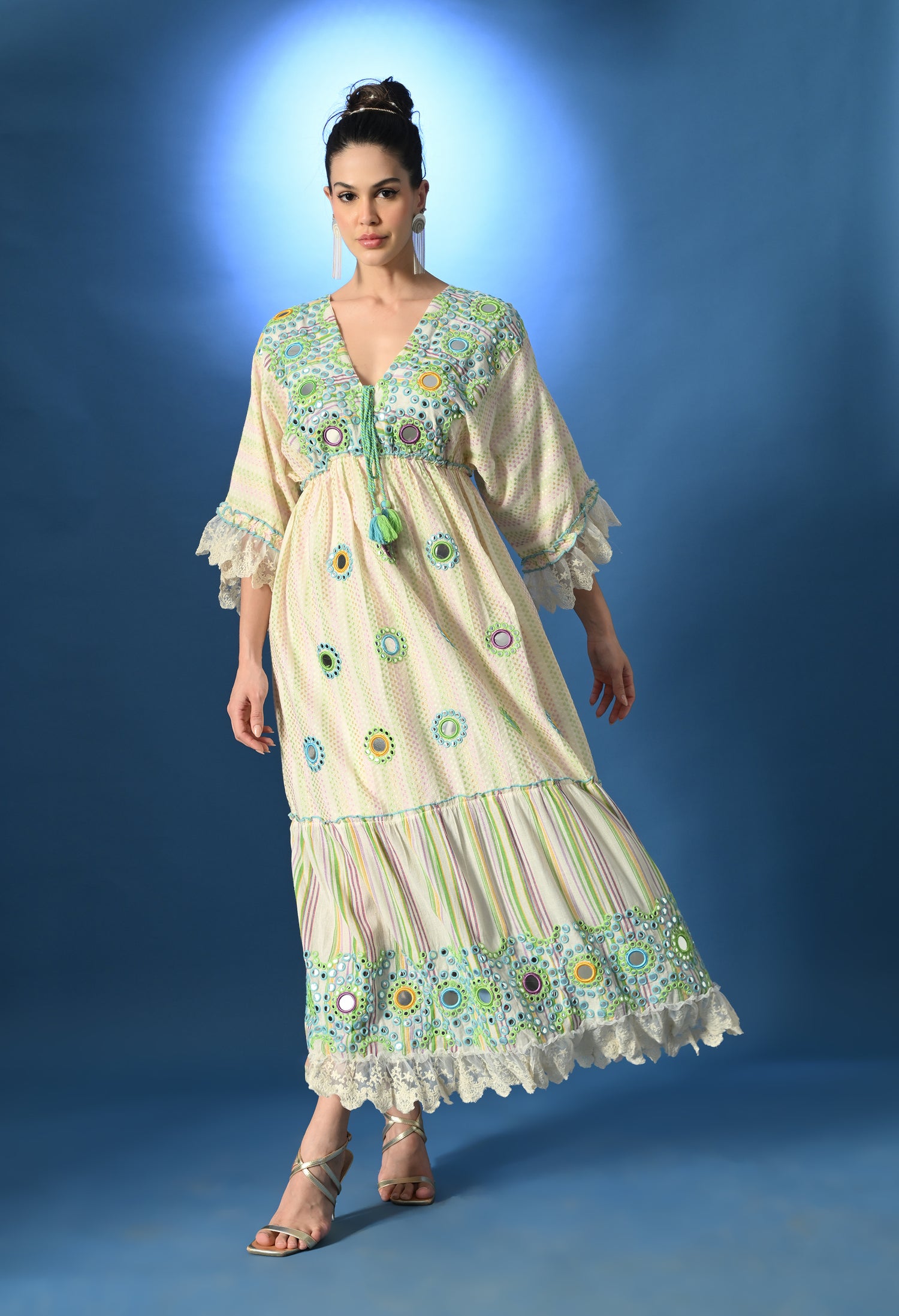 Fireworks of vivid hues, intricate threadwork that illuminate her femininity and mirrors that echo her timeless grace - this Kimono dress is a celebration of eternal womanhood.