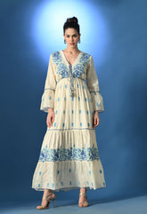 Stripe Jacquard Maxi Dress featuring a V neckline with dual-color string and tassels at front and back. Adorned with all-over embroidery and bead work in front, embroidery at the back, full sleeves with bell opening, and an elasticated gathered waist for a flattering fit. Finished with contrast thread baby overlock detailing and half lining. Crafted from soft, breezy, non-stretchable fabric for comfort and elegance.