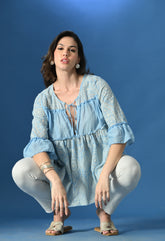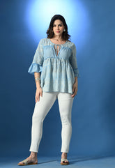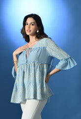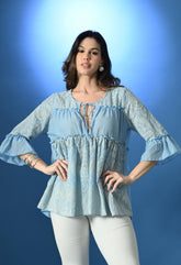Elegant Schiffli flared top featuring U-neckline with string tie, all-over gathers, and solid panels at the bust and back for definition. Designed with ¾ sleeves finished with solid ruffles, this top is crafted from soft, breezy, non-stretchable fabric for all-day comfort.