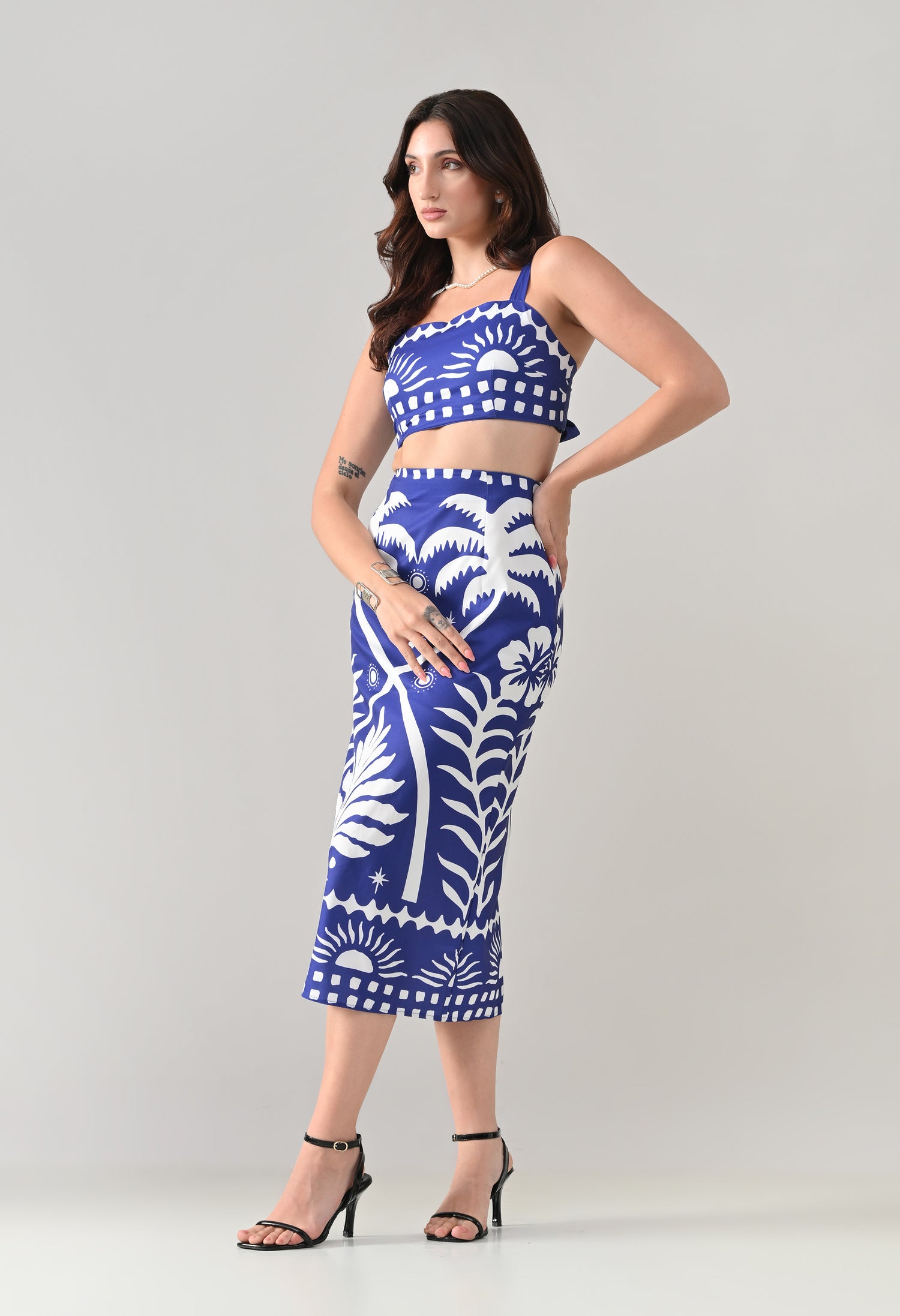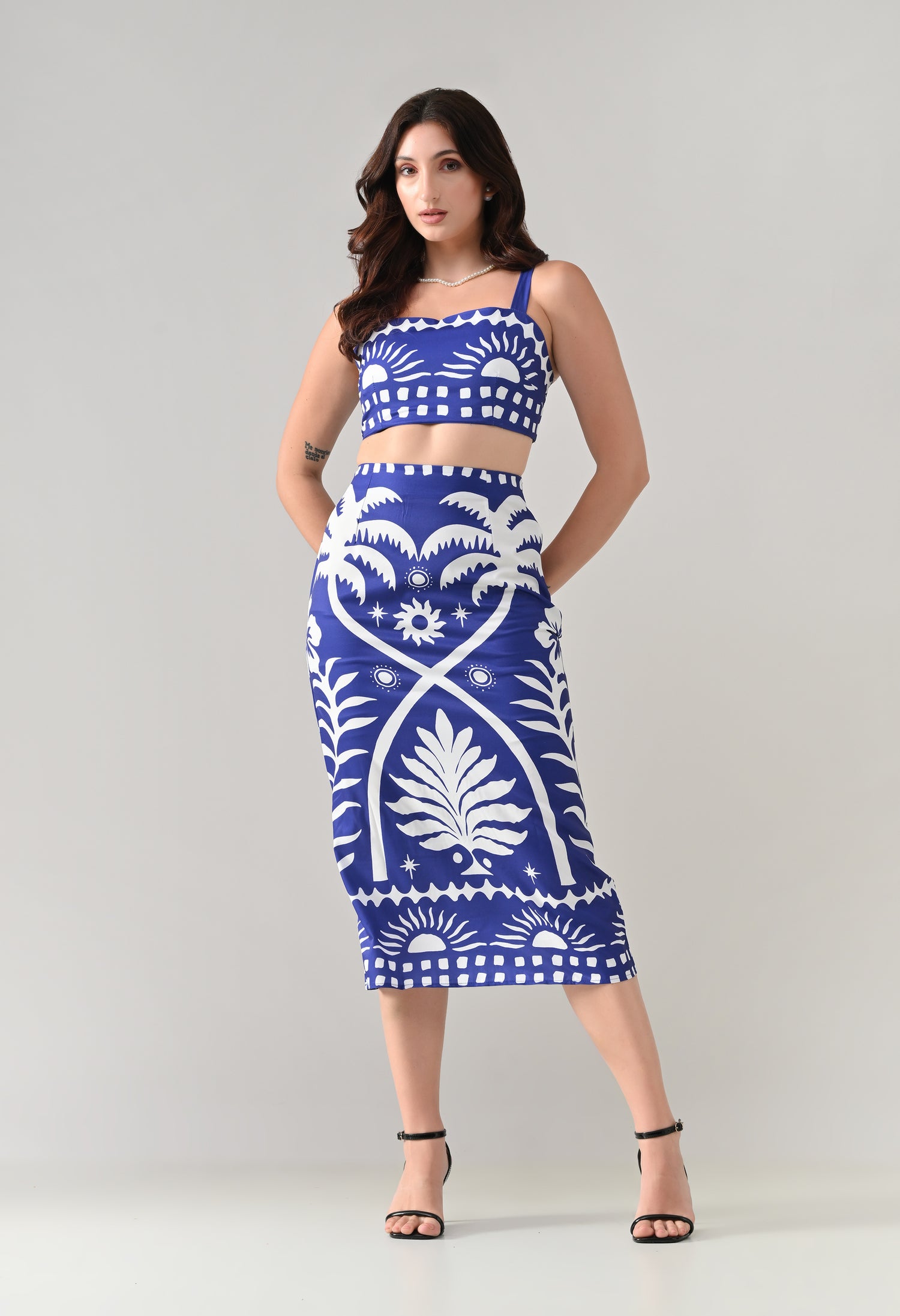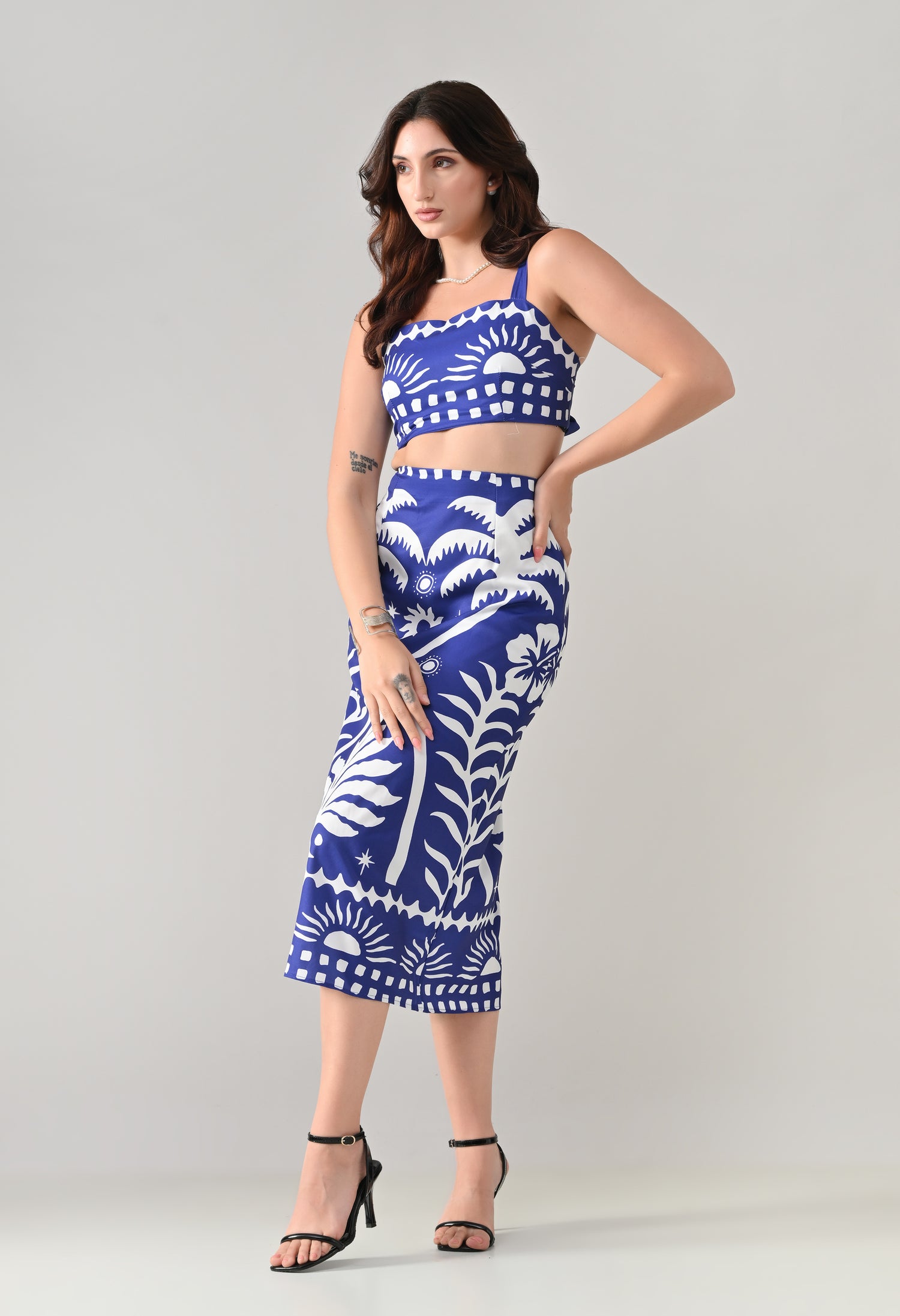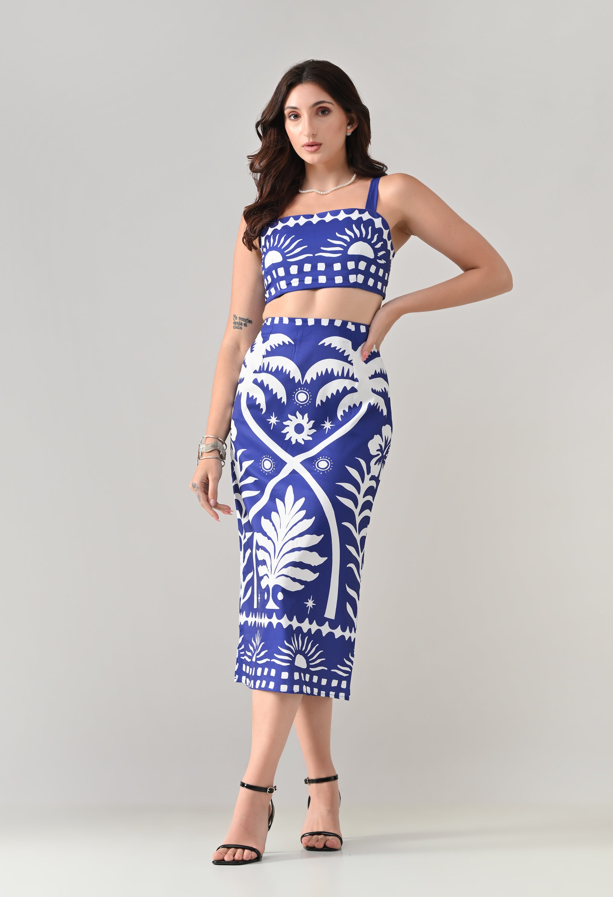 This eye-catching two-piece co-ord set features a printed crop top paired with a matching midi skirt, designed for a coordinated statement look. The crop top comes in a bandeau-style silhouette with wide shoulder straps and a back tie fastening, allowing an adjustable and secure fit. The matching high-waist skirt falls into a straight to slightly A-line silhouette, offering a flattering elongated appearance. Crafted from a smooth woven fabric, the set showcases a bold contrast tropical-inspired print in deep blue and white, making it perfect for vacations, summer outings, and resort wear.