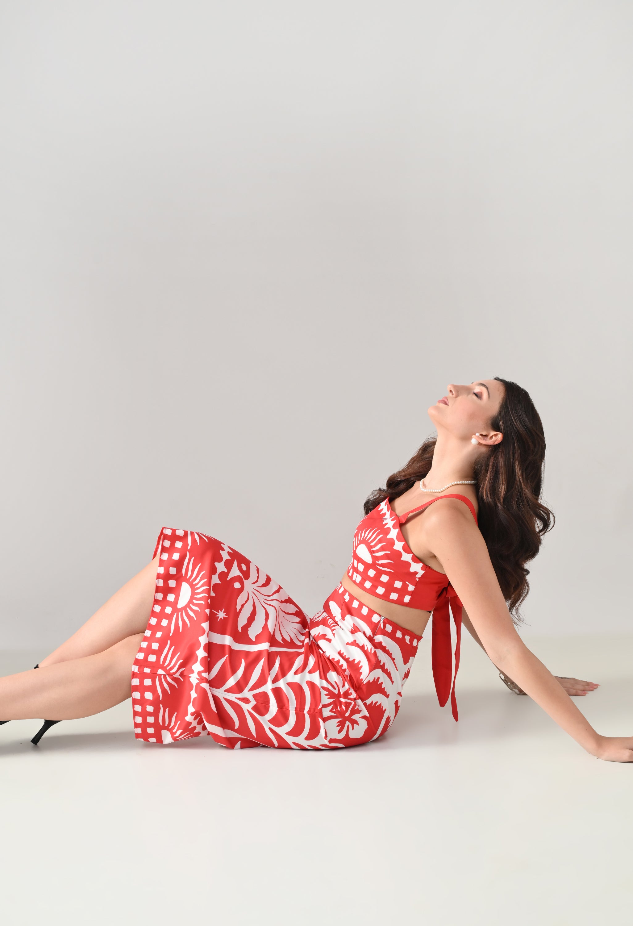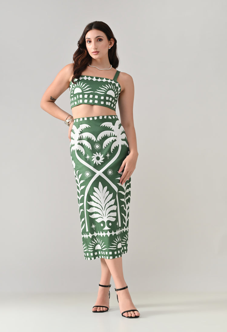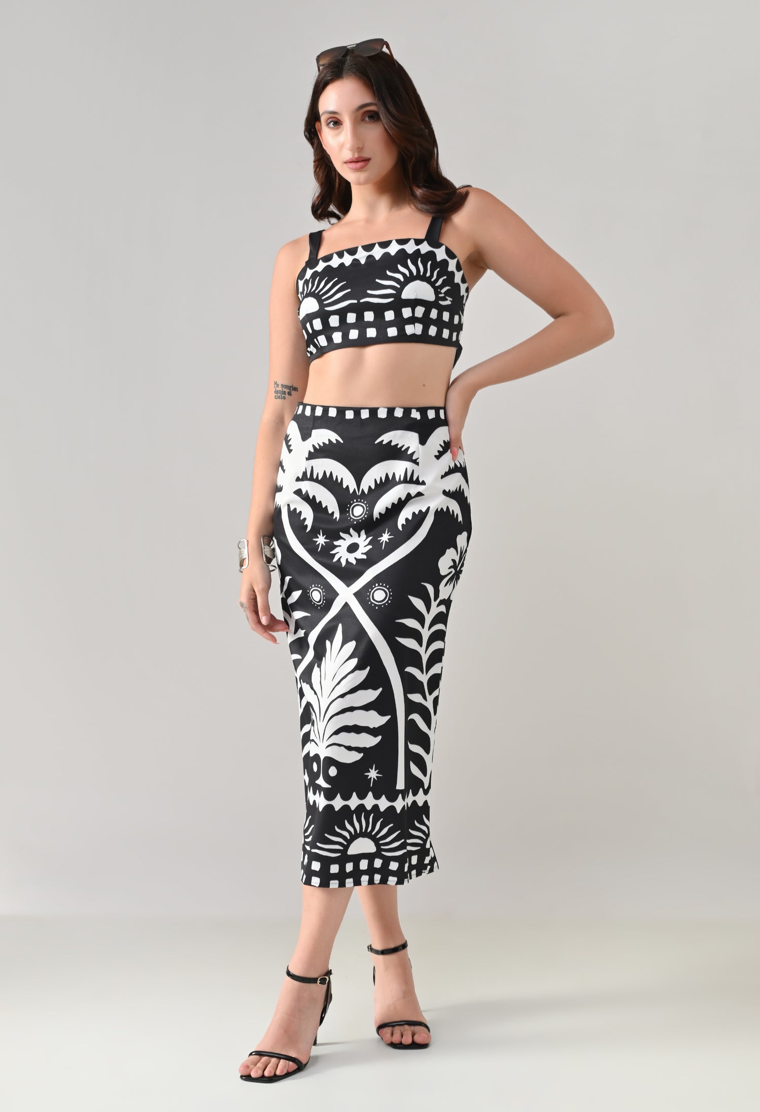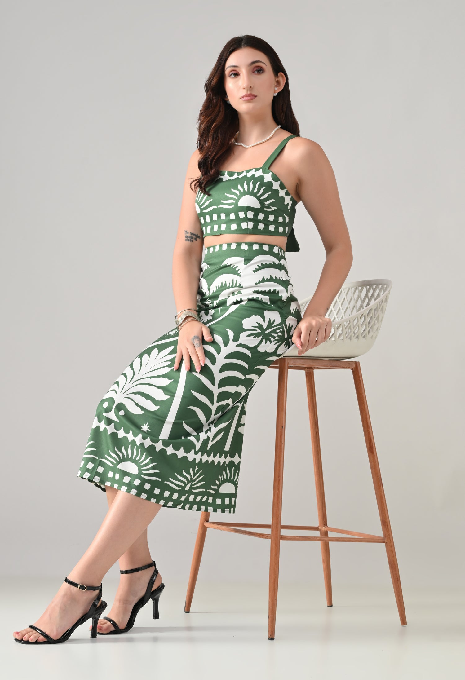 This eye-catching two-piece co-ord set features a printed crop top paired with a matching midi skirt, designed for a coordinated statement look. The crop top comes in a bandeau-style silhouette with wide shoulder straps and a back tie fastening, allowing an adjustable and secure fit. The matching high-waist skirt falls into a straight to slightly A-line silhouette, offering a flattering elongated appearance. Crafted from a smooth woven fabric, the set showcases a bold contrast tropical-inspired print in deep blue and white, making it perfect for vacations, summer outings, and resort wear.