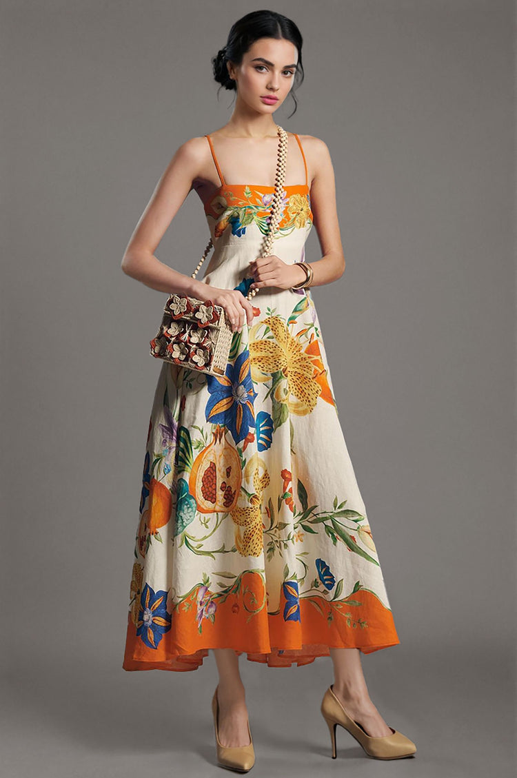Add a burst of color to your wardrobe with this multicolored floral midi sundress – perfect for summer getaways or sunny day outings. Featuring a square neckline, adjustable spaghetti straps, and a breezy midi silhouette, it's your go-to for effortless style.
