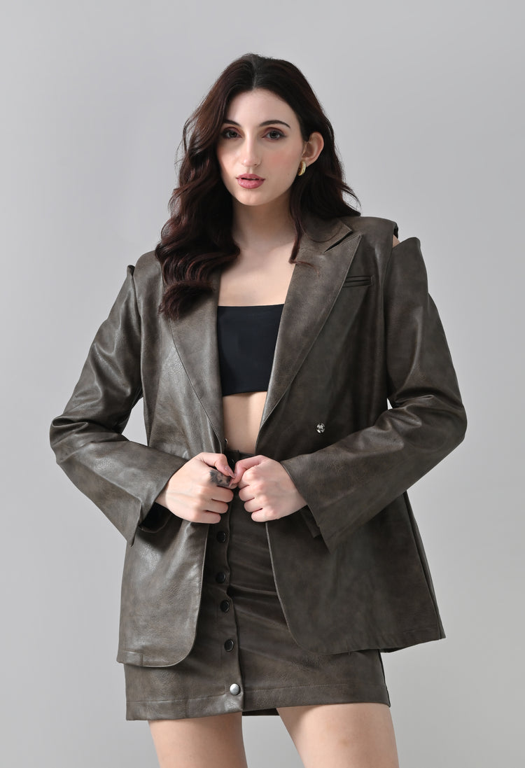 This chic two-piece faux leather co-ord set features a tailored blazer and matching mini skirt for a modern, edgy look. The blazer is crafted from soft faux leather with a notched lapel, concealed snap buttons, and a shoulder notch for subtle shoulder exposure. Full-length sleeves and sleek non-functional pockets complete the sharp silhouette.