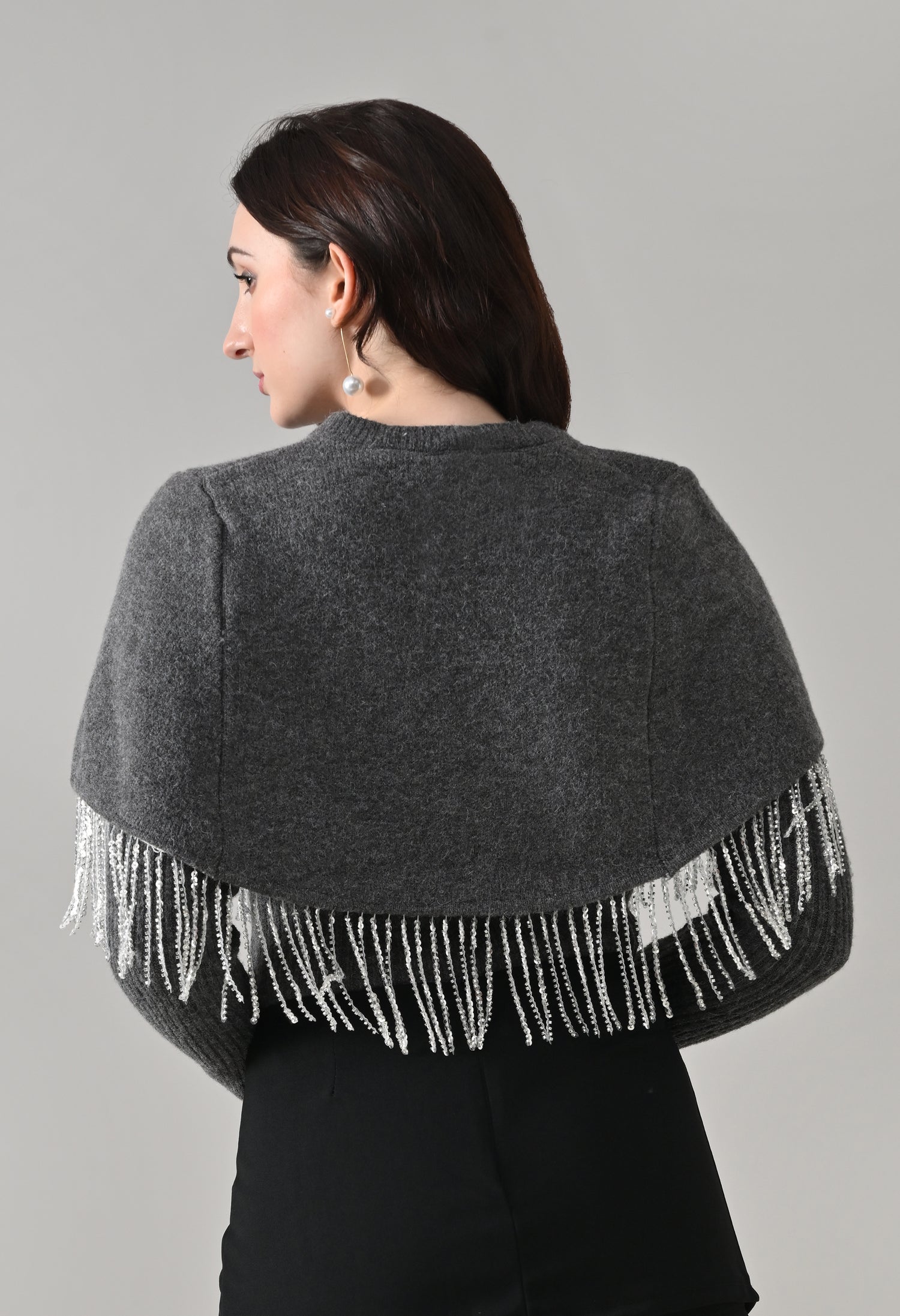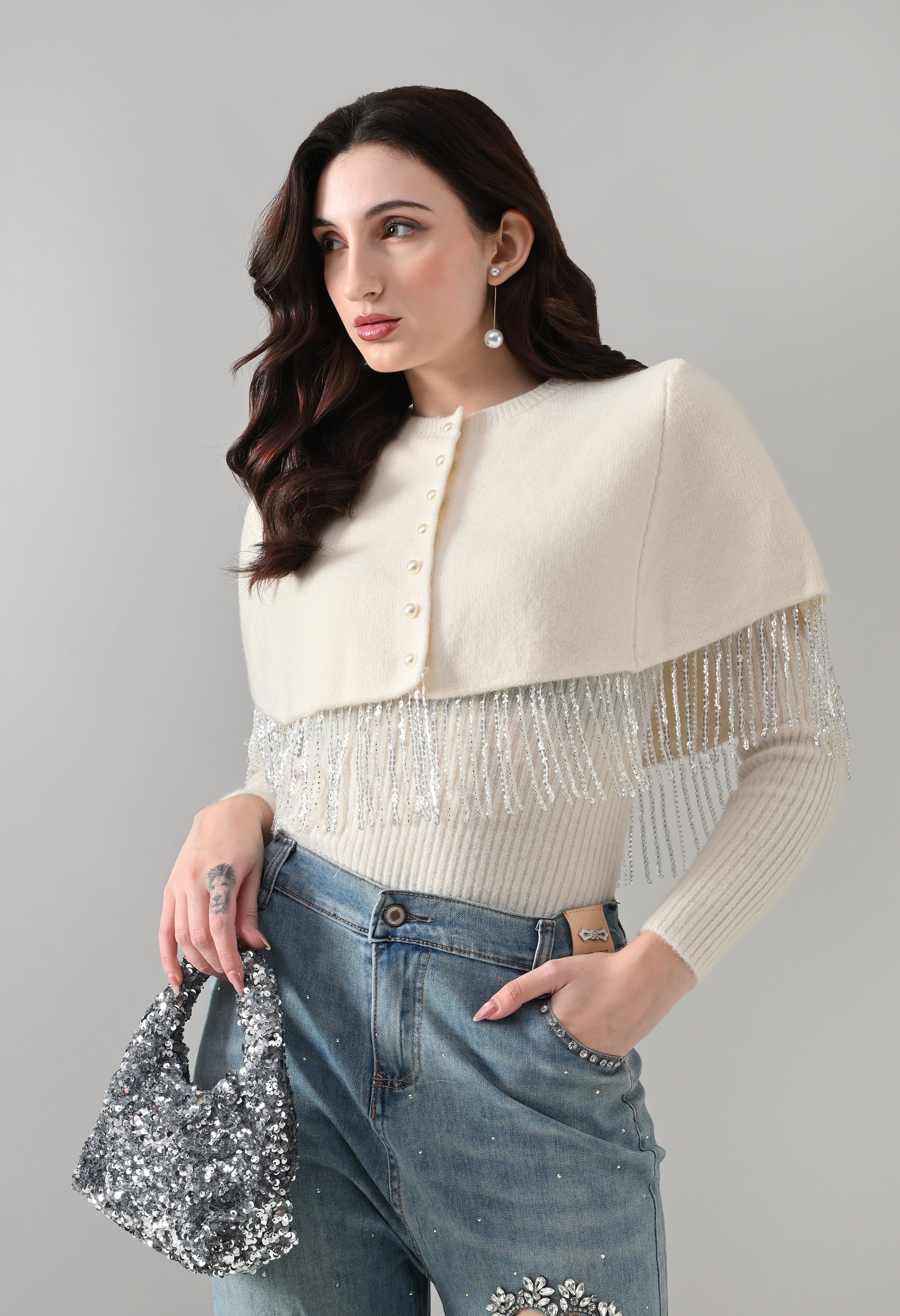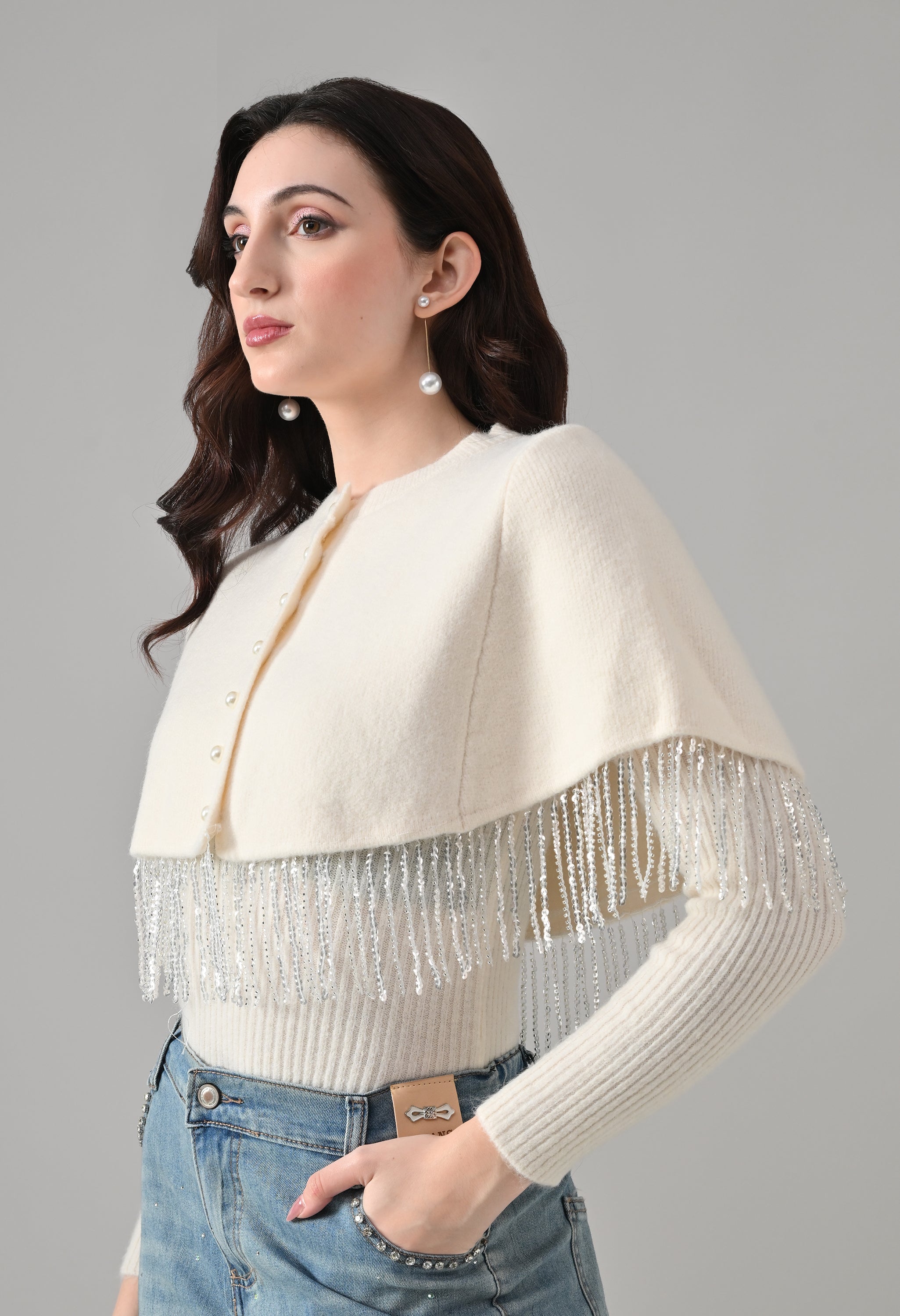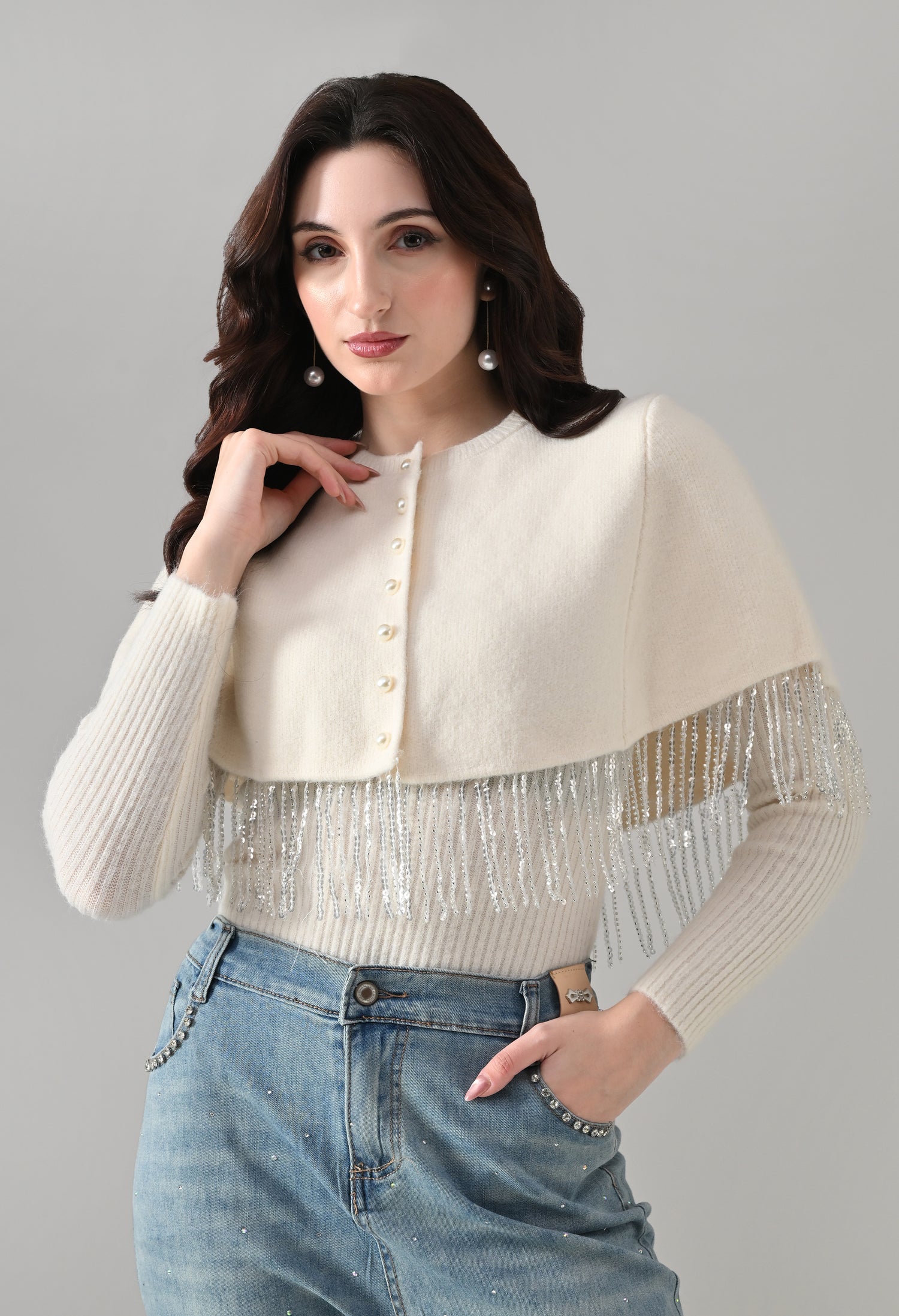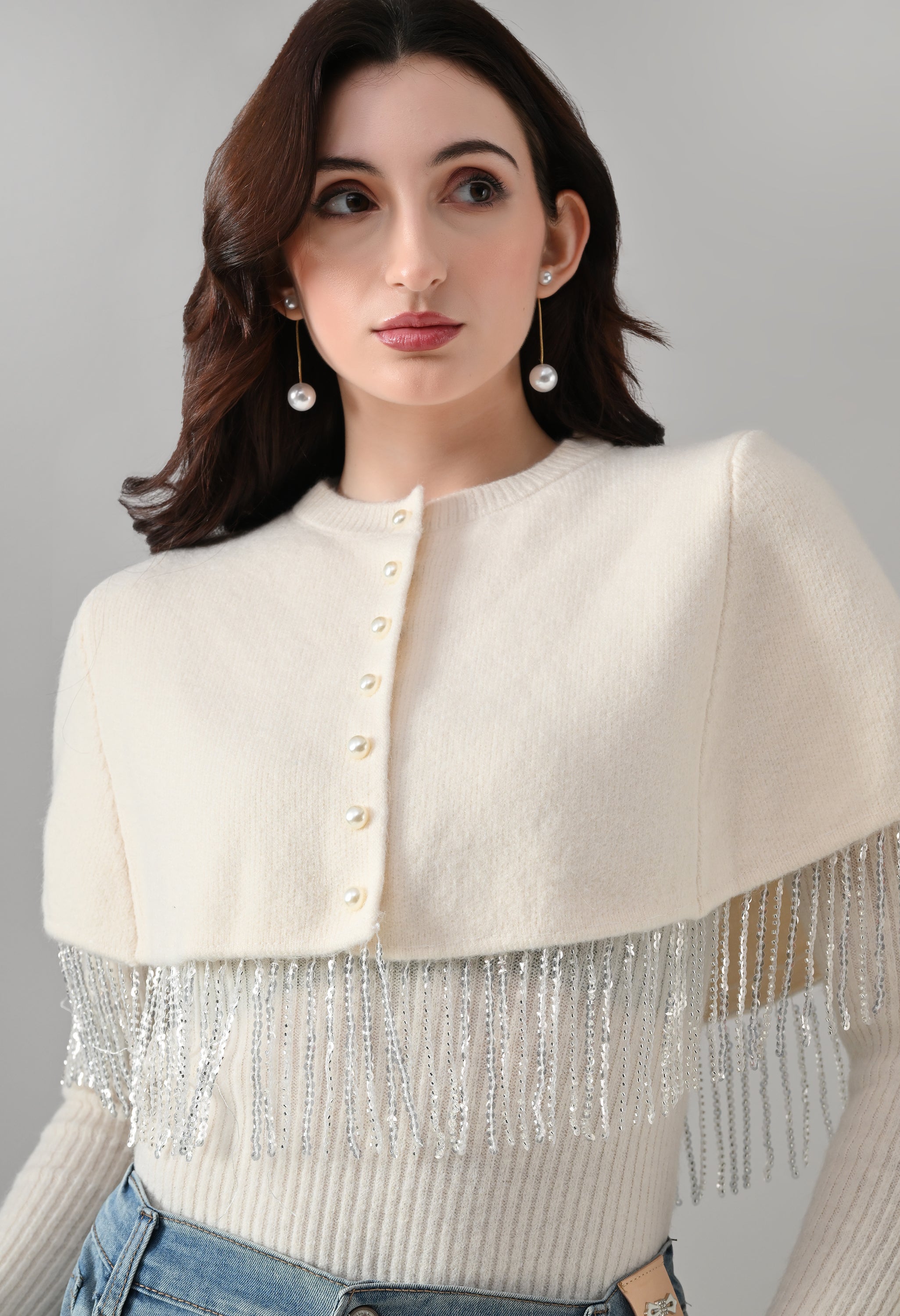This elegant 2-piece knit set features a chic layered design that blends comfort with statement detailing. The cropped cape-style top comes with a classic round neckline and is accented with off-white pearl front button-down detailing, while silver bead and sequin fringe along the hem adds a touch of shimmer and graceful movement. Paired with a soft, stretchable woolen ribbed knit top, the inner layer offers full-length sleeves and a body-hugging, fitted silhouette that flatters the shape. Finished with a rounded hemline and a regular length, this coordinated set is perfect for creating a polished yet cozy look.