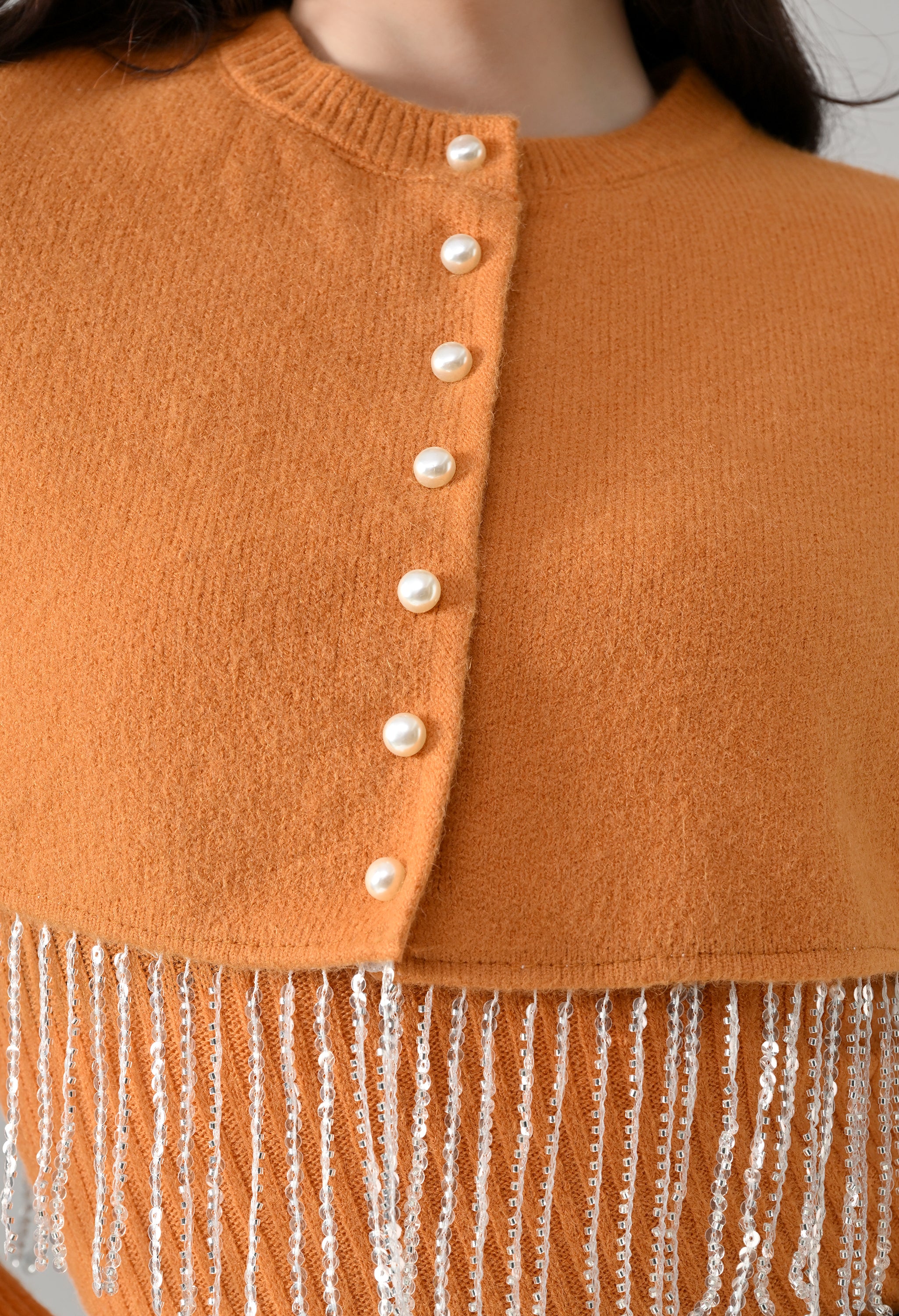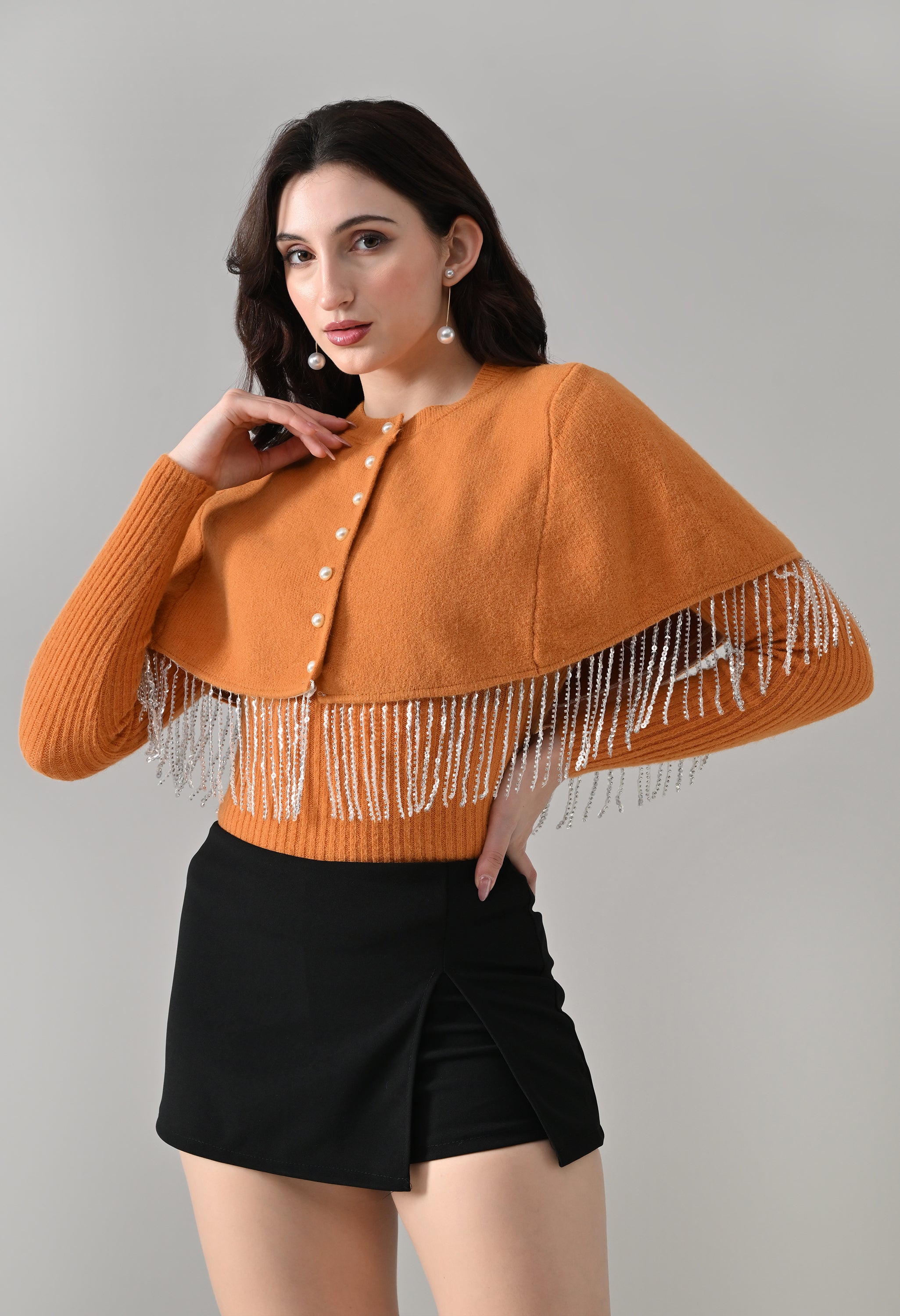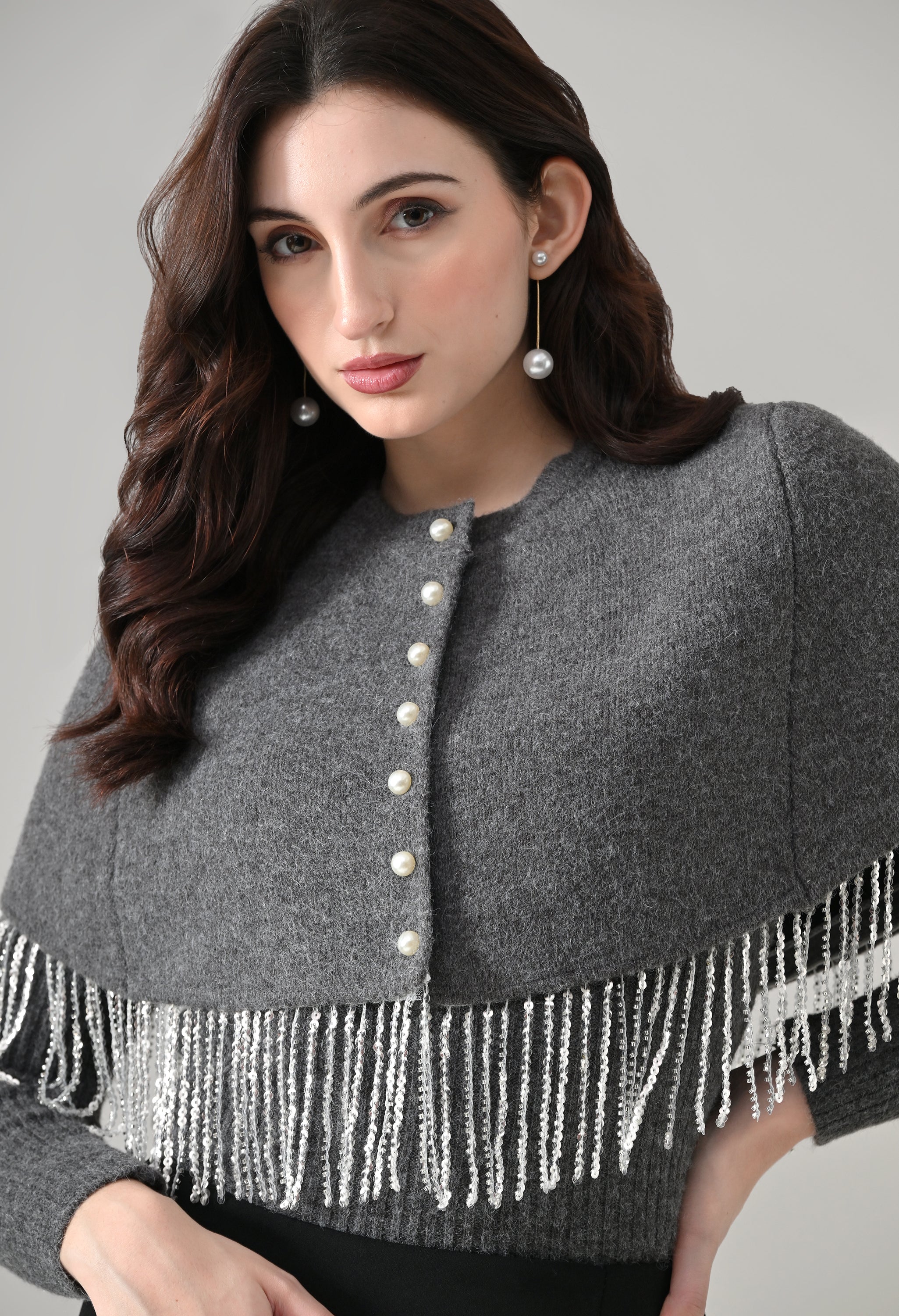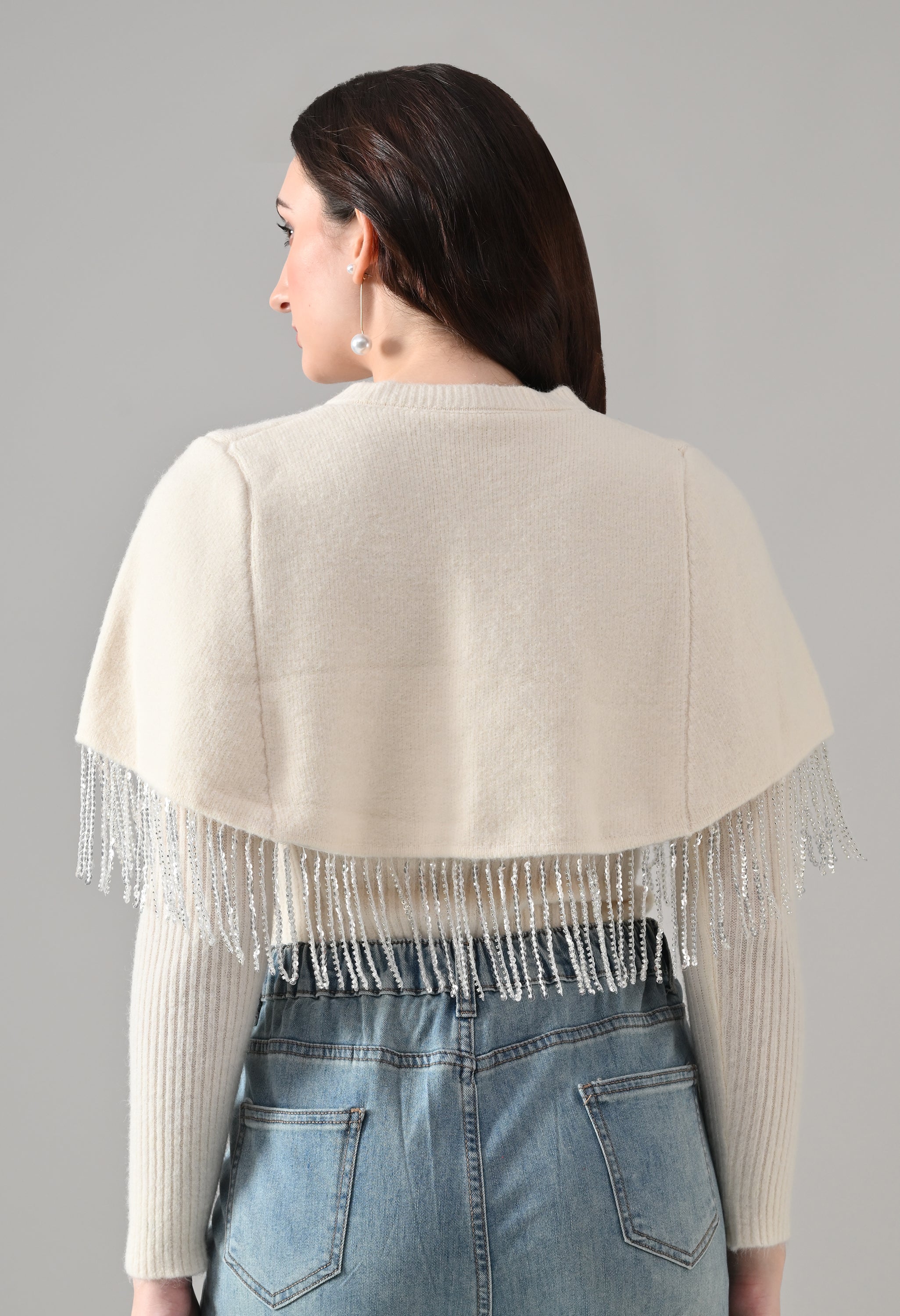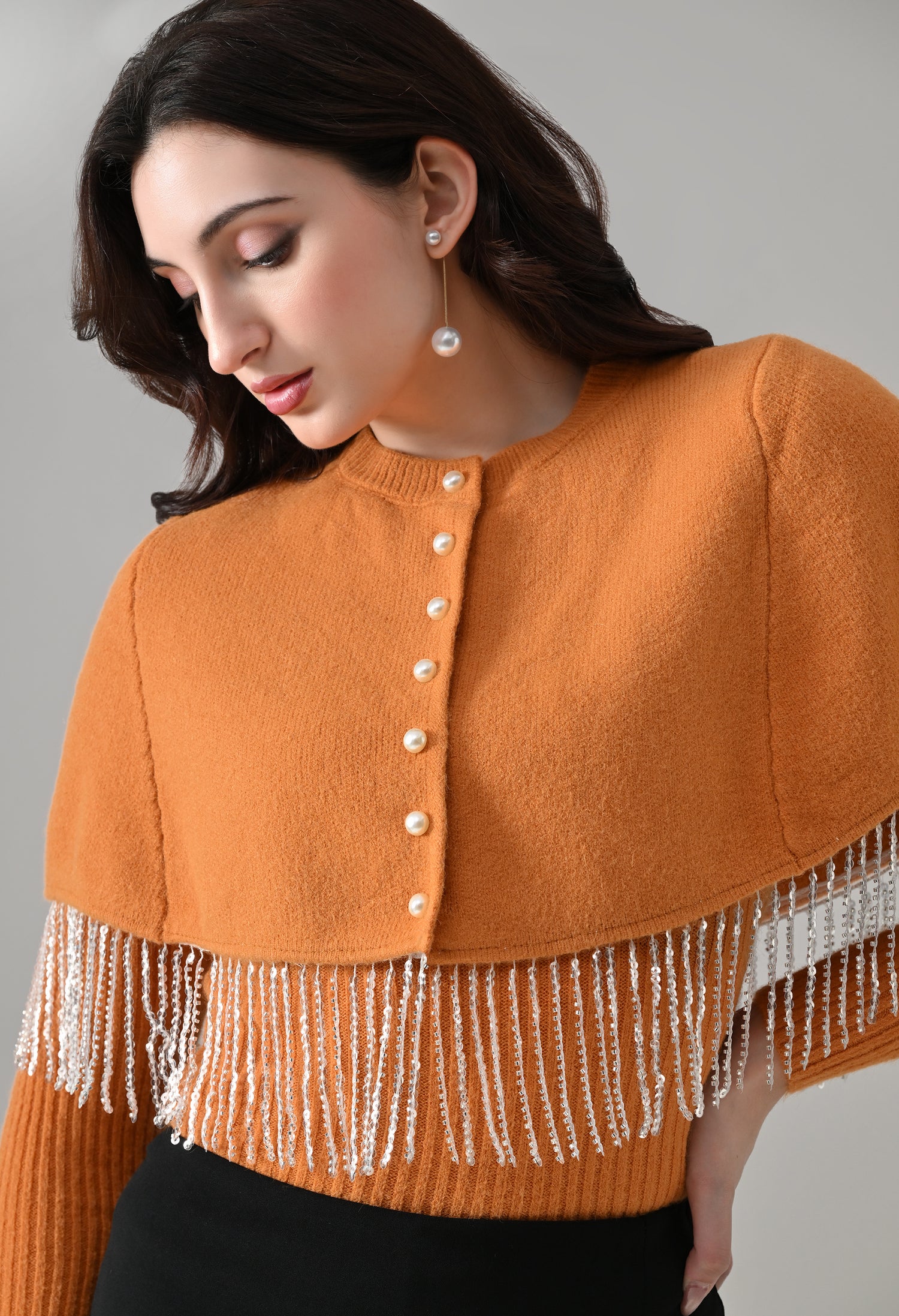 This elegant 2-piece knit set features a chic layered design that blends comfort with statement detailing. The cropped cape-style top comes with a classic round neckline and is accented with off-white pearl front button-down detailing, while silver bead and sequin fringe along the hem adds a touch of shimmer and graceful movement. Paired with a soft, stretchable woolen ribbed knit top, the inner layer offers full-length sleeves and a body-hugging, fitted silhouette that flatters the shape. Finished with a rounded hemline and a regular length, this coordinated set is perfect for creating a polished yet cozy look.