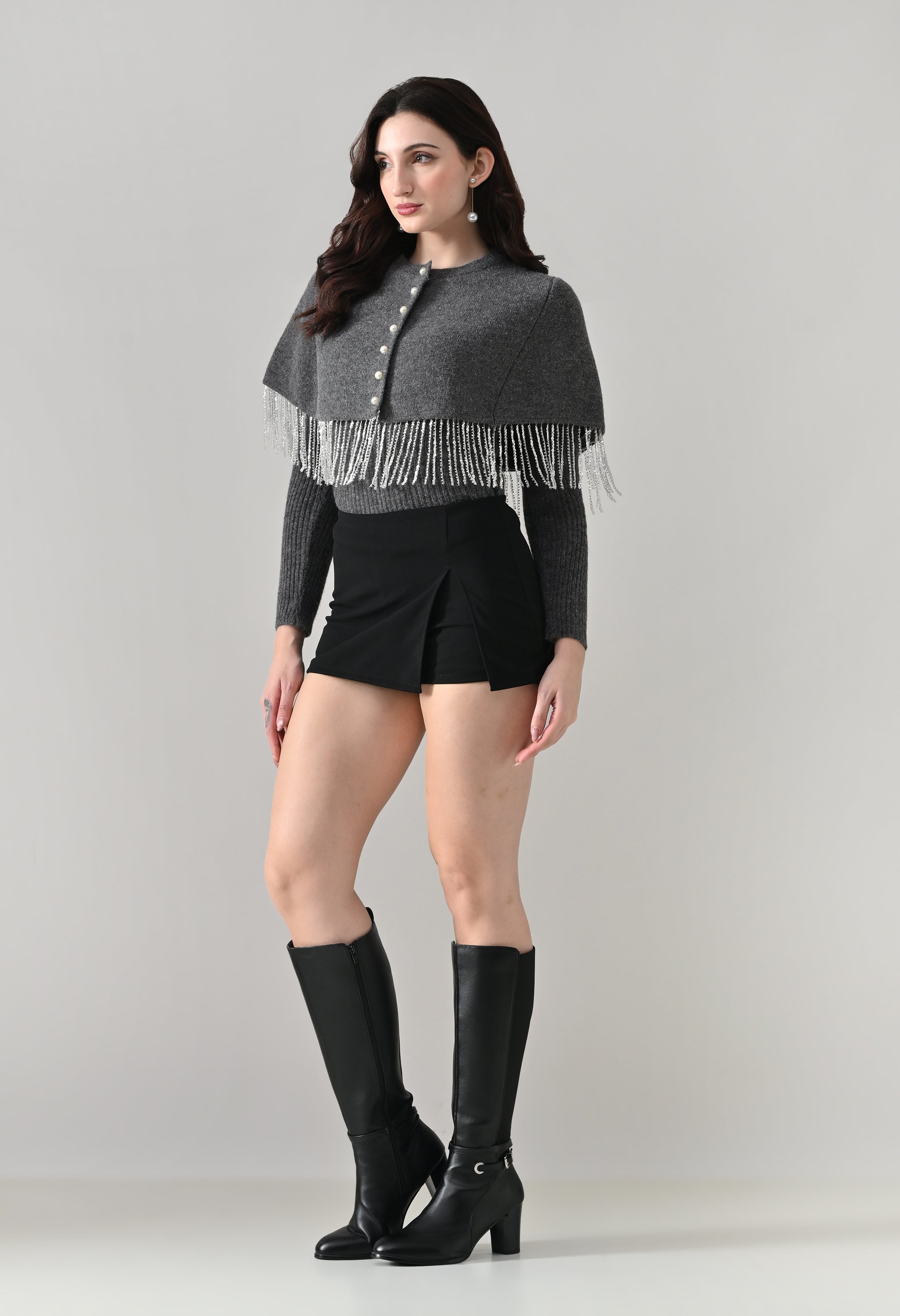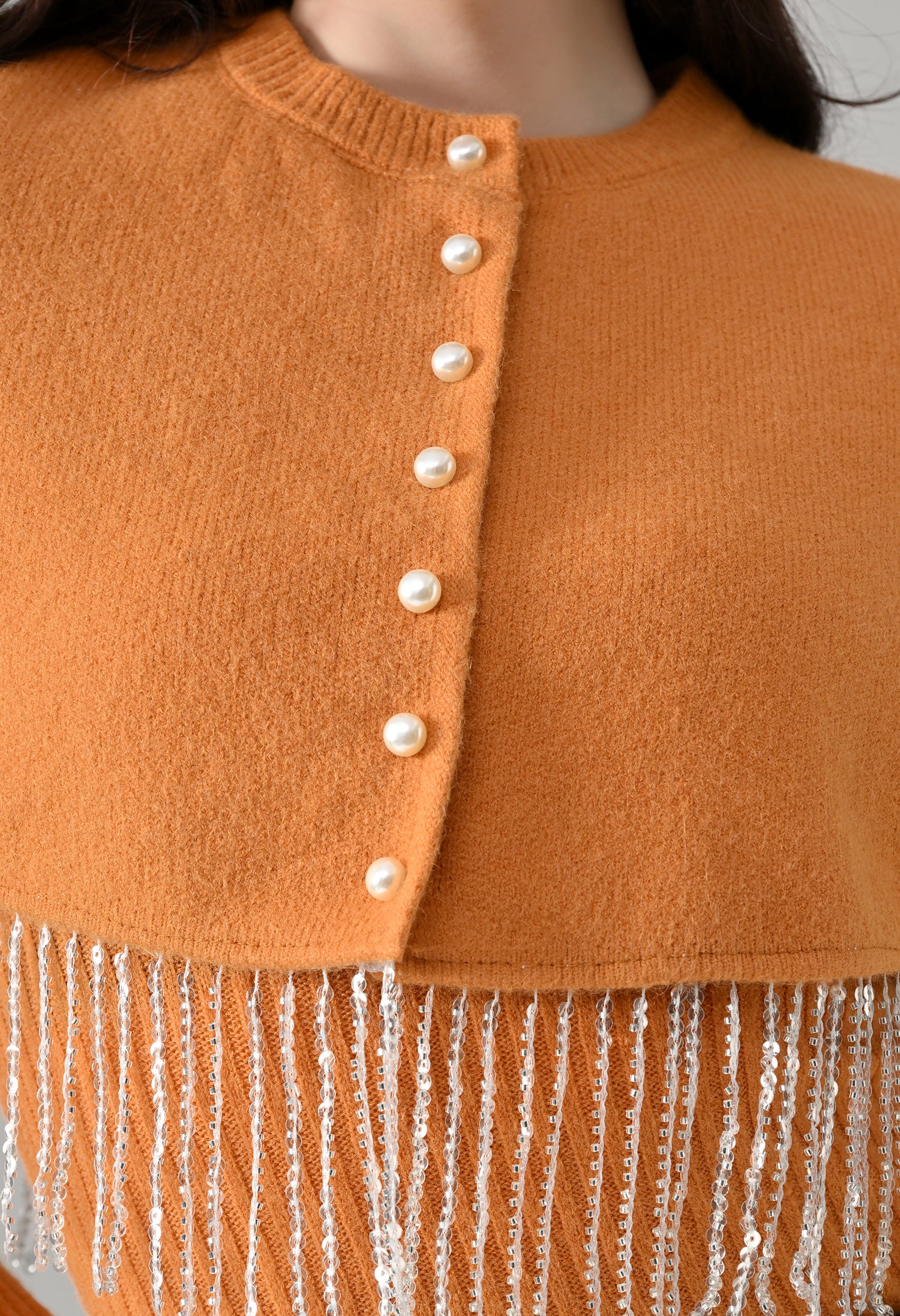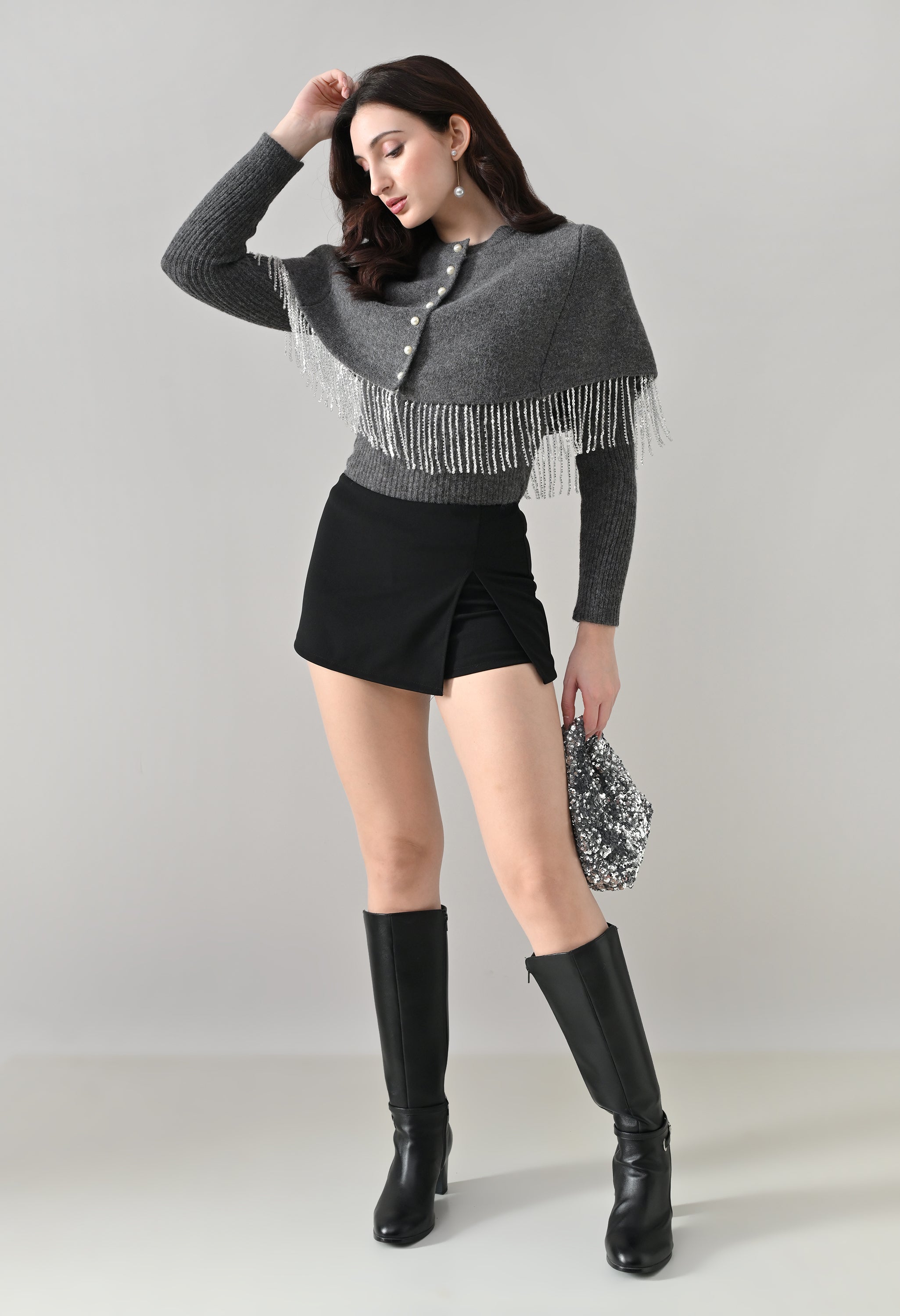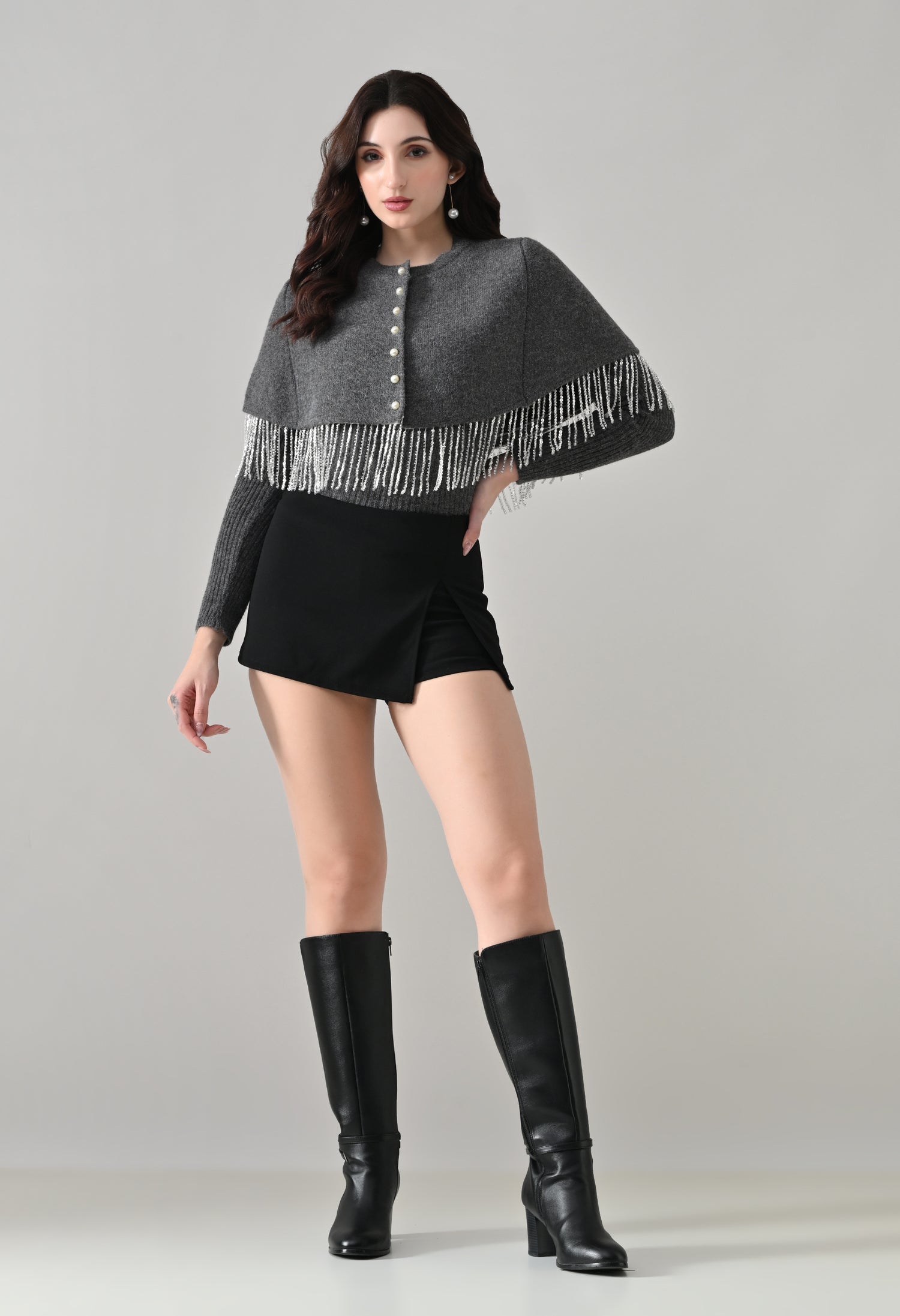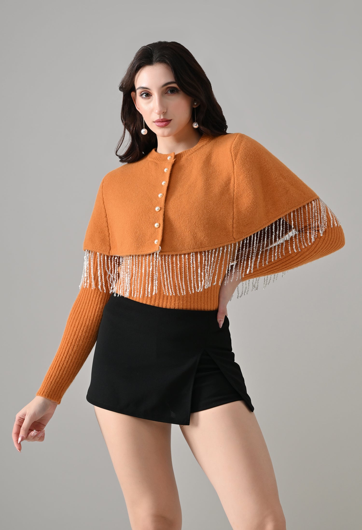 This elegant 2-piece knit set features a chic layered design that blends comfort with statement detailing. The cropped cape-style top comes with a classic round neckline and is accented with off-white pearl front button-down detailing, while silver bead and sequin fringe along the hem adds a touch of shimmer and graceful movement. Paired with a soft, stretchable woolen ribbed knit top, the inner layer offers full-length sleeves and a body-hugging, fitted silhouette that flatters the shape. Finished with a rounded hemline and a regular length, this coordinated set is perfect for creating a polished yet cozy look.