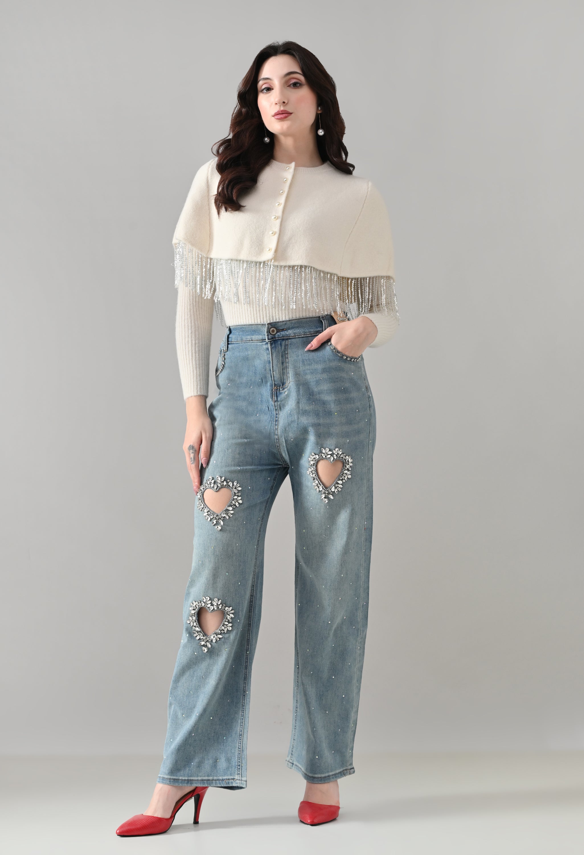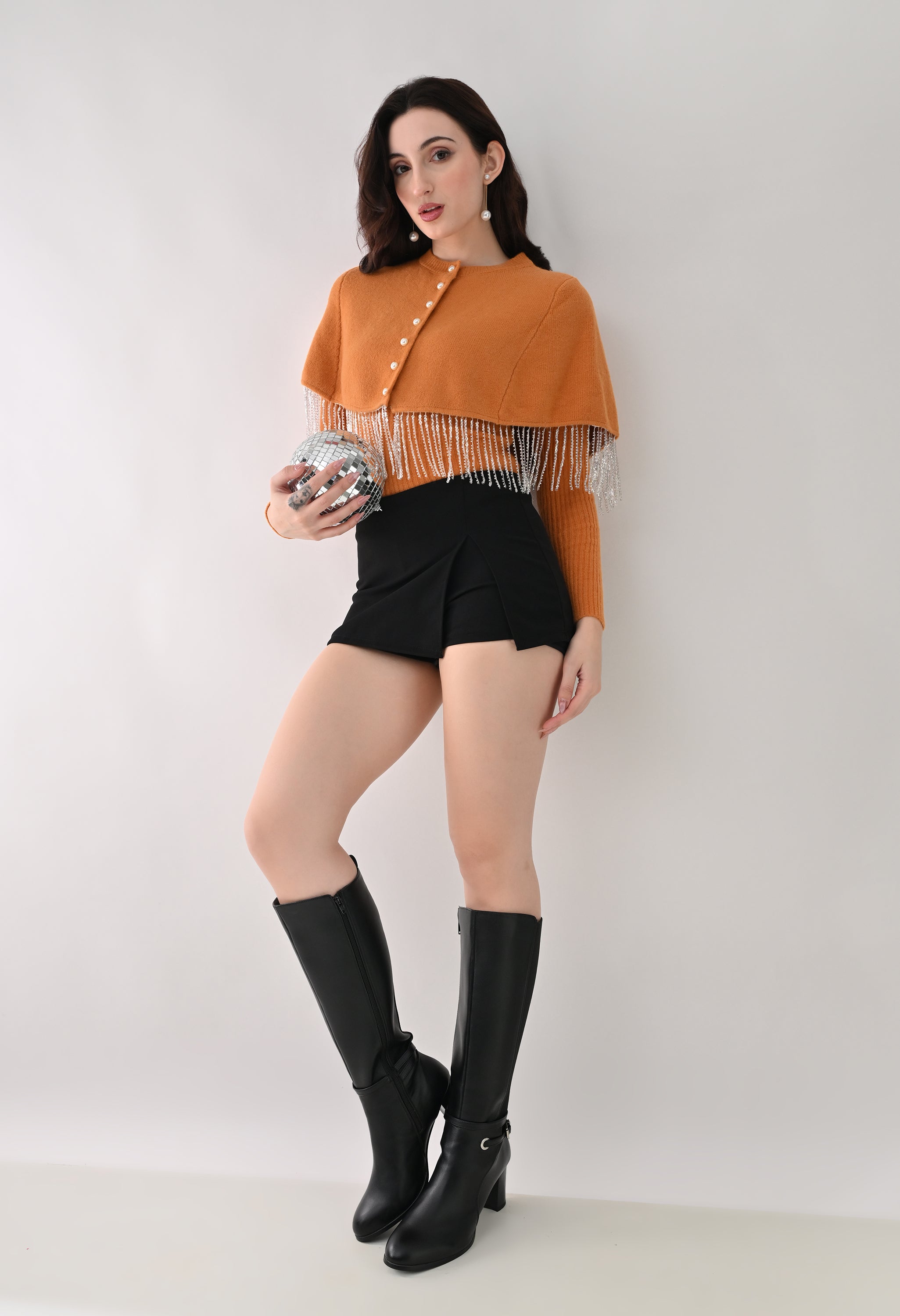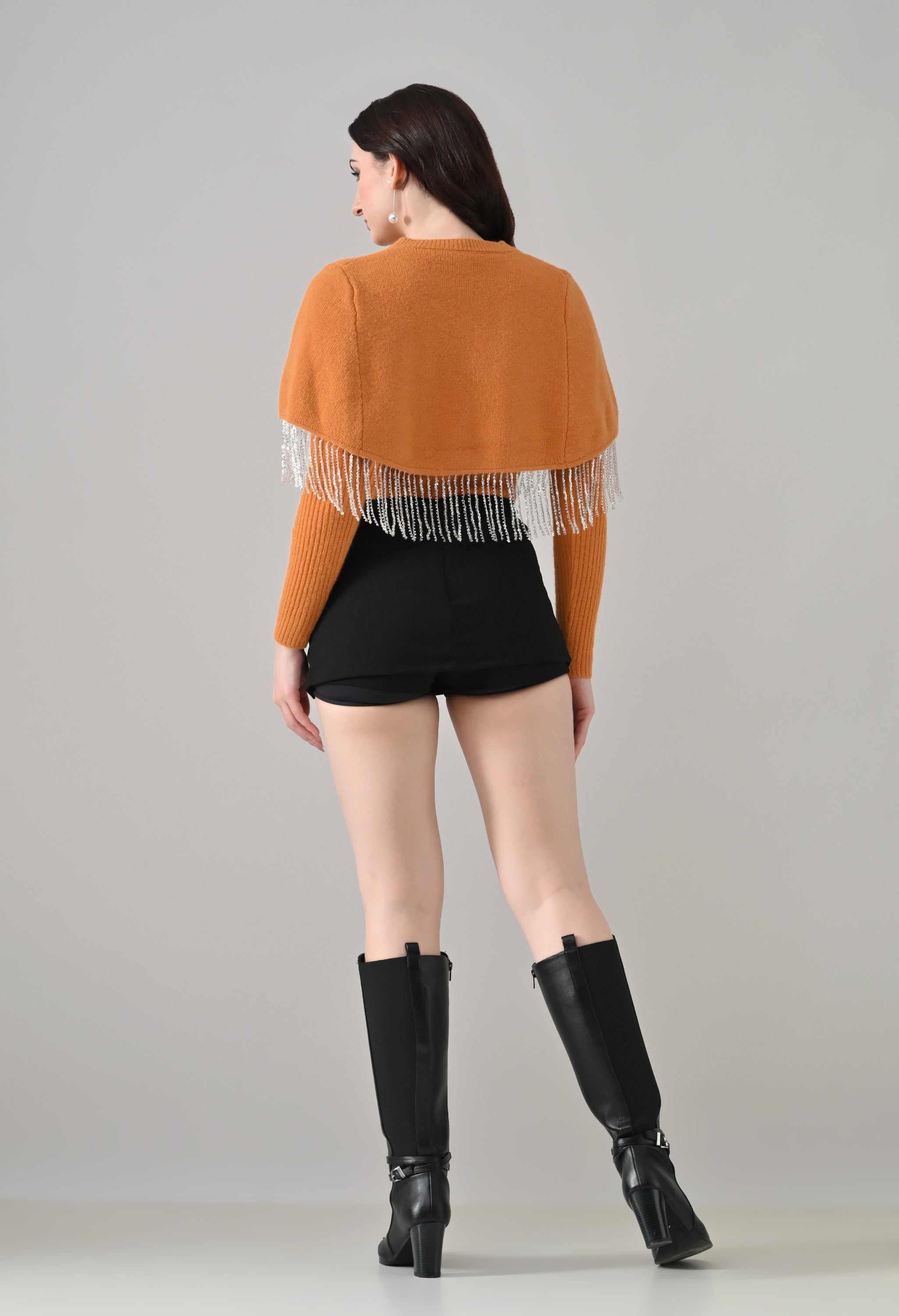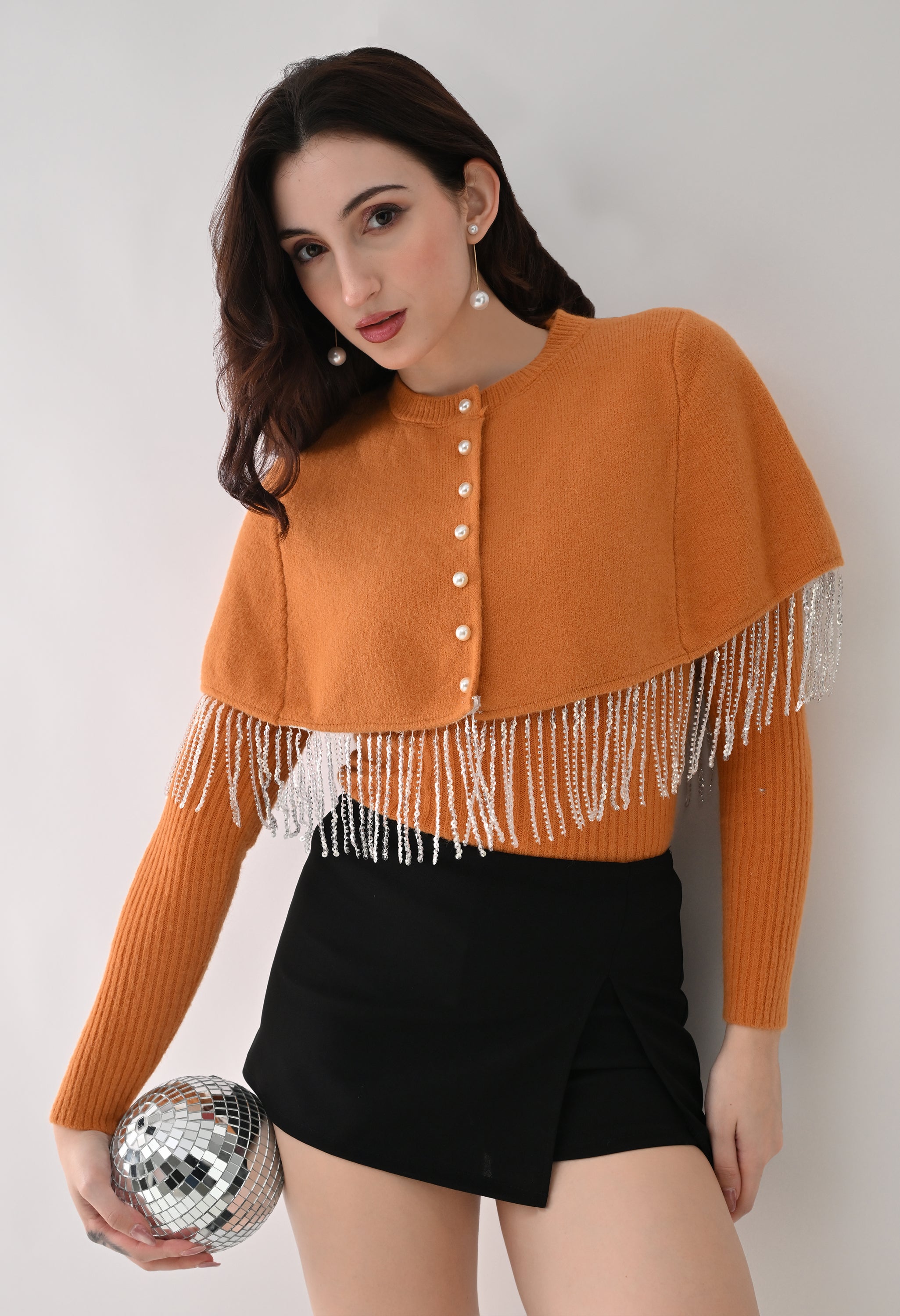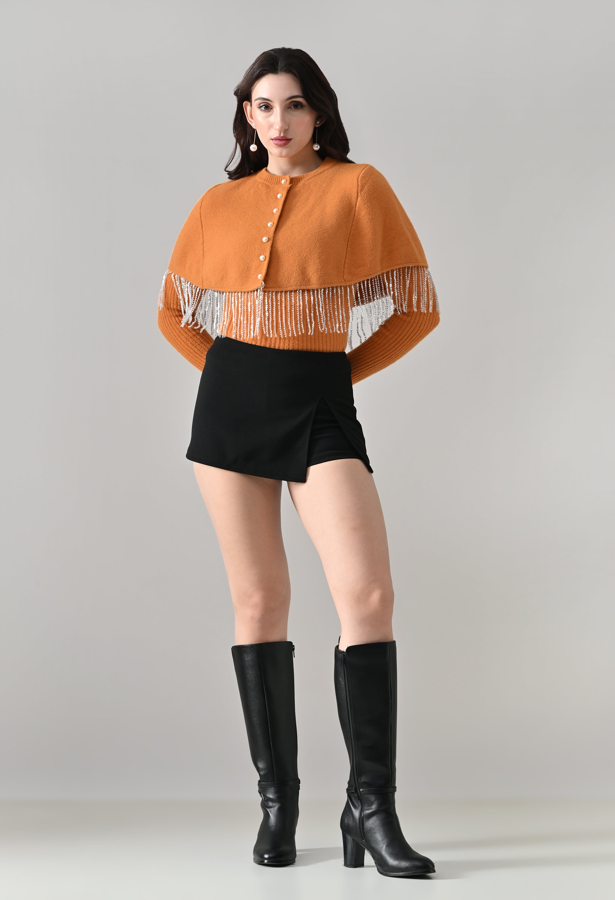 This elegant 2-piece knit set features a chic layered design that blends comfort with statement detailing. The cropped cape-style top comes with a classic round neckline and is accented with off-white pearl front button-down detailing, while silver bead and sequin fringe along the hem adds a touch of shimmer and graceful movement. Paired with a soft, stretchable woolen ribbed knit top, the inner layer offers full-length sleeves and a body-hugging, fitted silhouette that flatters the shape. Finished with a rounded hemline and a regular length, this coordinated set is perfect for creating a polished yet cozy look.