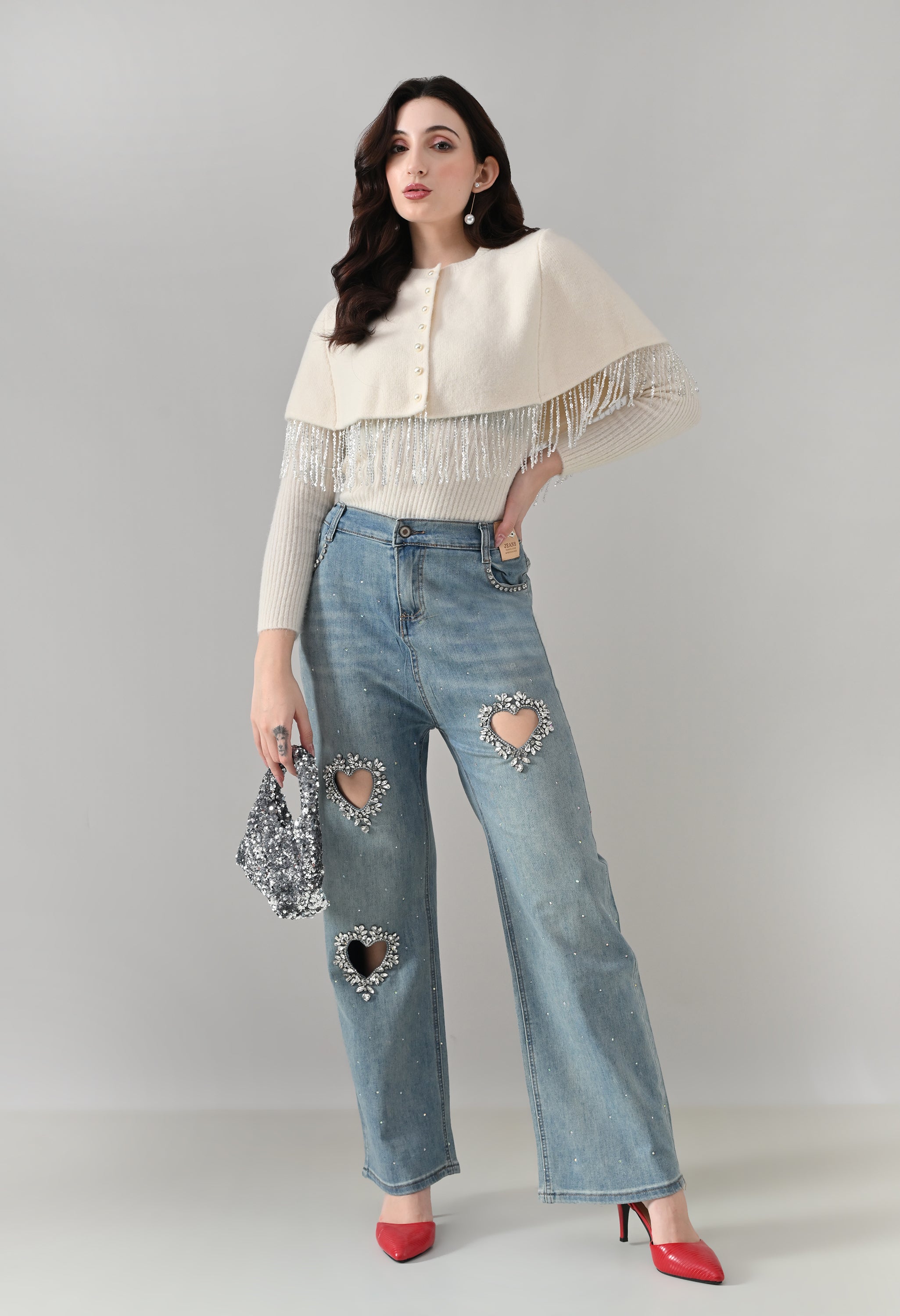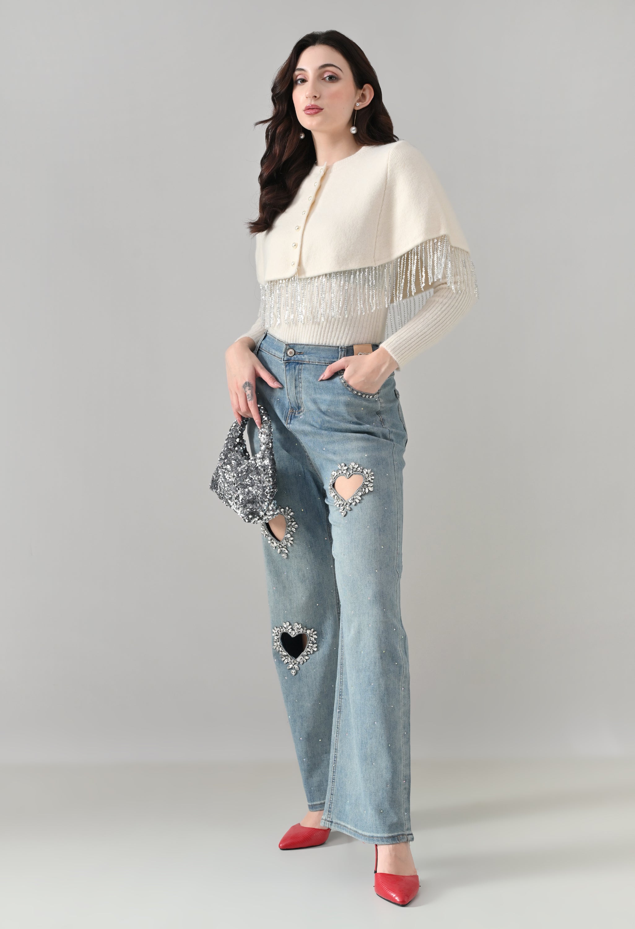 - Silver bead/sequin fringe detailing along the hem