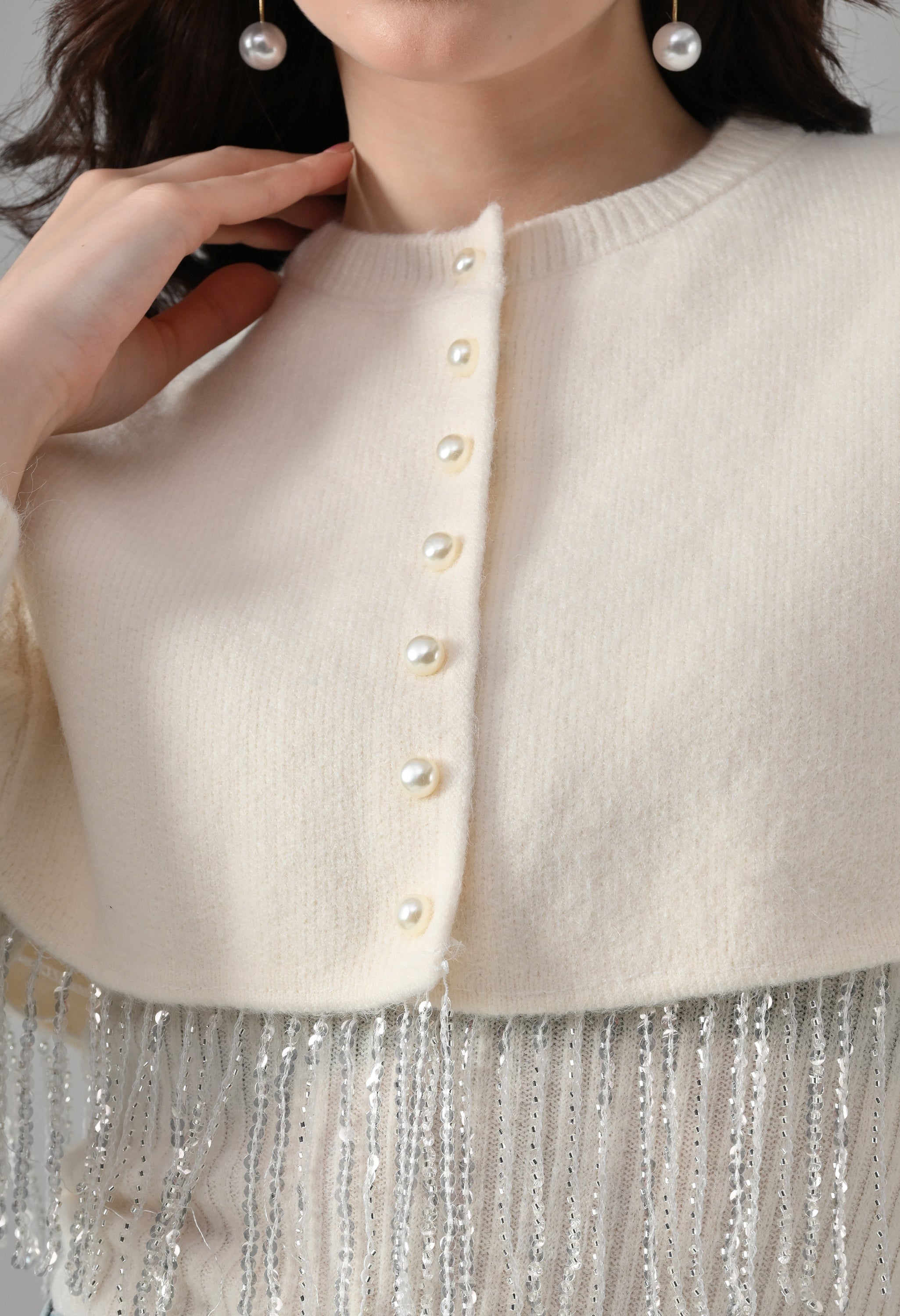 - Off-white imitation pearl front button-down detailing