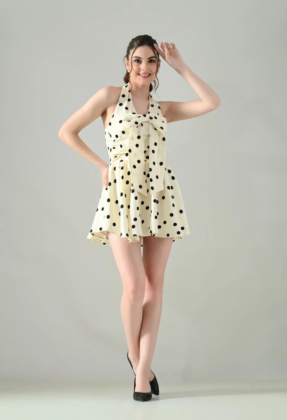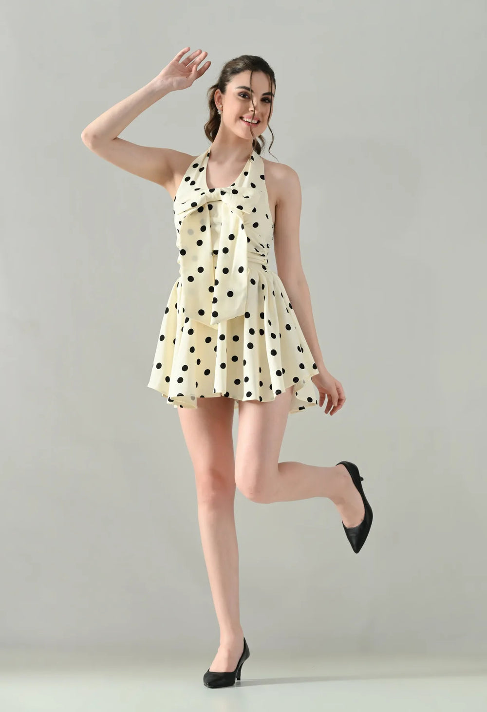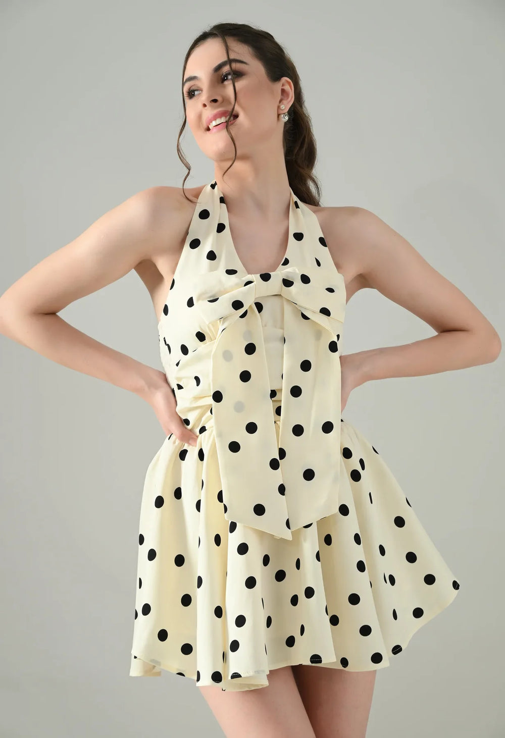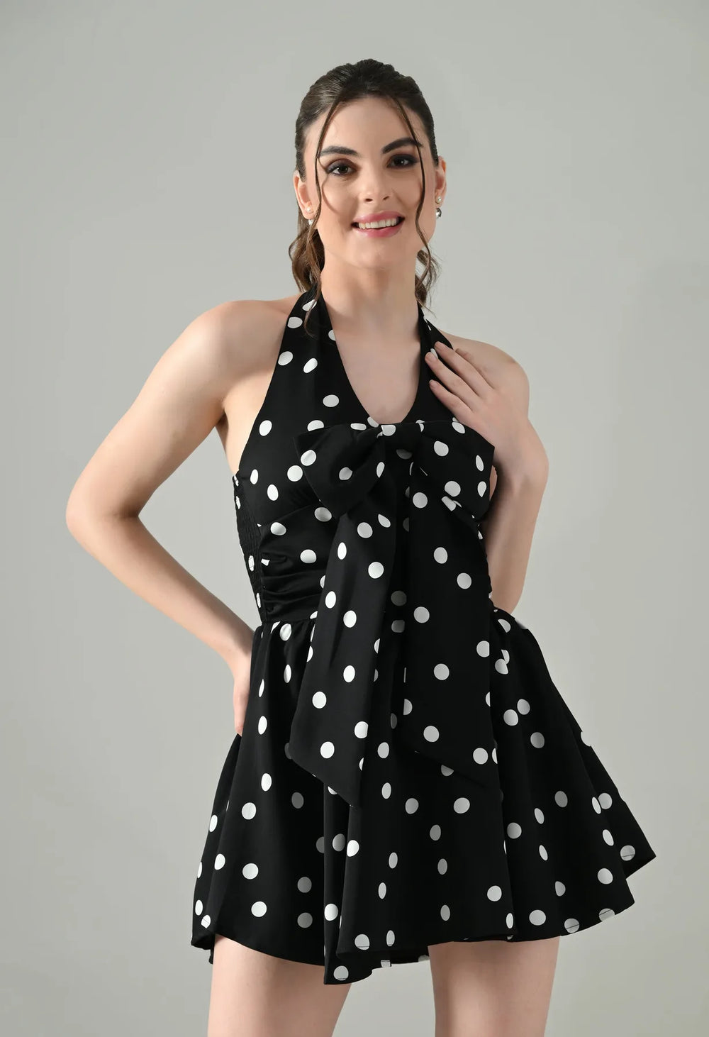 Playful and chic, the Polka Charm Halter Dress is designed in a timeless polka dot print with a flattering halter V-neckline and back button opening. Featuring inner pads, a smocked back, and a flared mini silhouette, it promises both comfort and style. The detachable bow brooch pin adds a versatile statement, while the soft, lined fabric with slight stretch ensures a perfect fit.