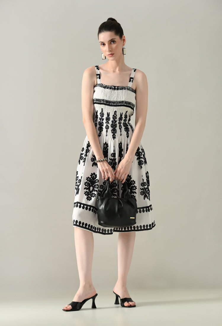 Turn up the charm with this red-and-white printed midi dress featuring wide shoulder straps and a fully smocked bodice for a flattering fit. Designed with ikat-inspired motifs and bold geometric patterns, it flows into a midi-length skirt finished with a contrasting printed border. A versatile piece perfect for casual brunches or vacation evenings.