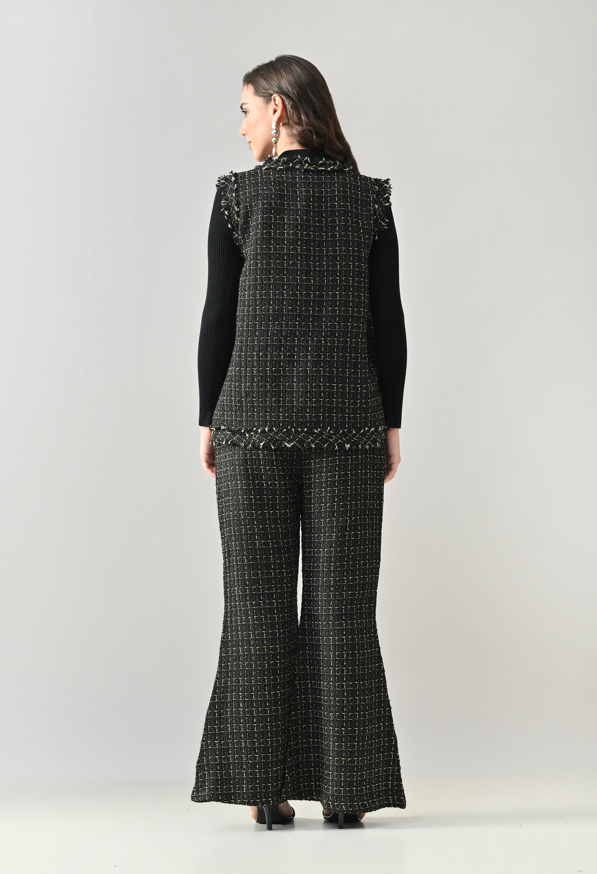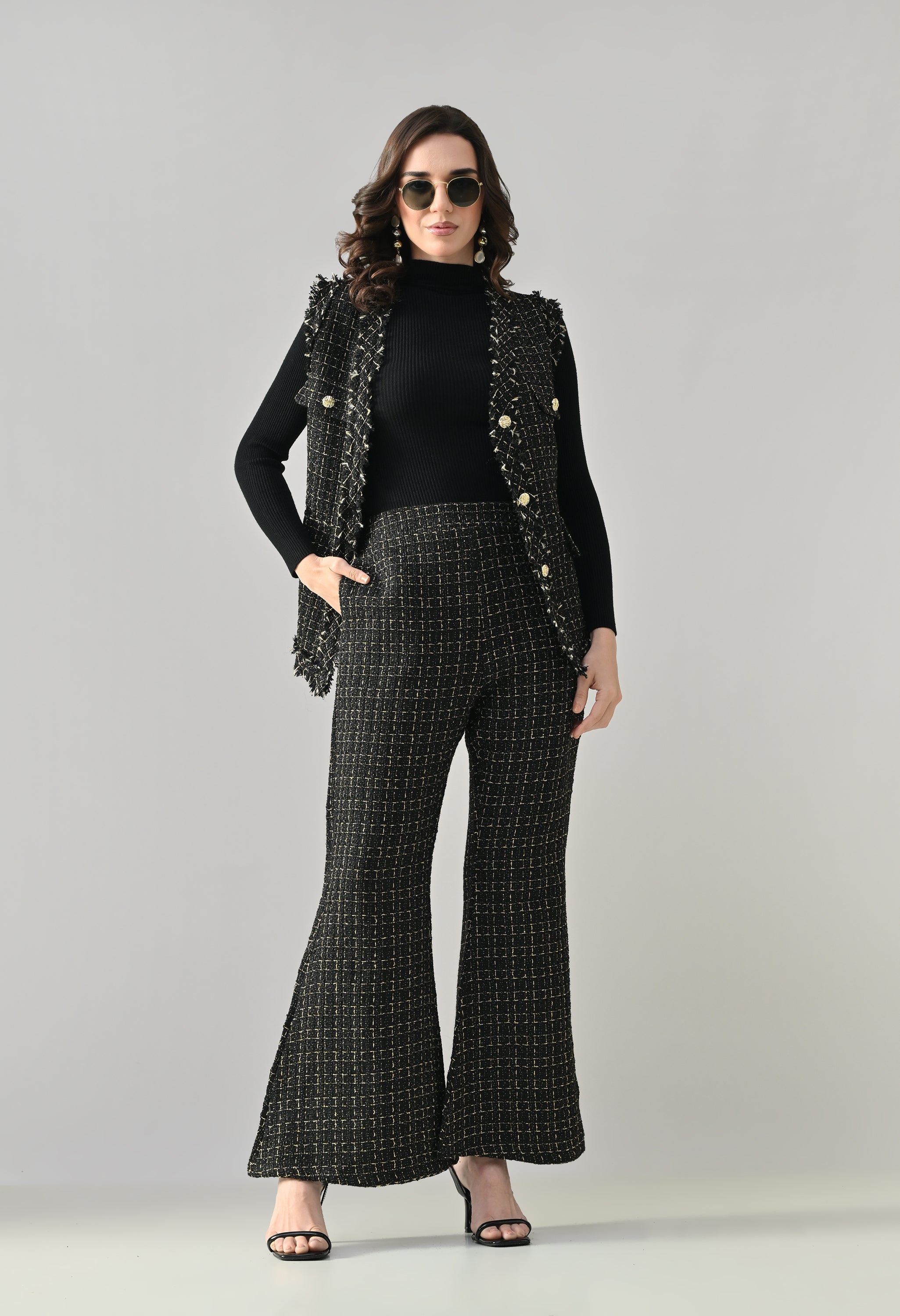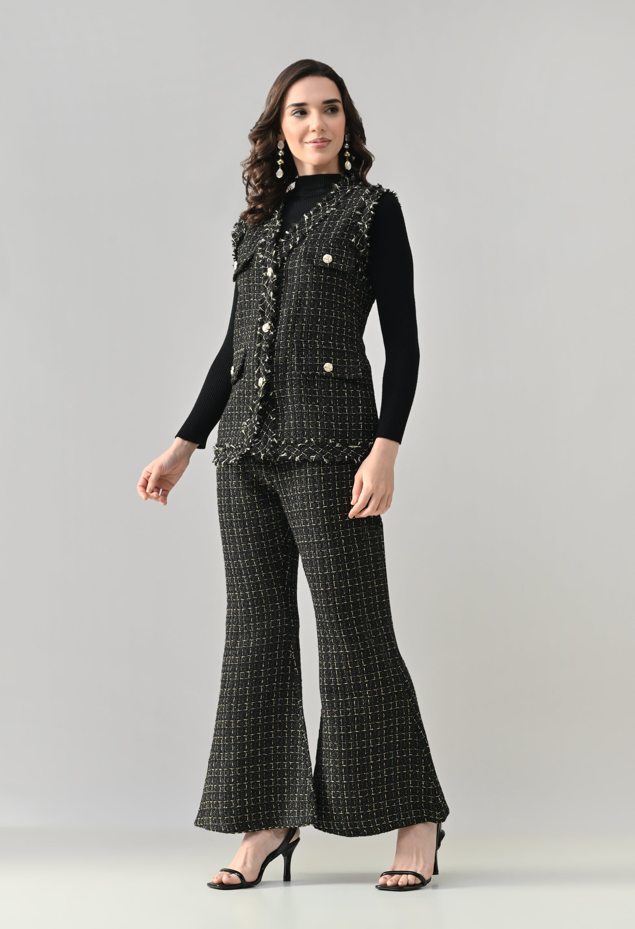 This stylish 3-piece tweed co-ord set delivers a refined yet contemporary look with its structured tailoring and layered styling. The sleeveless tweed vest features a sharp V-neckline and statement gold metallic buttons, enhanced with showy flap pockets for a luxe finish. Paired with matching tweed bell-bottom pants, the set offers a flattering silhouette with practical details for comfort. Completing the look is a stretchable ribbed black inner top with a high neck and full sleeves, adding contrast and versatility—perfect for chic day outings or elevated casual wear.