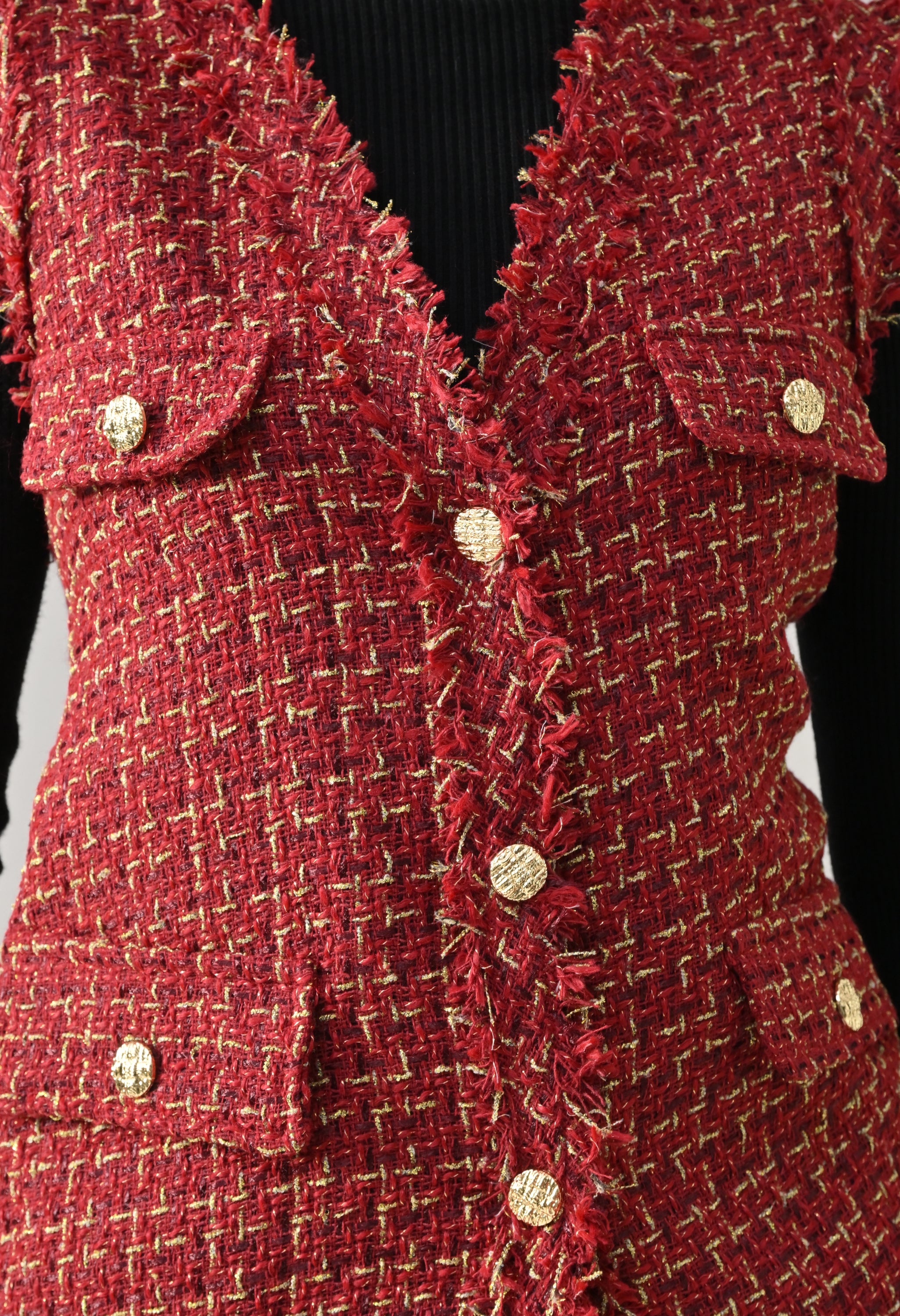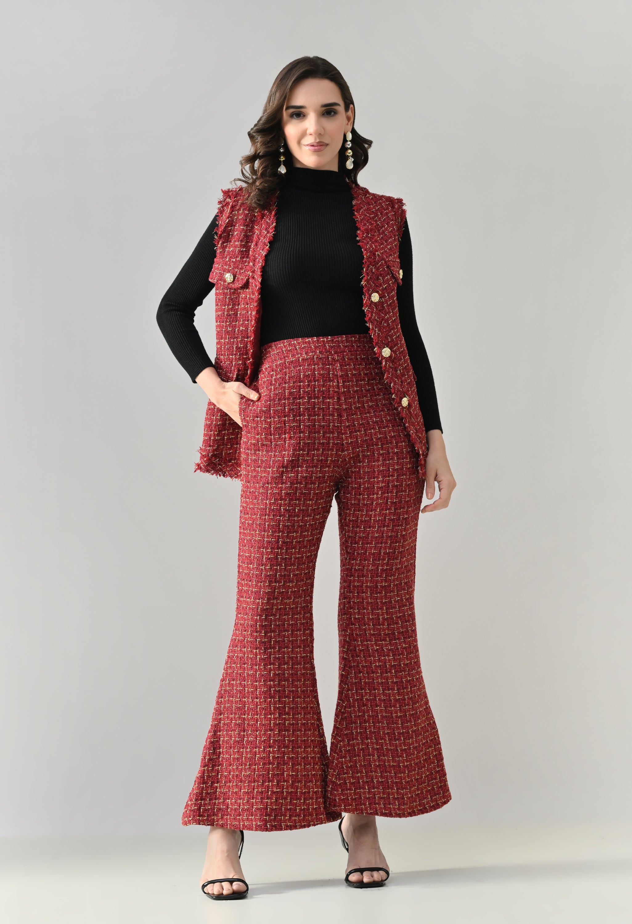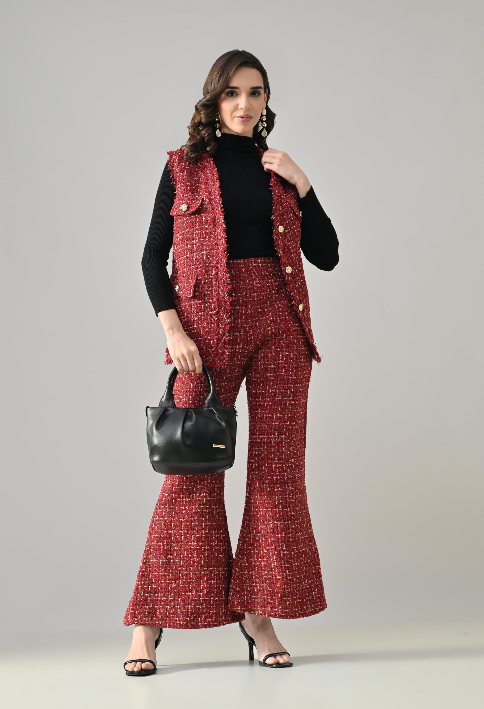This stylish 3-piece tweed co-ord set delivers a refined yet contemporary look with its structured tailoring and layered styling. The sleeveless tweed vest features a sharp V-neckline and statement gold metallic buttons, enhanced with showy flap pockets for a luxe finish. Paired with matching tweed bell-bottom pants, the set offers a flattering silhouette with practical details for comfort. Completing the look is a stretchable ribbed black inner top with a high neck and full sleeves, adding contrast and versatility—perfect for chic day outings or elevated casual wear.