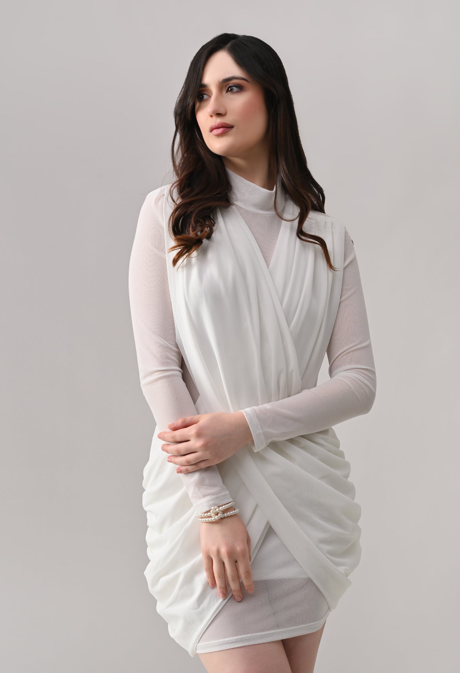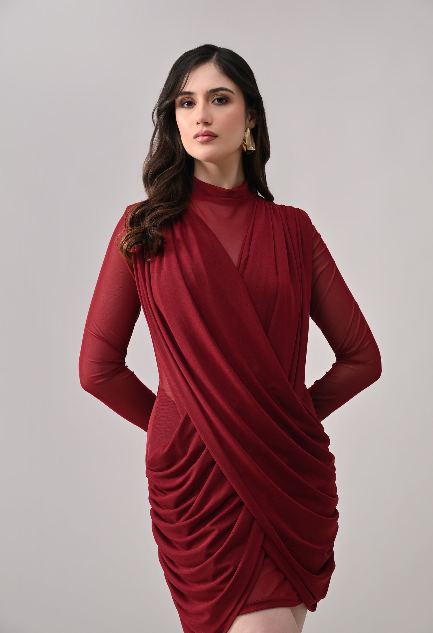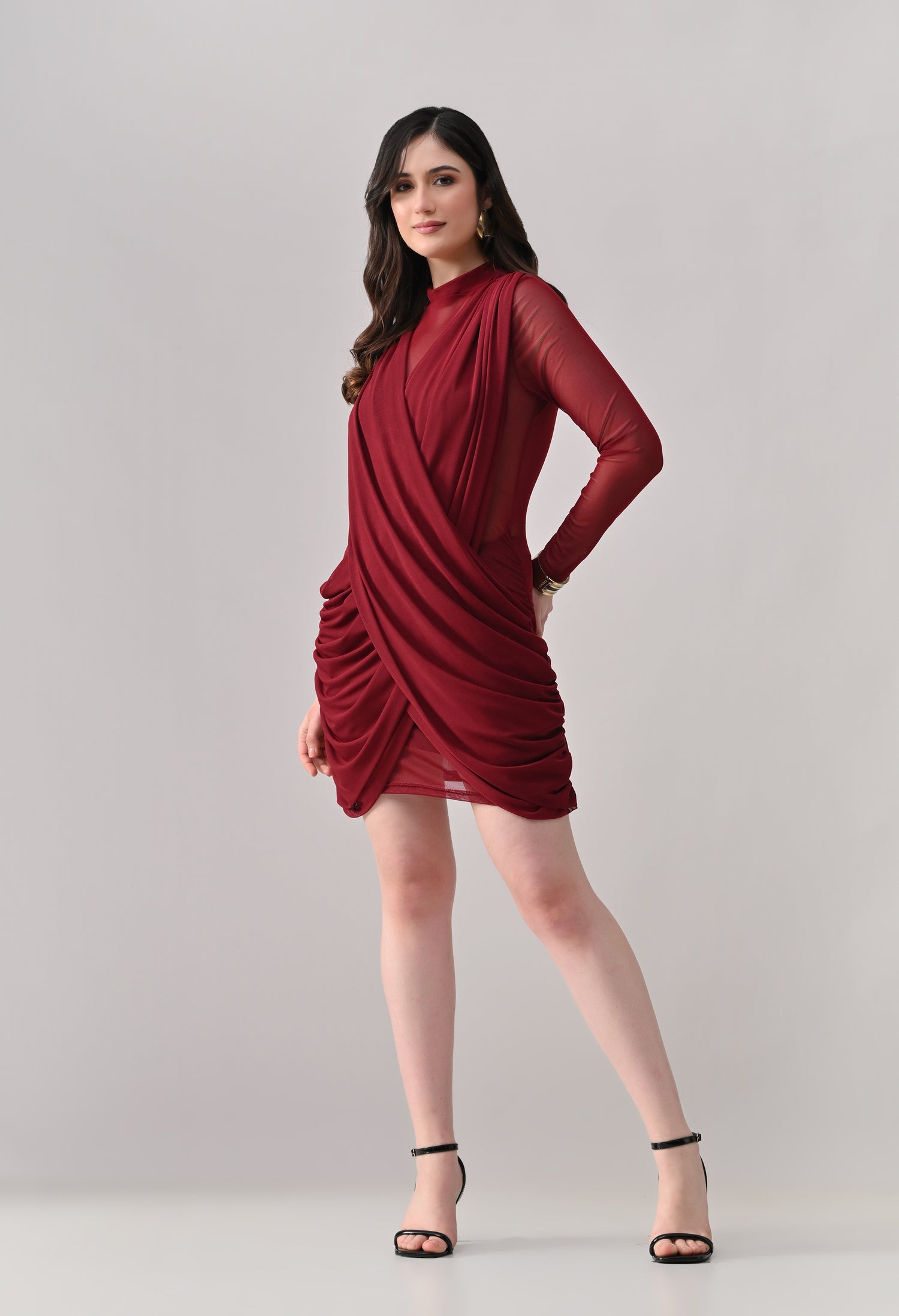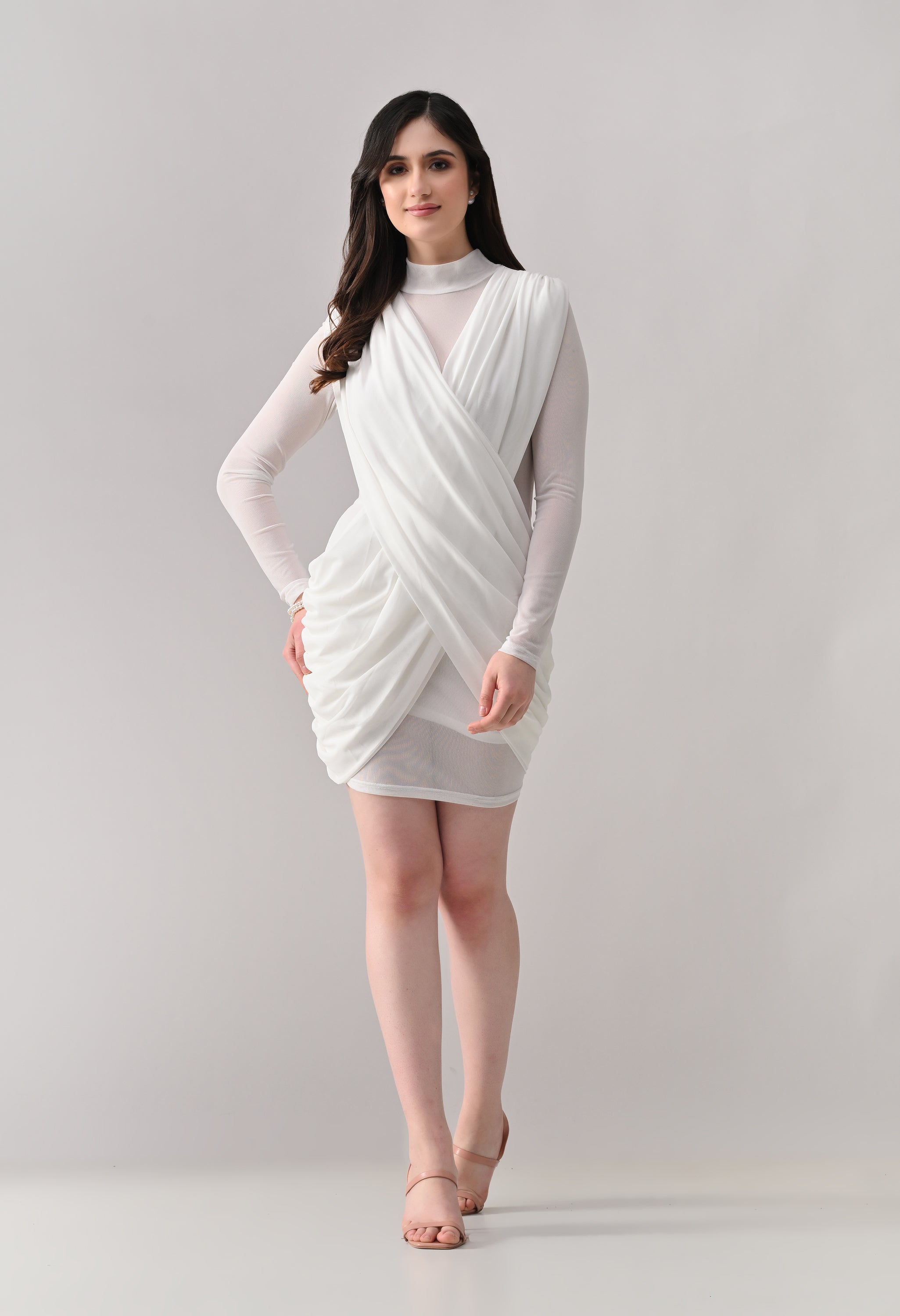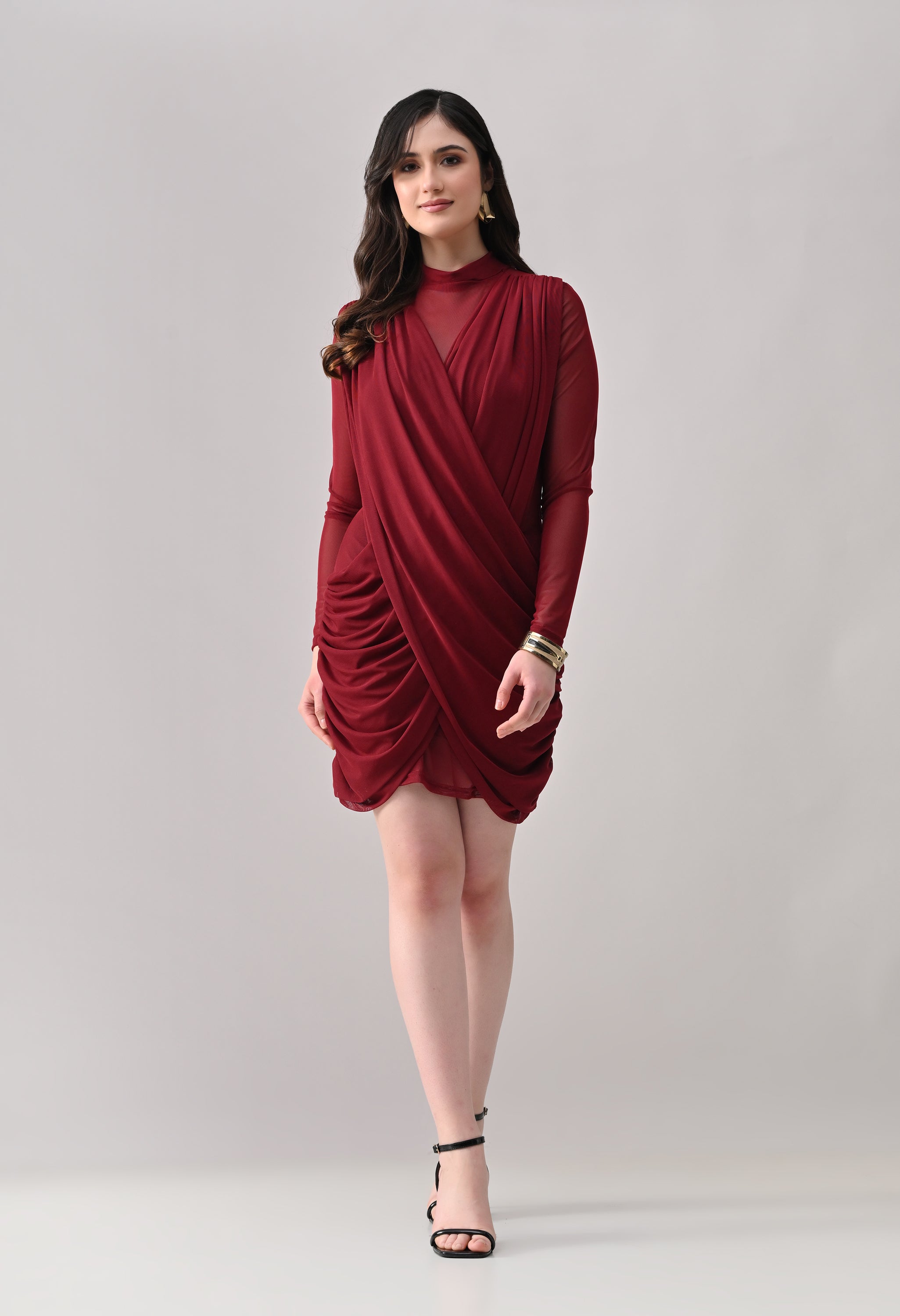 This mini dress blends elegance with modern detailing. Designed in a lightweight, stretch mesh fabric, it features a high neckline with sheer full sleeves that add a refined touch. The front showcases a beautifully draped, crossover overlay that creates a flattering wrap-effect silhouette. The fitted inner lining enhances shape, while ruched detailing along the sides adds texture and accentuates curves. The back maintains a clean, body-hugging finish, giving the dress a sleek and polished look from every angle.