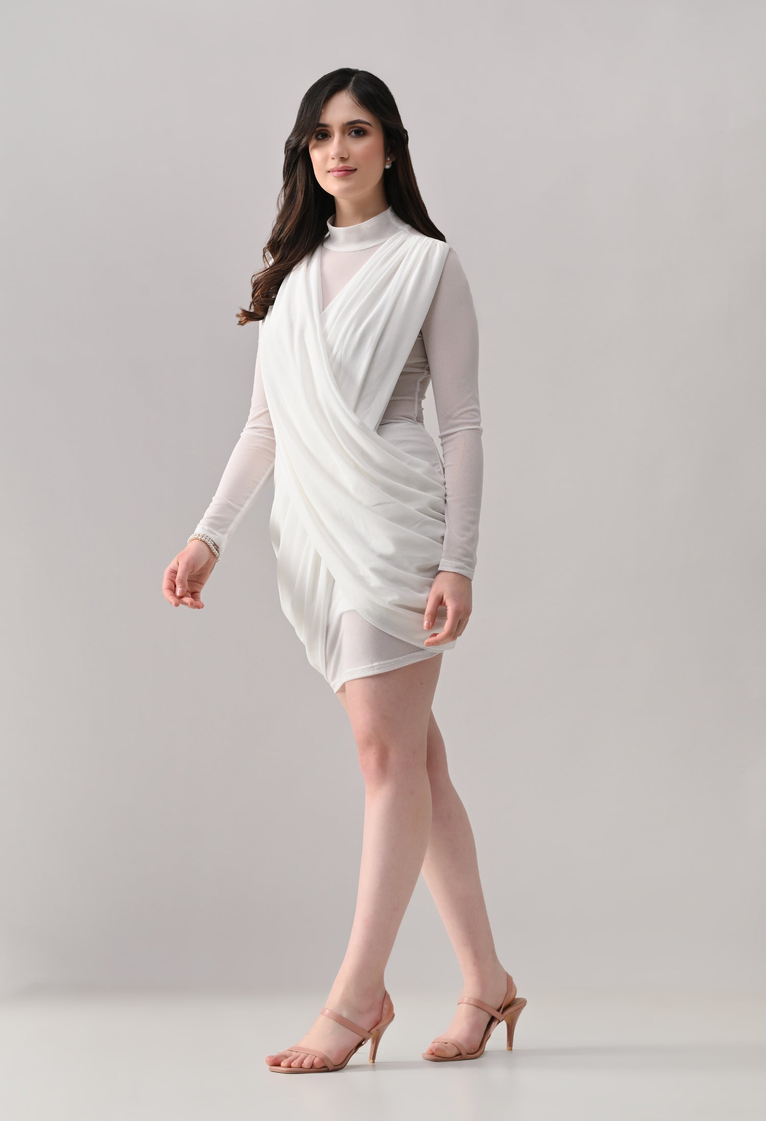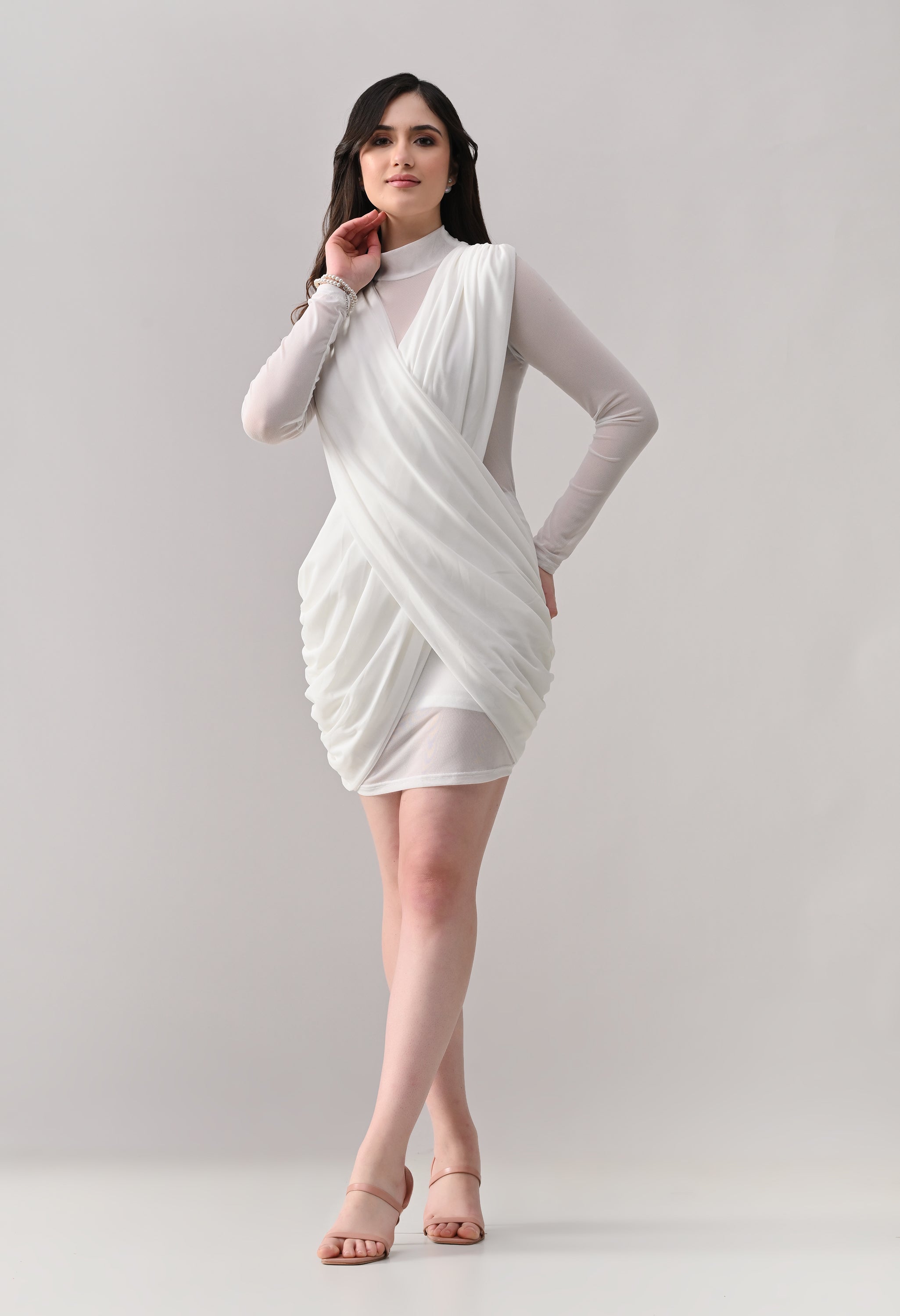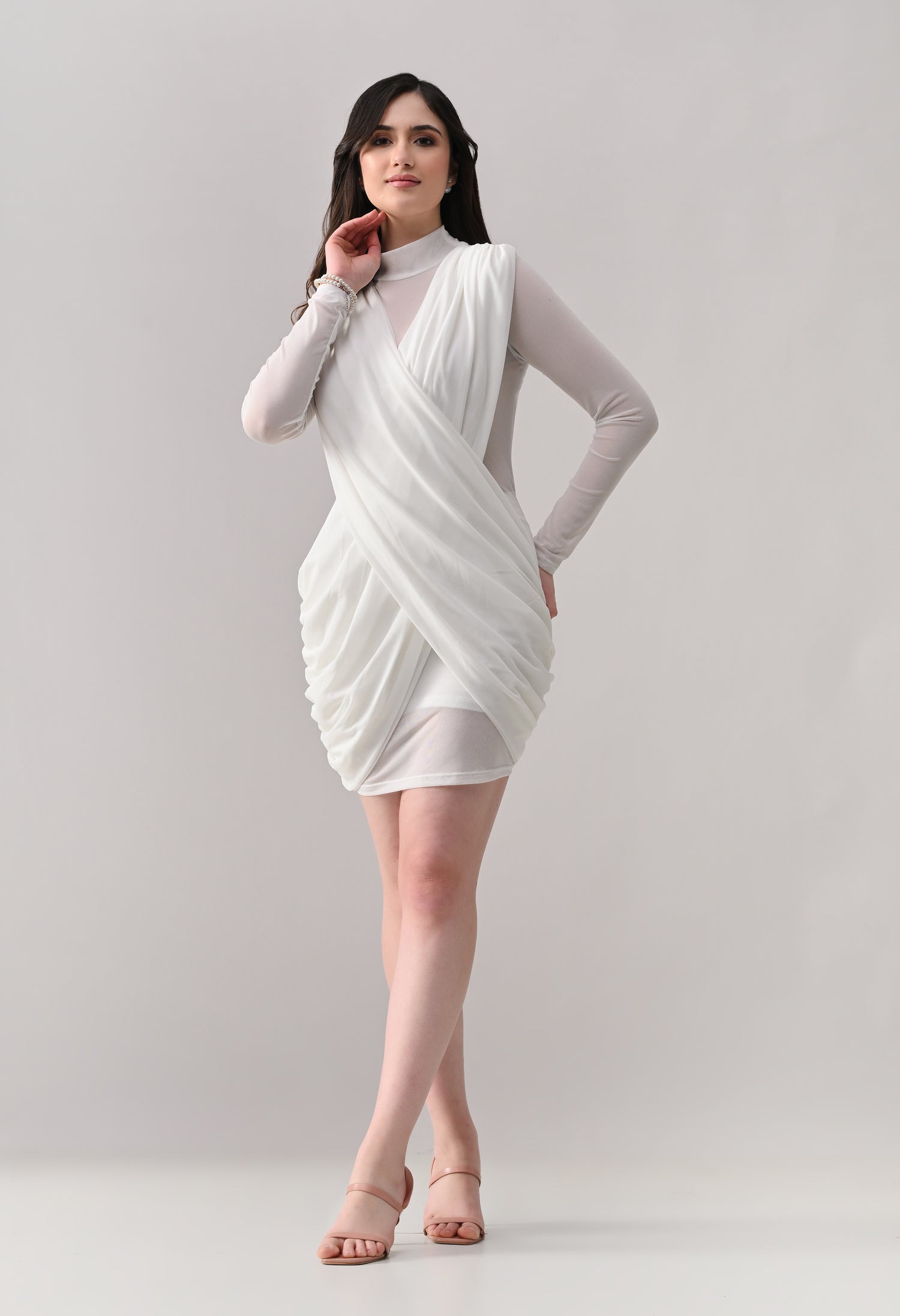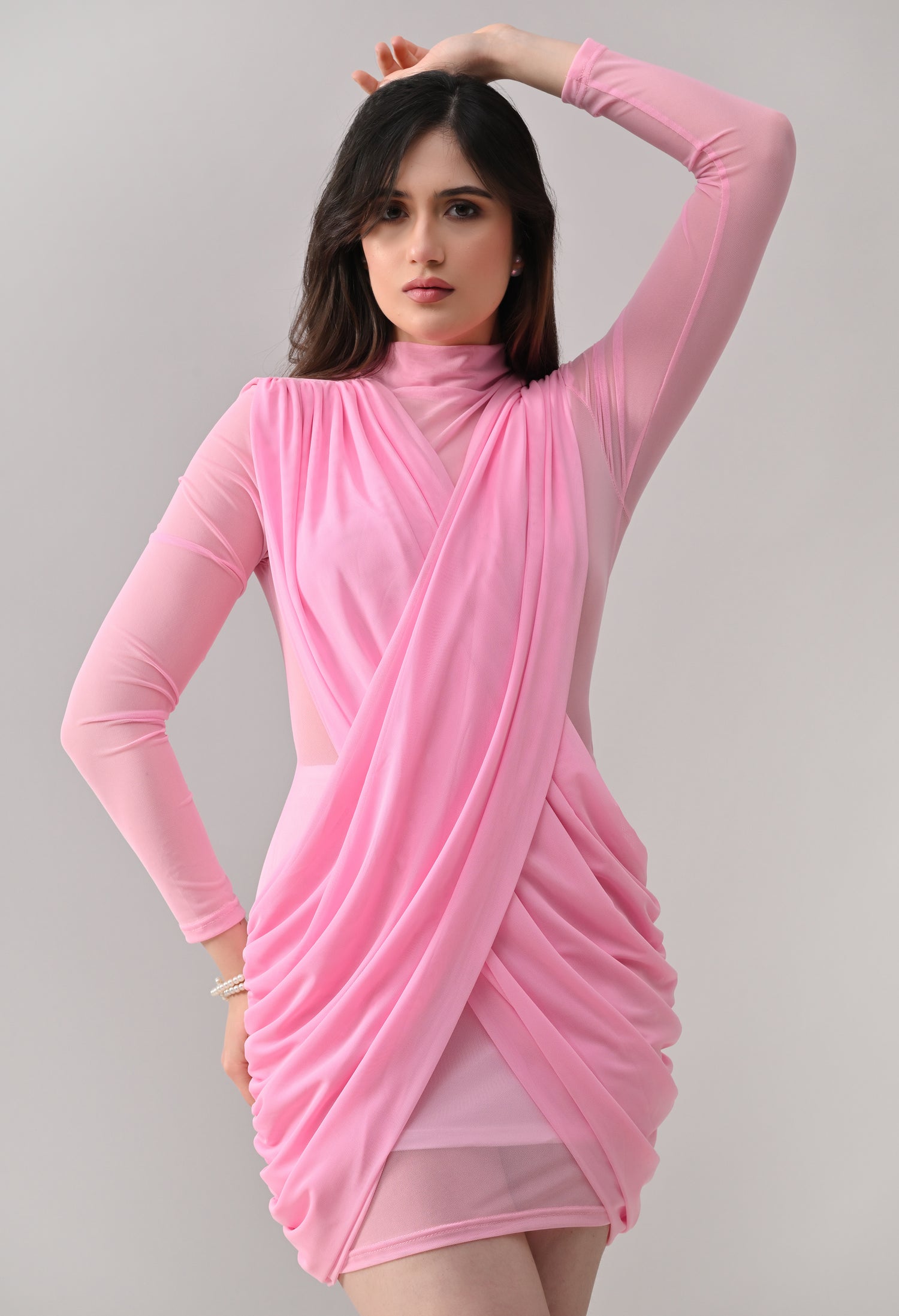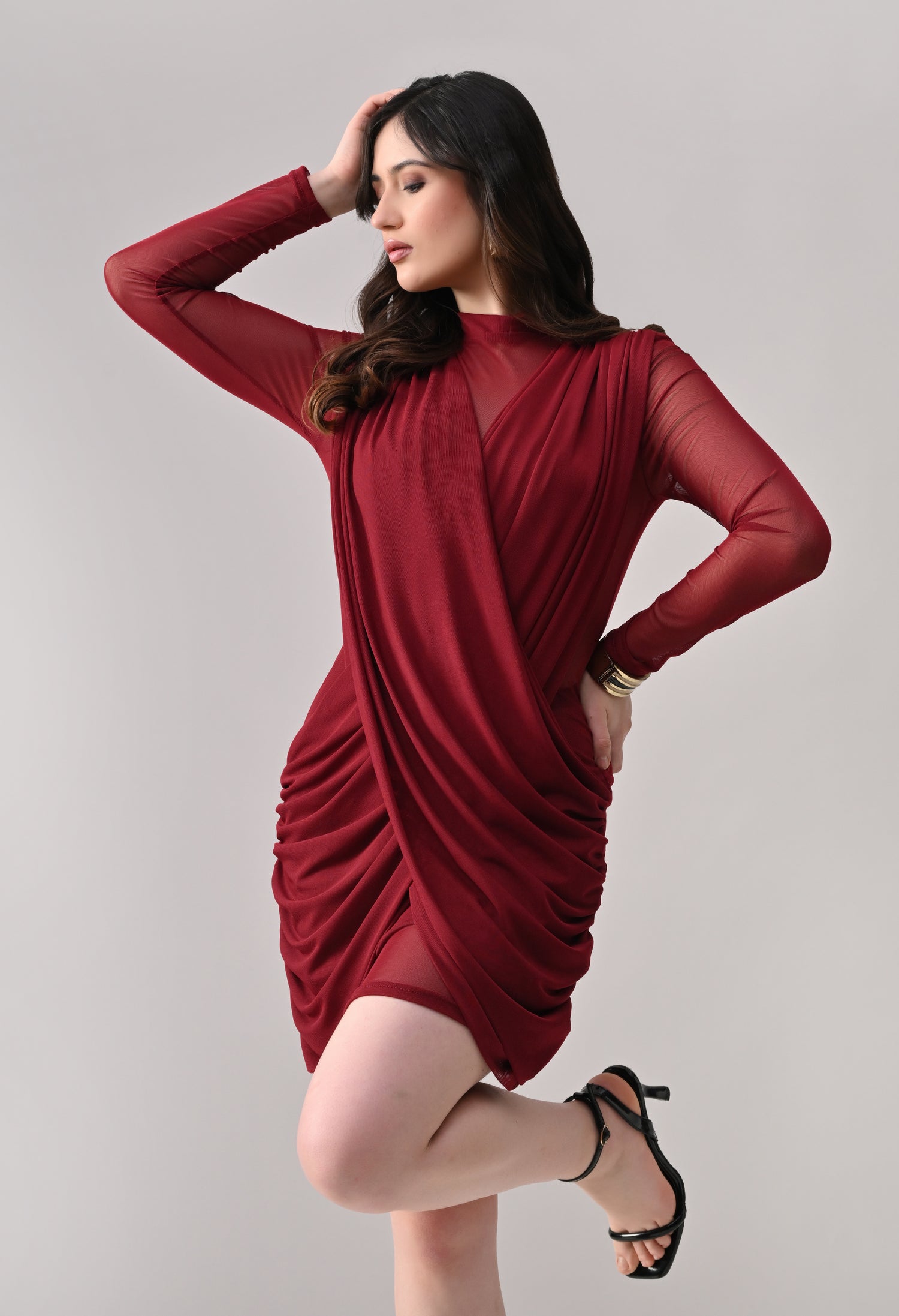 This mini dress blends elegance with modern detailing. Designed in a lightweight, stretch mesh fabric, it features a high neckline with sheer full sleeves that add a refined touch. The front showcases a beautifully draped, crossover overlay that creates a flattering wrap-effect silhouette. The fitted inner lining enhances shape, while ruched detailing along the sides adds texture and accentuates curves. The back maintains a clean, body-hugging finish, giving the dress a sleek and polished look from every angle.