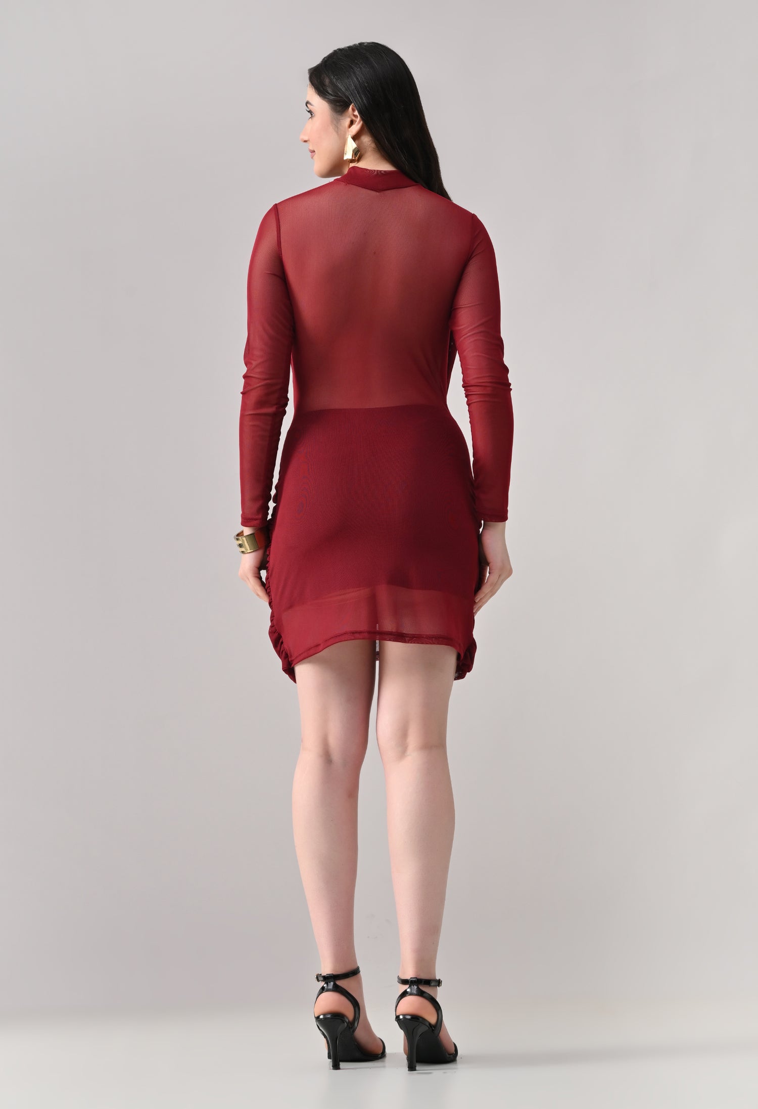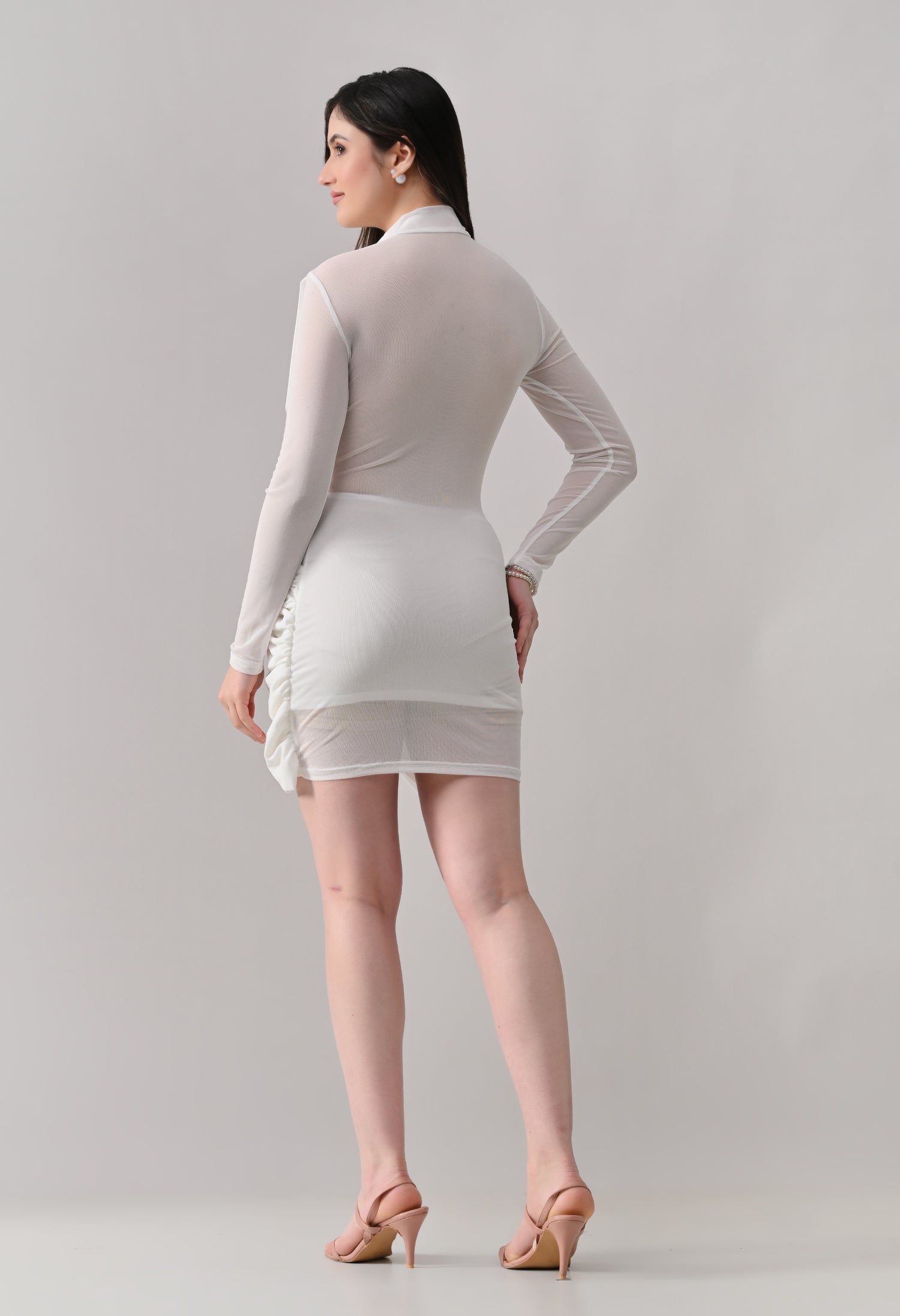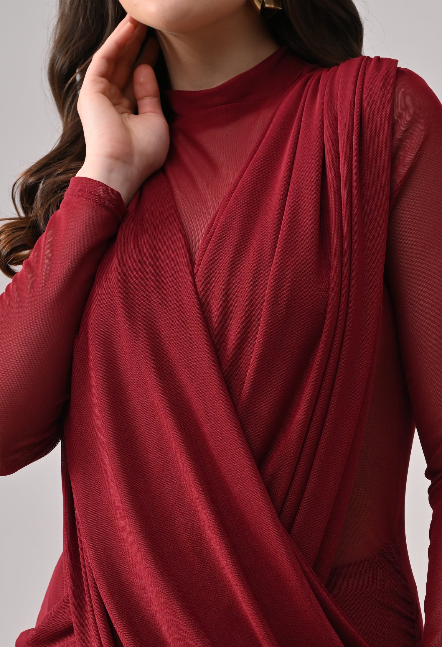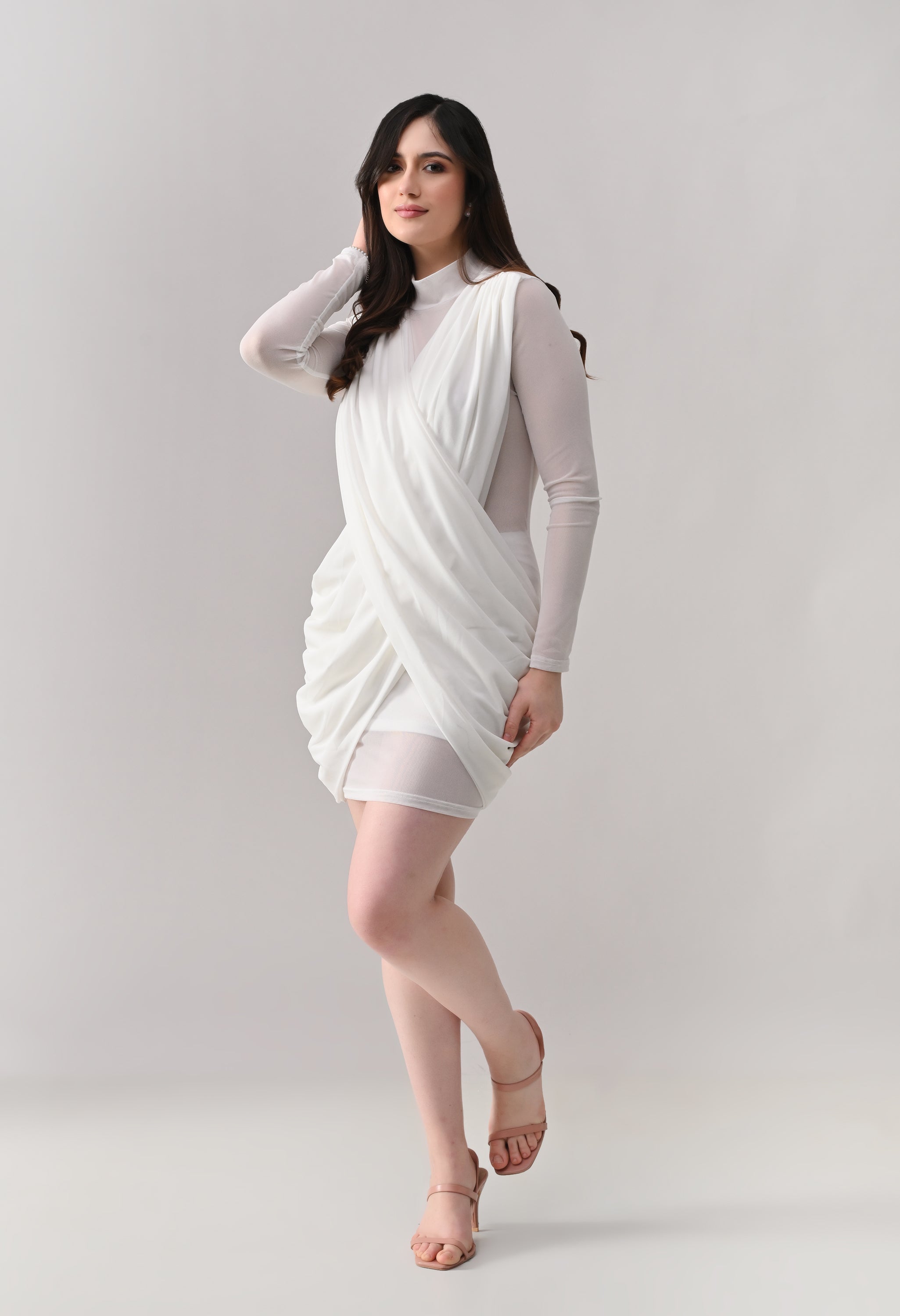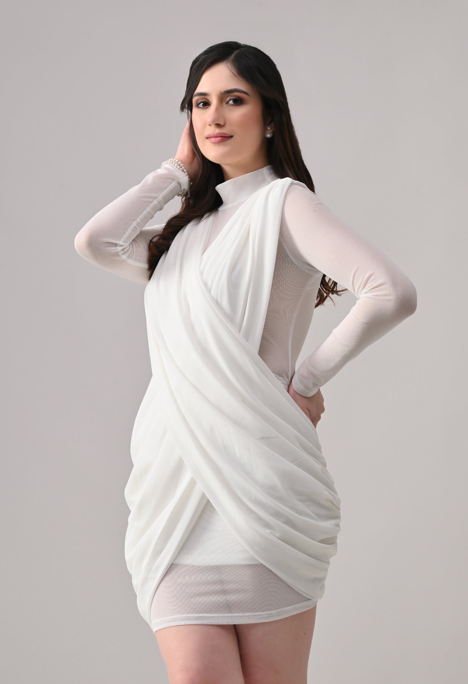 This mini dress blends elegance with modern detailing. Designed in a lightweight, stretch mesh fabric, it features a high neckline with sheer full sleeves that add a refined touch. The front showcases a beautifully draped, crossover overlay that creates a flattering wrap-effect silhouette. The fitted inner lining enhances shape, while ruched detailing along the sides adds texture and accentuates curves. The back maintains a clean, body-hugging finish, giving the dress a sleek and polished look from every angle.