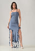 Make a bold entrance in this body-hugging dress featuring double high slits accentuated with cascading ruffles. Designed with soft stretchable fabric and delicate spaghetti straps, it hugs your curves in all the right places. Perfect for nights that demand attention and style that speaks volumes.