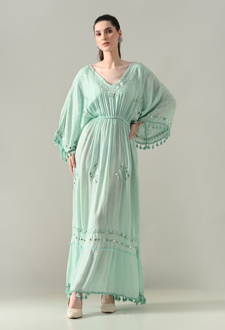 Breezy, radiant, and effortlessly elegant—the Seafoam Mirage Kaftan Maxi is your ultimate statement for laid-back glamour. Crafted in a soft mint hue with subtle metallic stripes, it features mirror embellishments and playful tassel trims that catch the light with every move. The cinched waist flatters while wide kimono sleeves add drama, making it perfect for beach getaways, poolside lounging, or evening soirées.