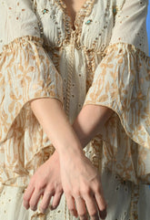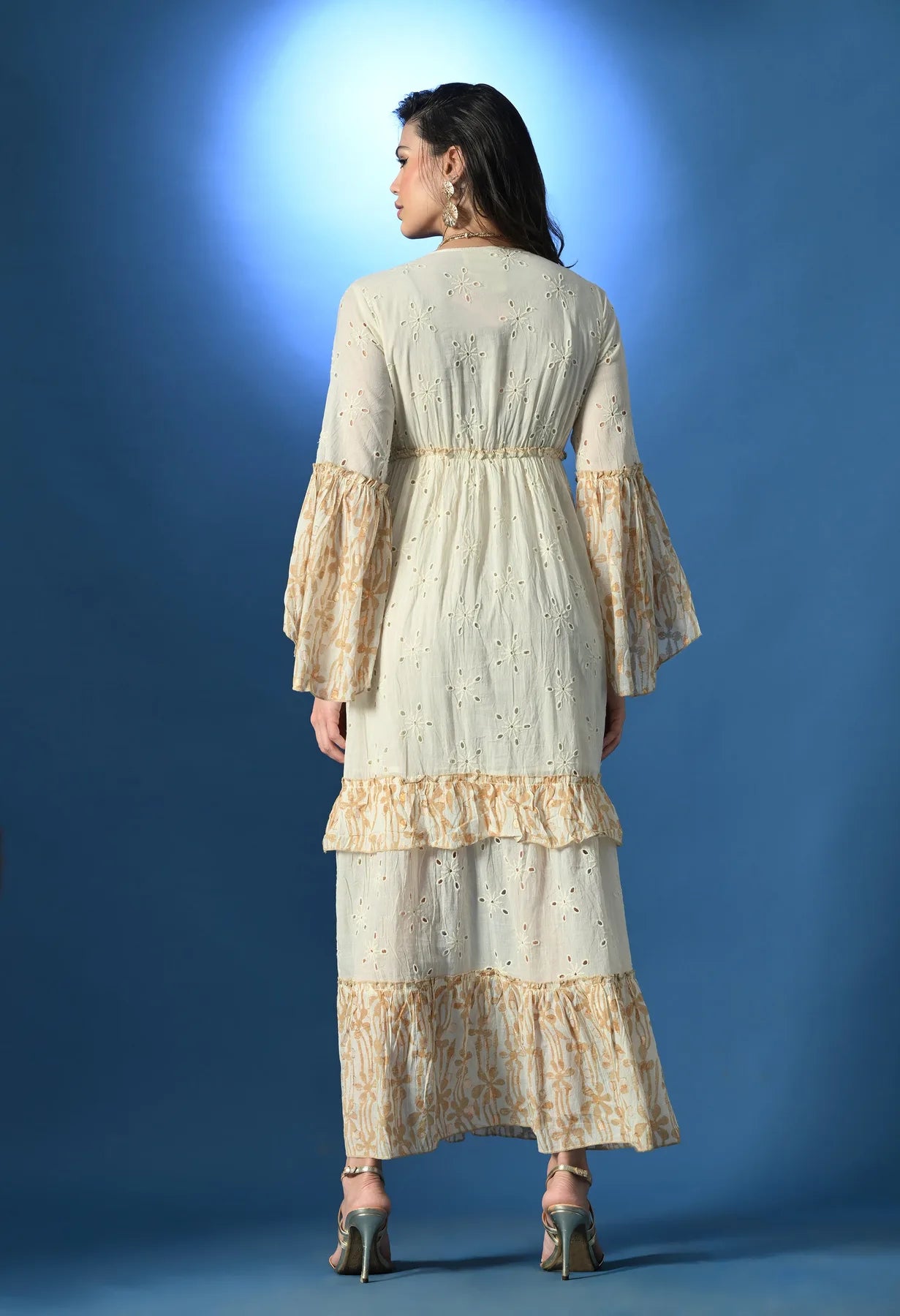 The Serenity Maxi Dress is thoughtfully designed for the woman who's poised yet unyielding. Woven in earthy symphony of ivory and softened browns with a touch of blue sequins, this dress commands presence, effortlessly. Tailored in schiffli fabric, this maxi dress embodies a very grounded persona.