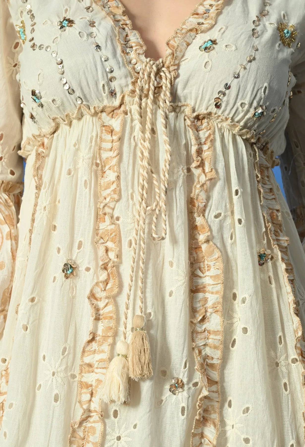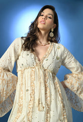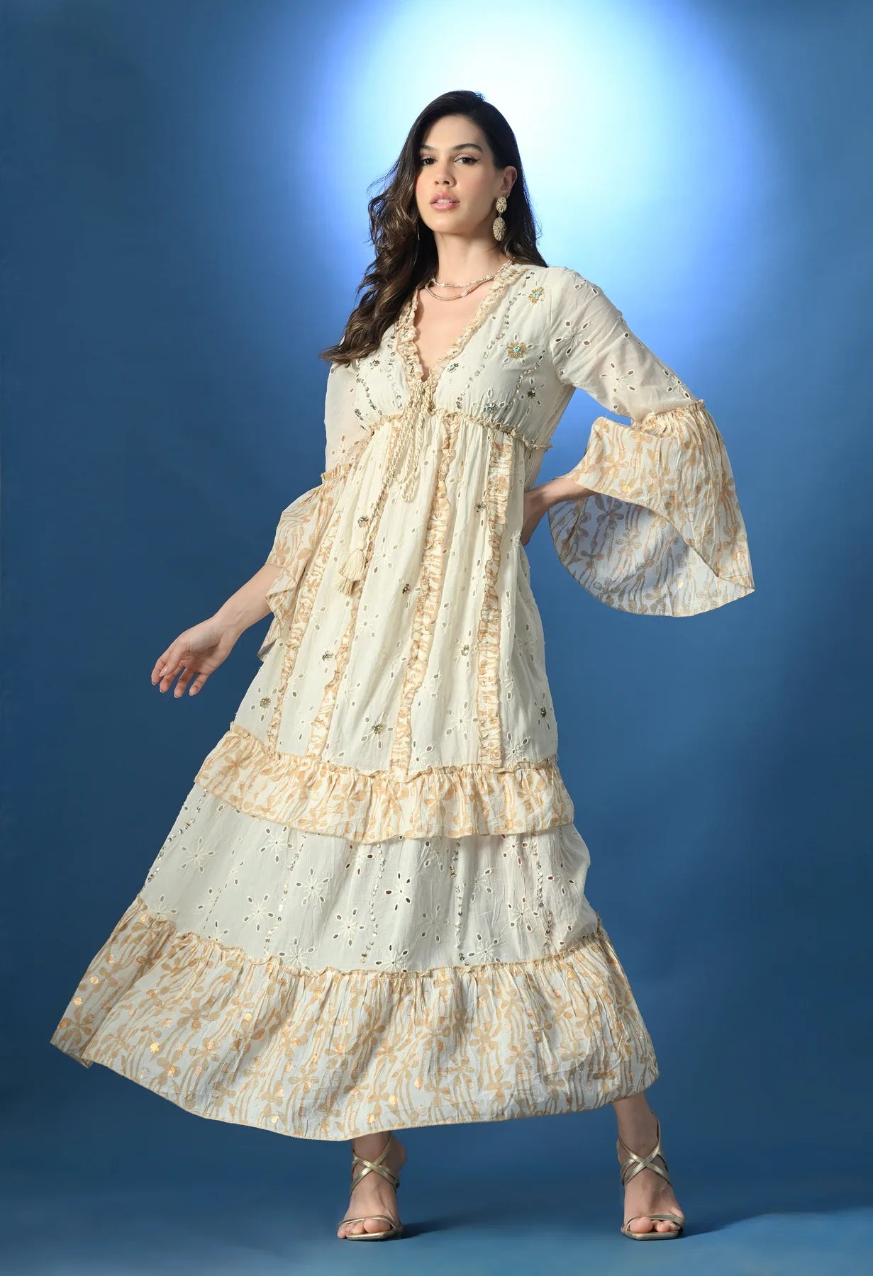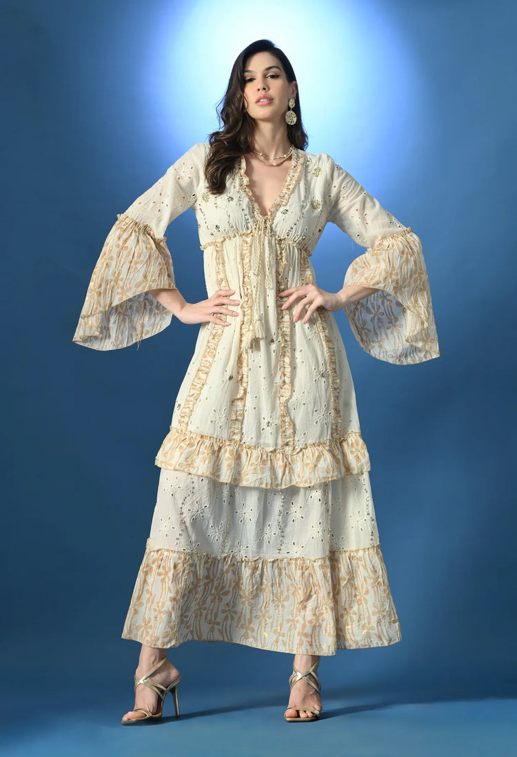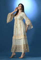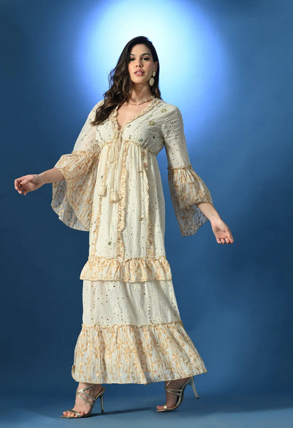 Step into effortless elegance with this beautifully crafted maxi dress. Featuring a V-neckline with tassel ties, elasticated bust, and an embellished gathered front detailed with sequin and bead work, it exudes artisanal charm. The cut-and-sew panels create graceful silhouettes, while bell sleeves with lurex accents add a feminine divinity. Made from airy schiffley fabric with partial lining, this soft, breezy, stretchable dress is a harmony of ease and chic - perfect for casual outings and special occasions.