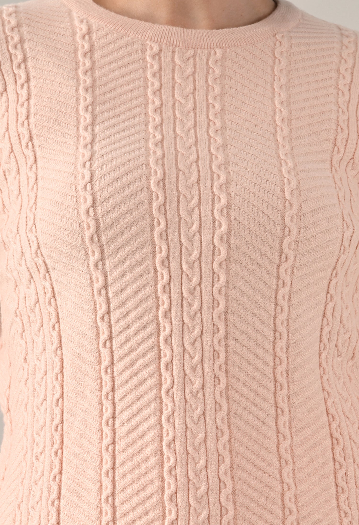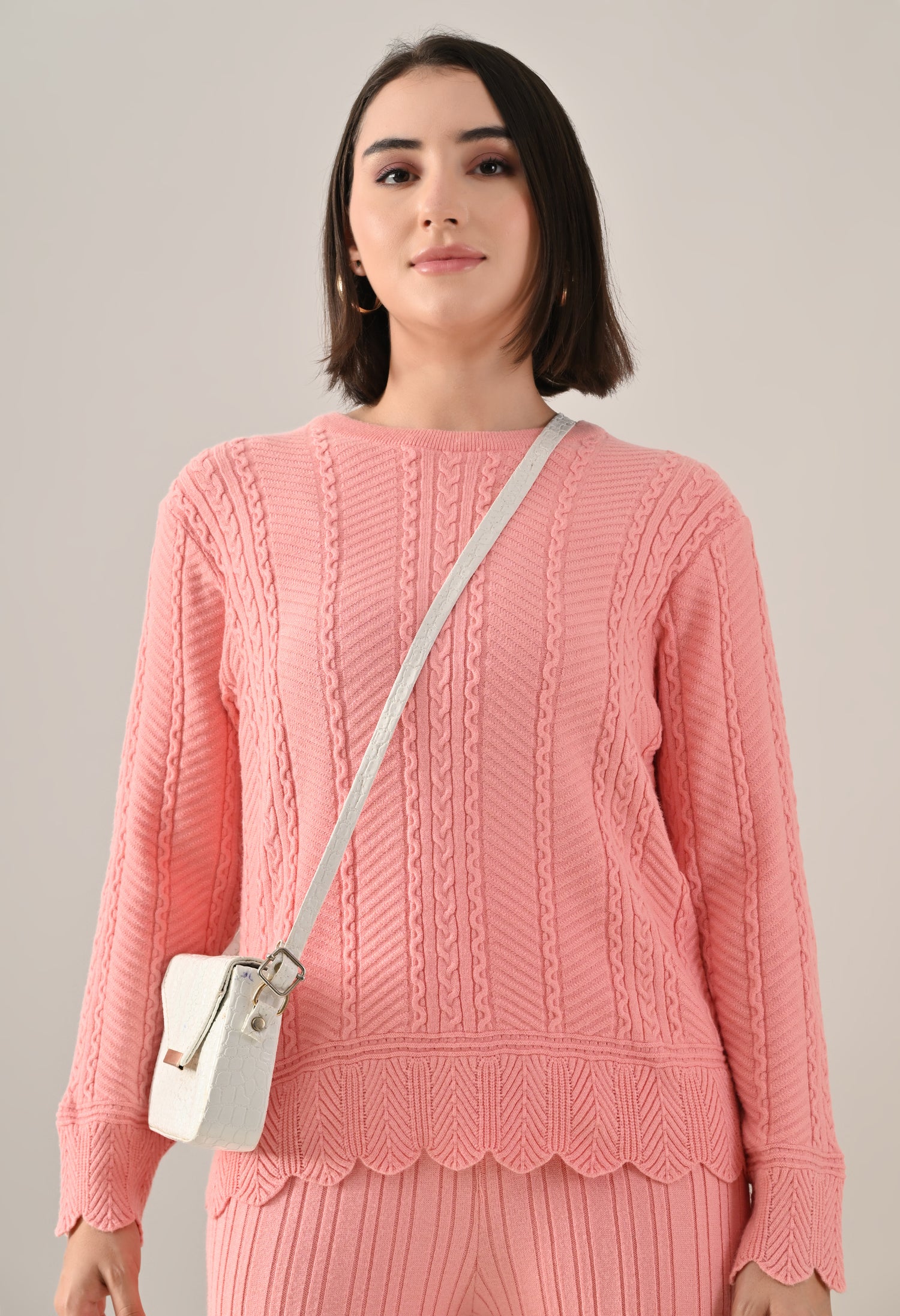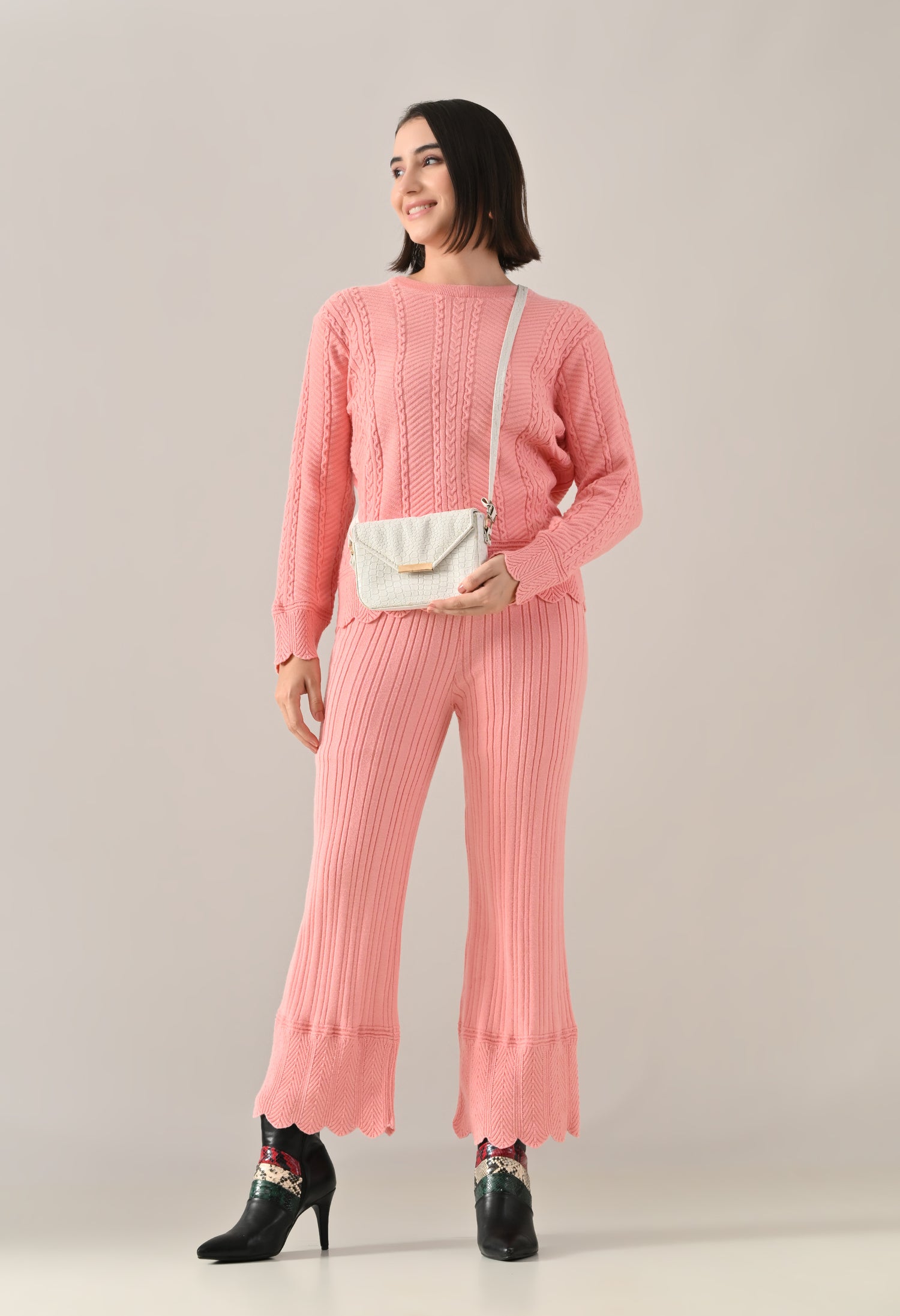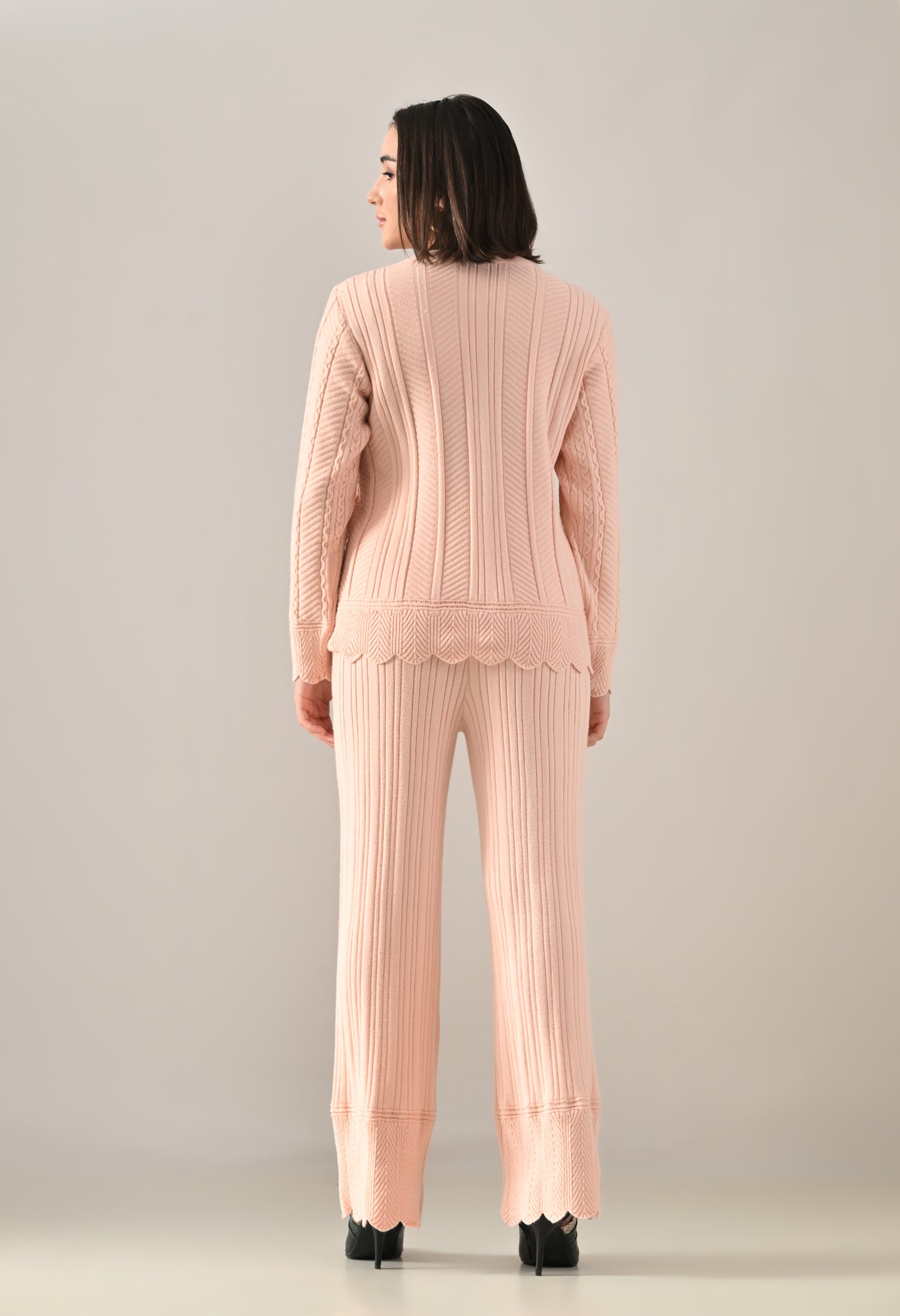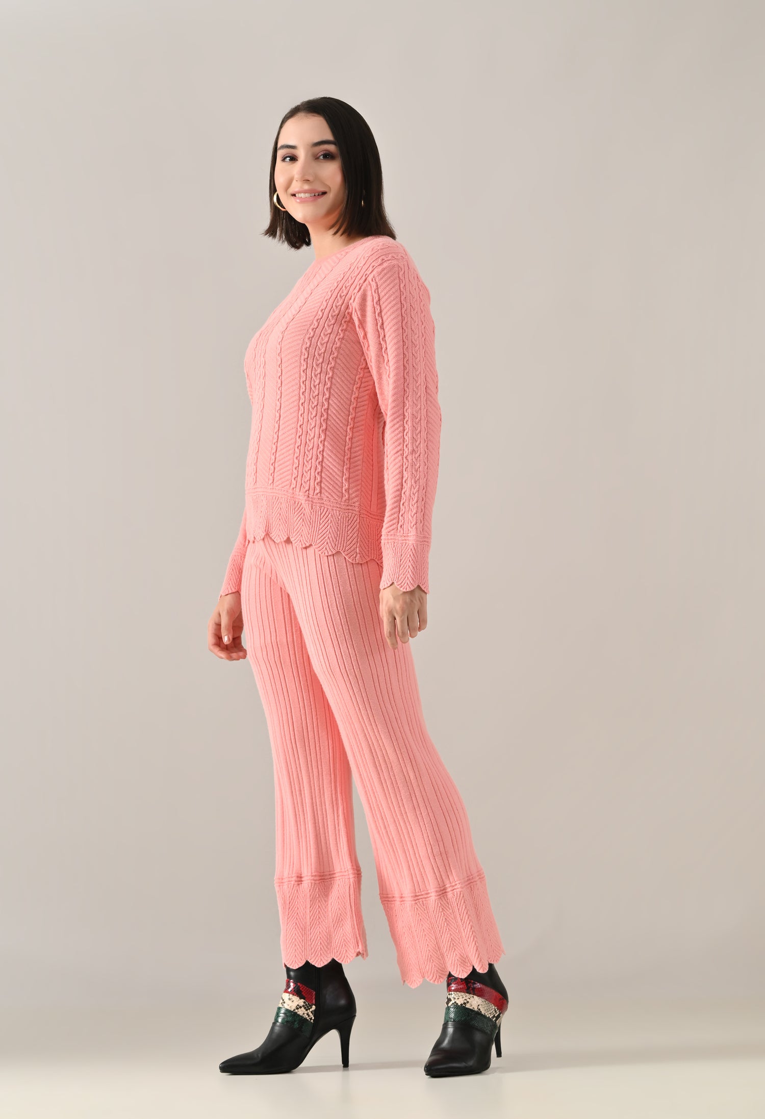 A stylish textured knitted coord set featuring a round neckline with rib detail and regular full sleeves. Designed with scalloped hem and sleeve openings for a delicate, feminine touch. The pants come with a broad elasticated waistline and scalloped leg openings, adding charm and comfort to the look. Made from soft, comfortable, and stretchable fabric, this set blends cozy elegance with effortless everyday style.