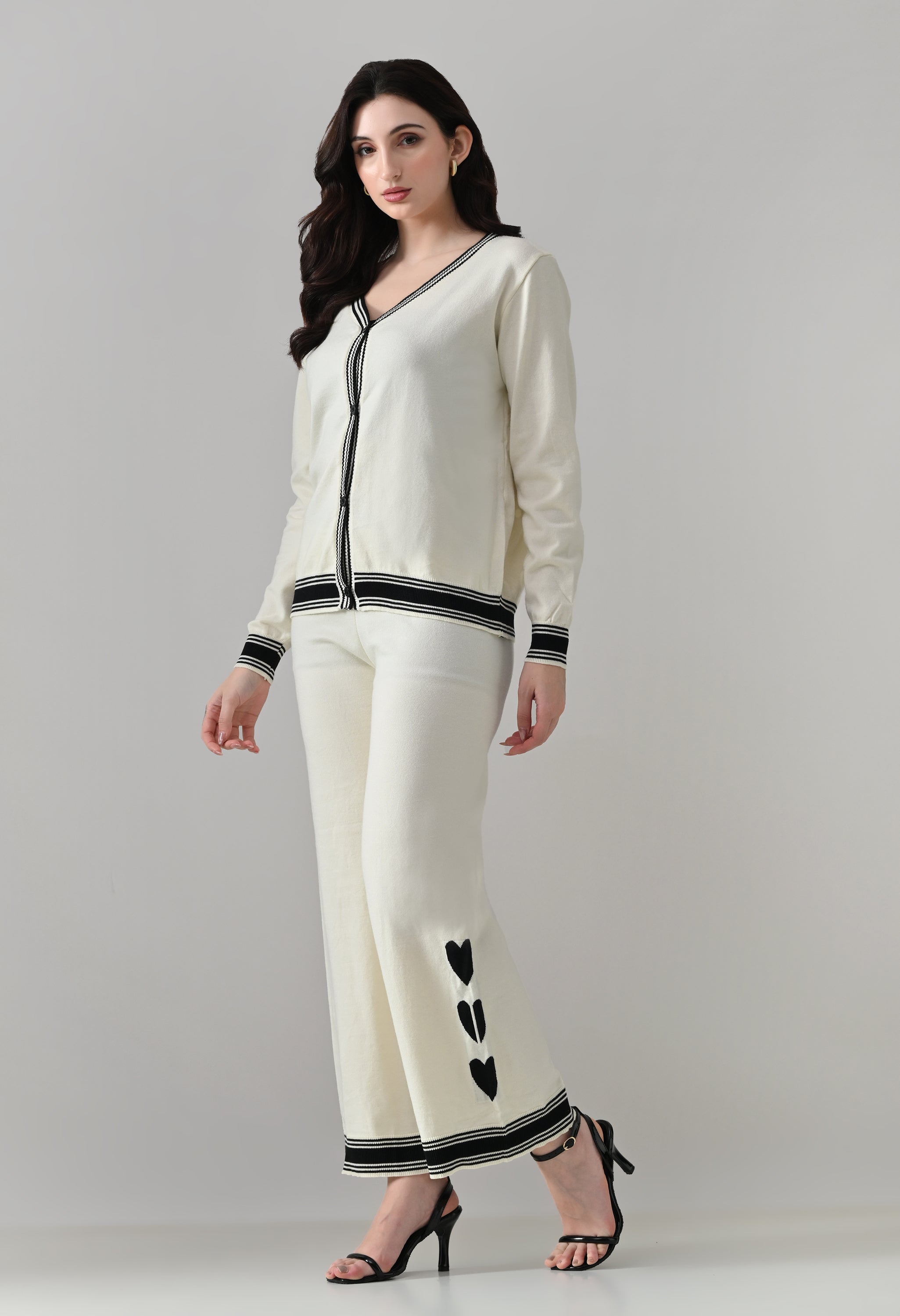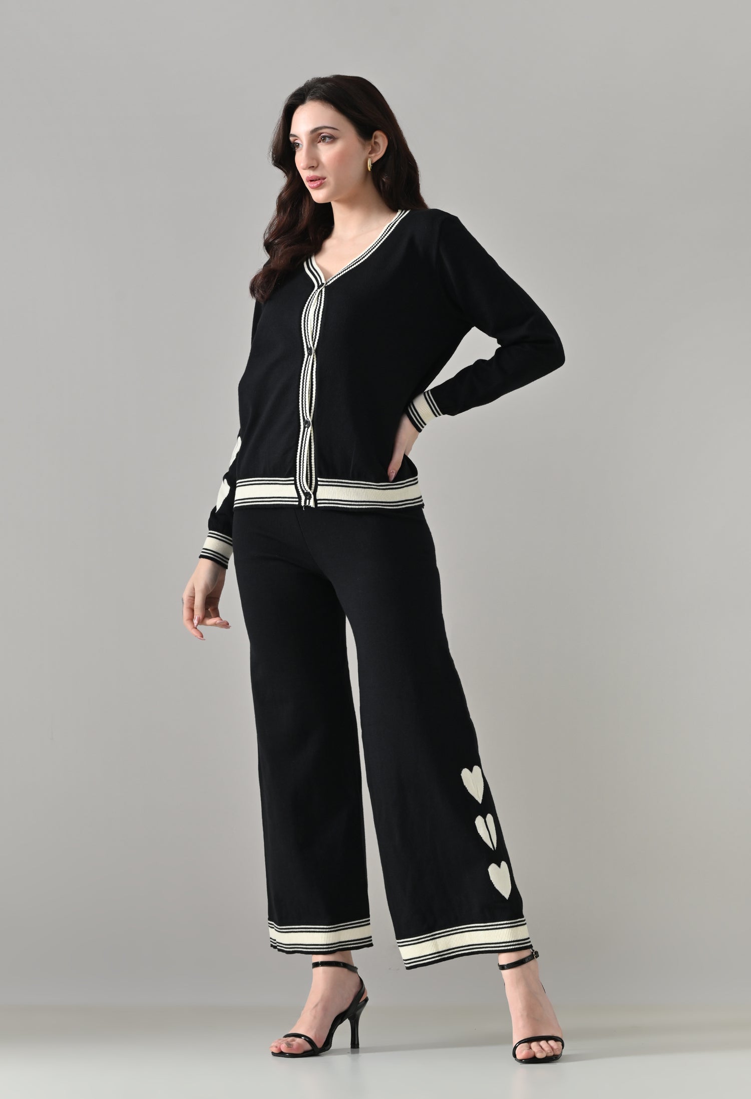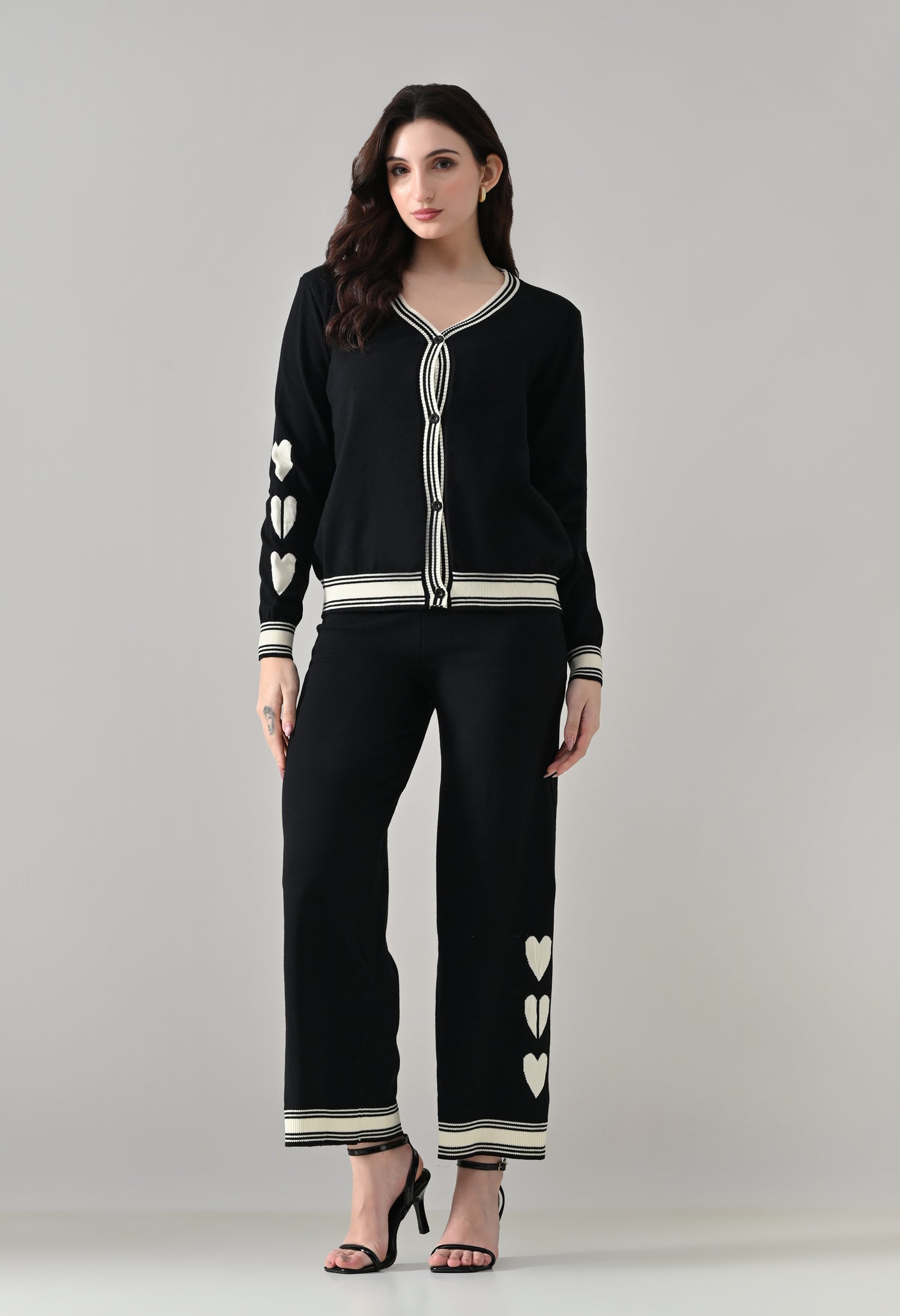 This cozy knit co-ord set features a soft V-neck top with contrast black stripes, a button-down front, and playful heart motifs on the sleeves. The matching straight-fit bottoms include an elasticated waistband, striped hems, and coordinating heart details, creating a comfortable and cute everyday look.