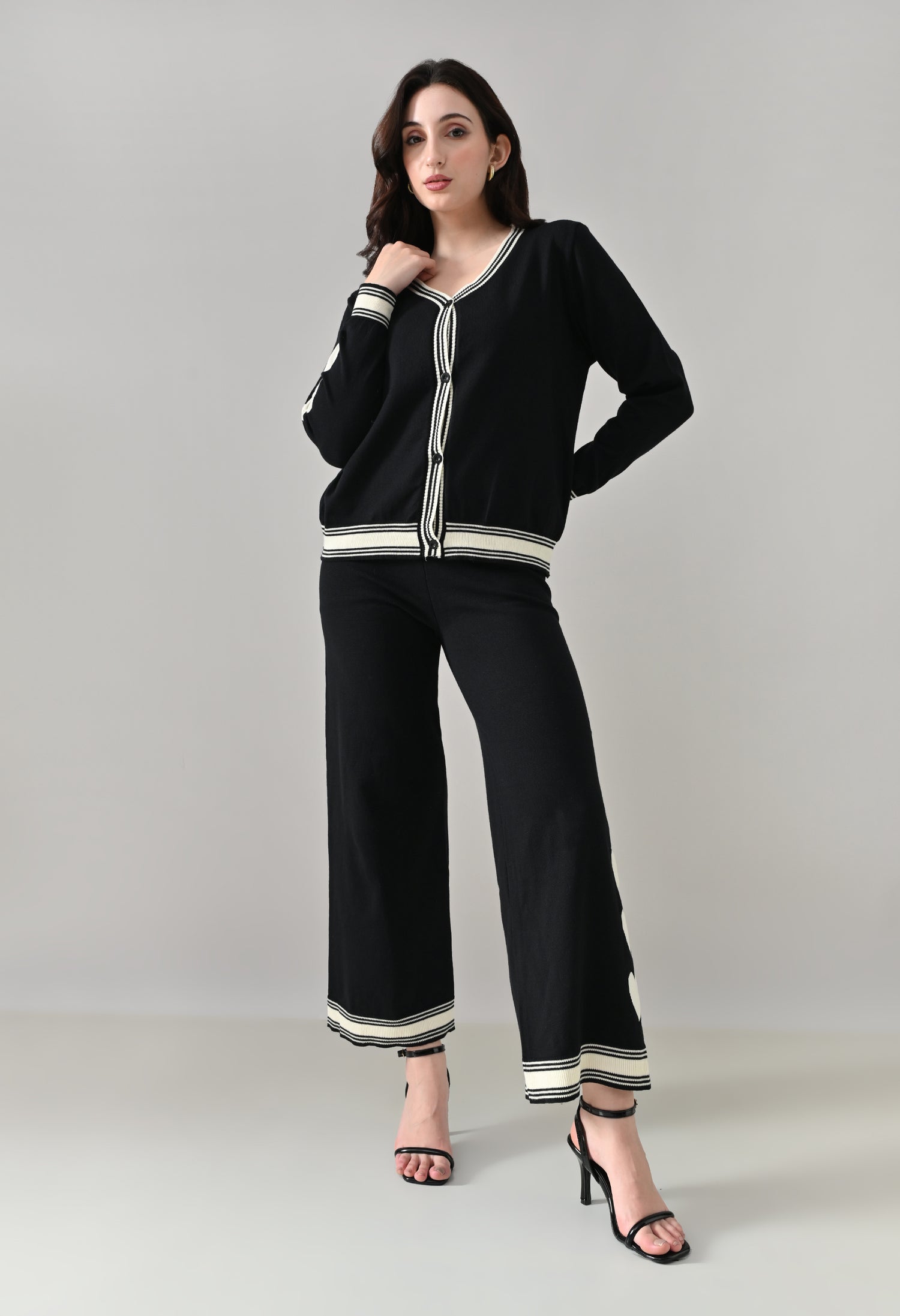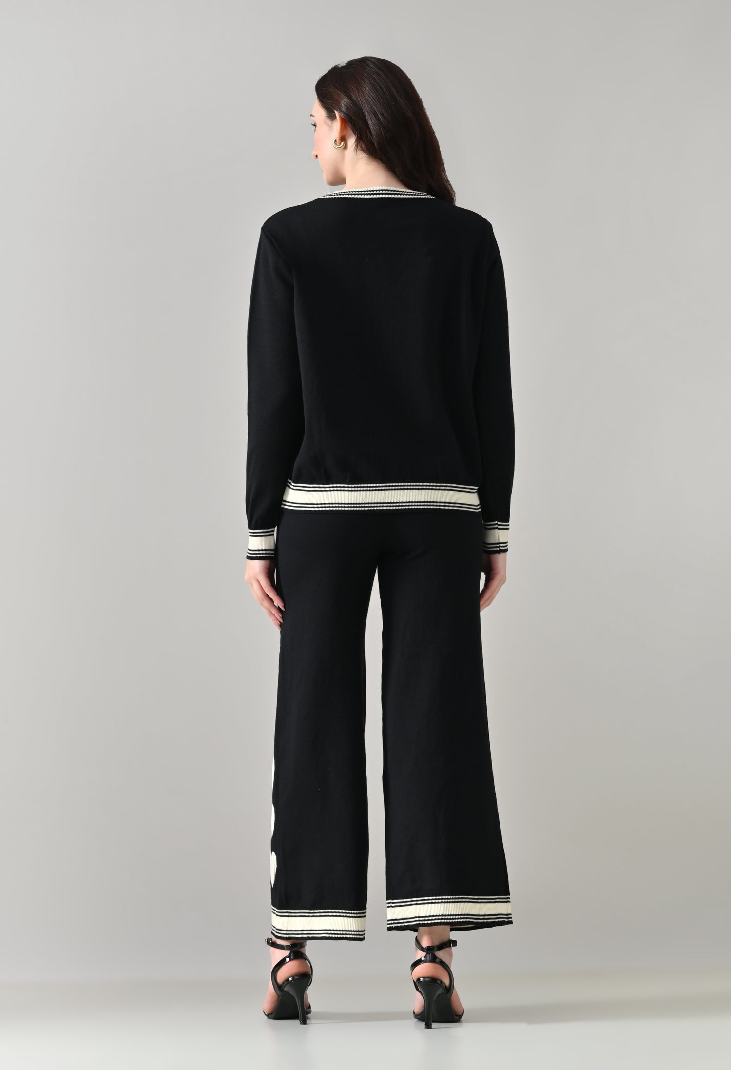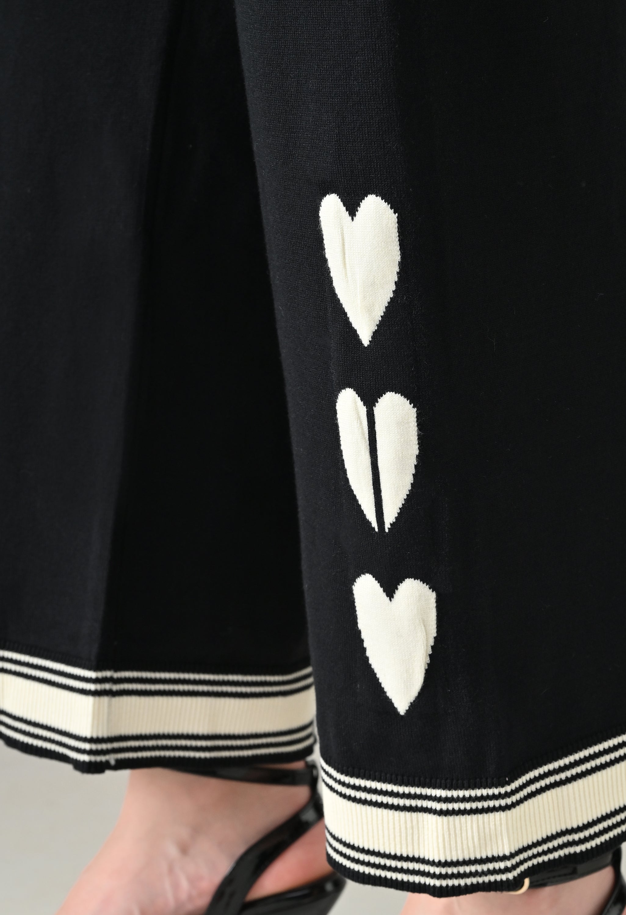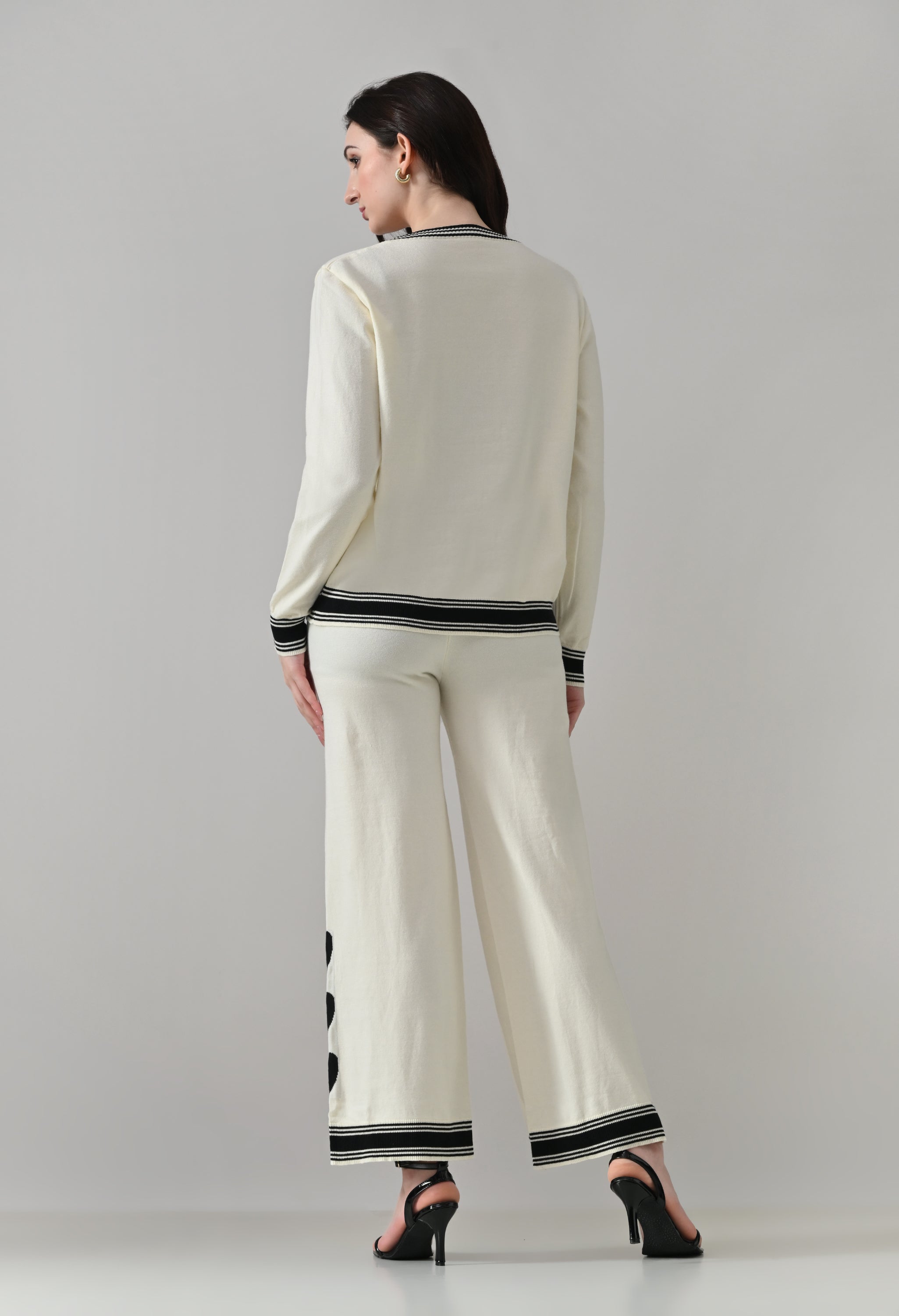 This cozy knit co-ord set features a soft V-neck top with contrast black stripes, a button-down front, and playful heart motifs on the sleeves. The matching straight-fit bottoms include an elasticated waistband, striped hems, and coordinating heart details, creating a comfortable and cute everyday look.