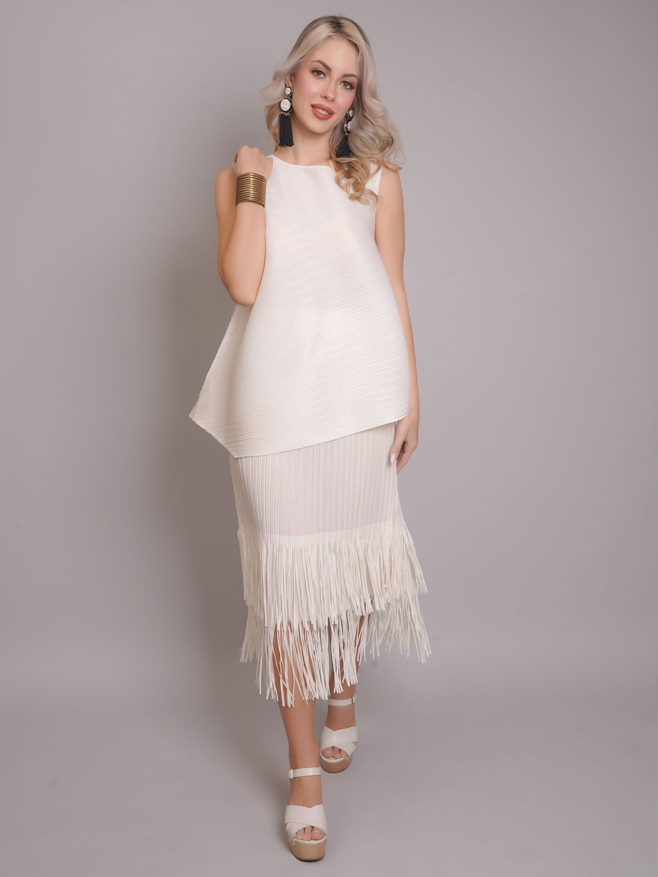 Elevate your wardrobe with this chic two-piece set, featuring an asymmetrical cut-sleeve top and a full-length, flowing tassel skirt. Crafted from non-stretchable fabric, it combines sophistication with a trendy edge—perfect for any evening, party, or casual-chic outing.