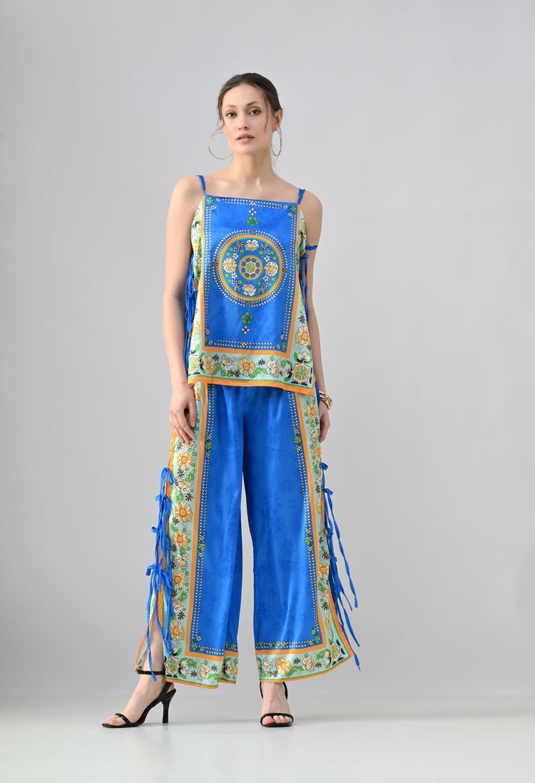 This vibrant two-piece coordinated set is crafted from a smooth, high-shine satin-like fabric in a striking azure blue. The set features a bohemian-inspired floral and geometric border print in contrasting shades of marigold orange and soft green. The top is a sleeveless camisole style with a square neckline and thin, adjustable shoulder straps for a customized fit. Both the top and the wide-leg trousers are designed with a unique, open-side construction, featuring multiple functional tie-up closures that run down the length of the garment. This breezy, skin-baring design combined with the ornate border print makes it an ideal statement piece for tropical vacations or elevated summer lounging.