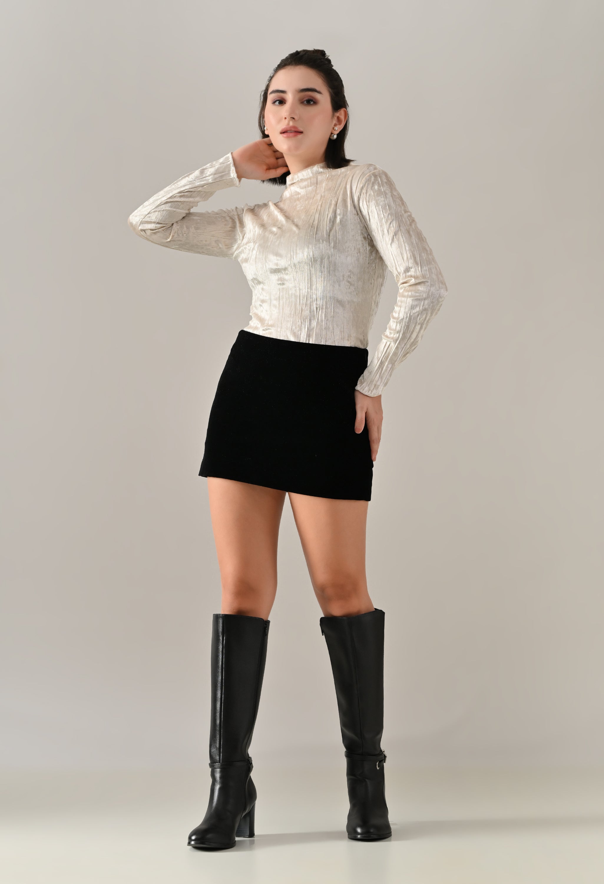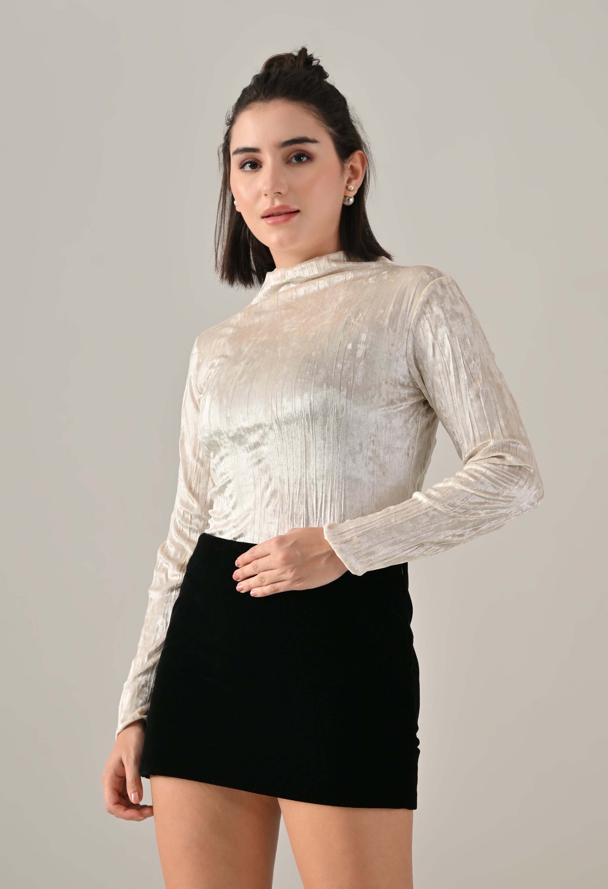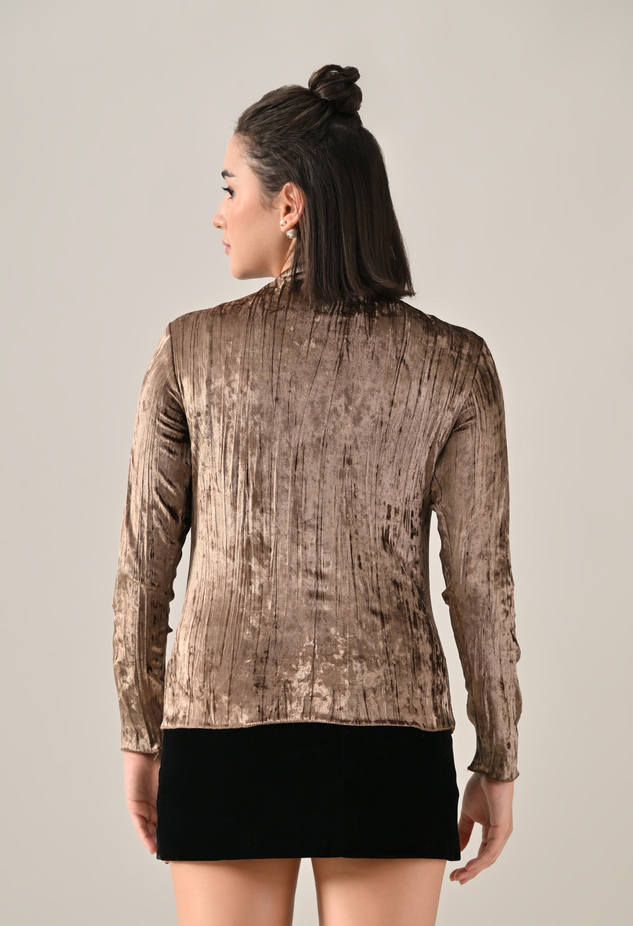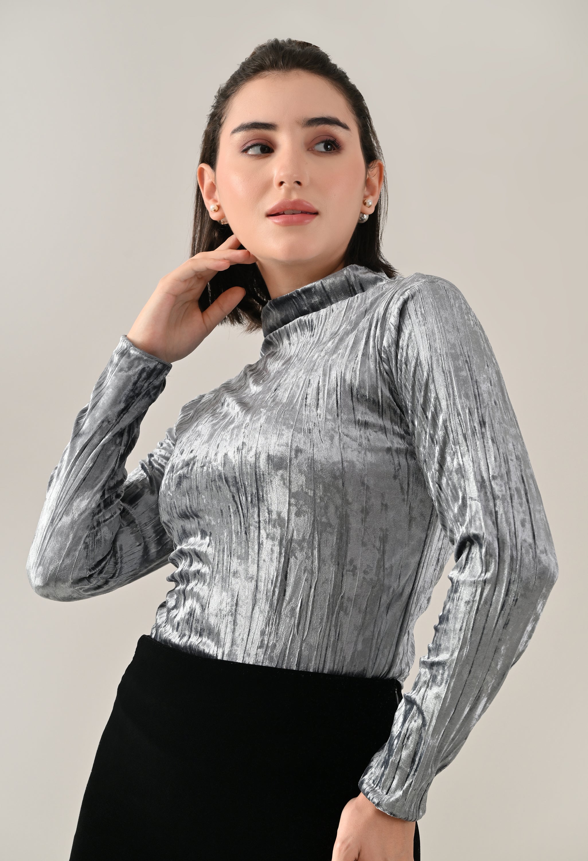 Stay effortlessly stylish with this solid velvet top featuring a high neckline and long fitted sleeves. Designed with baby overlock detailing at the hem and sleeve openings, it adds a subtle touch of texture to the classic silhouette. The regular hem and soft, stretchable crush velvet fabric ensure a cozy and comfortable fit, making it perfect for both casual outings and relaxed days.